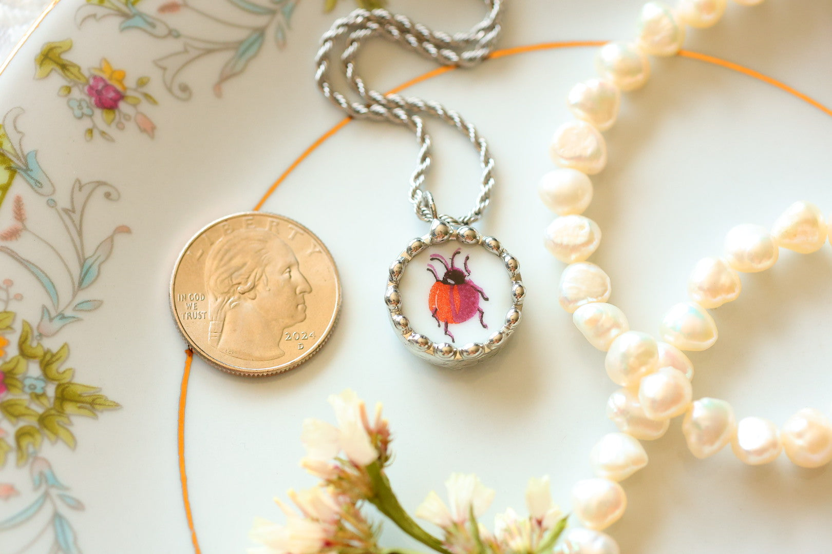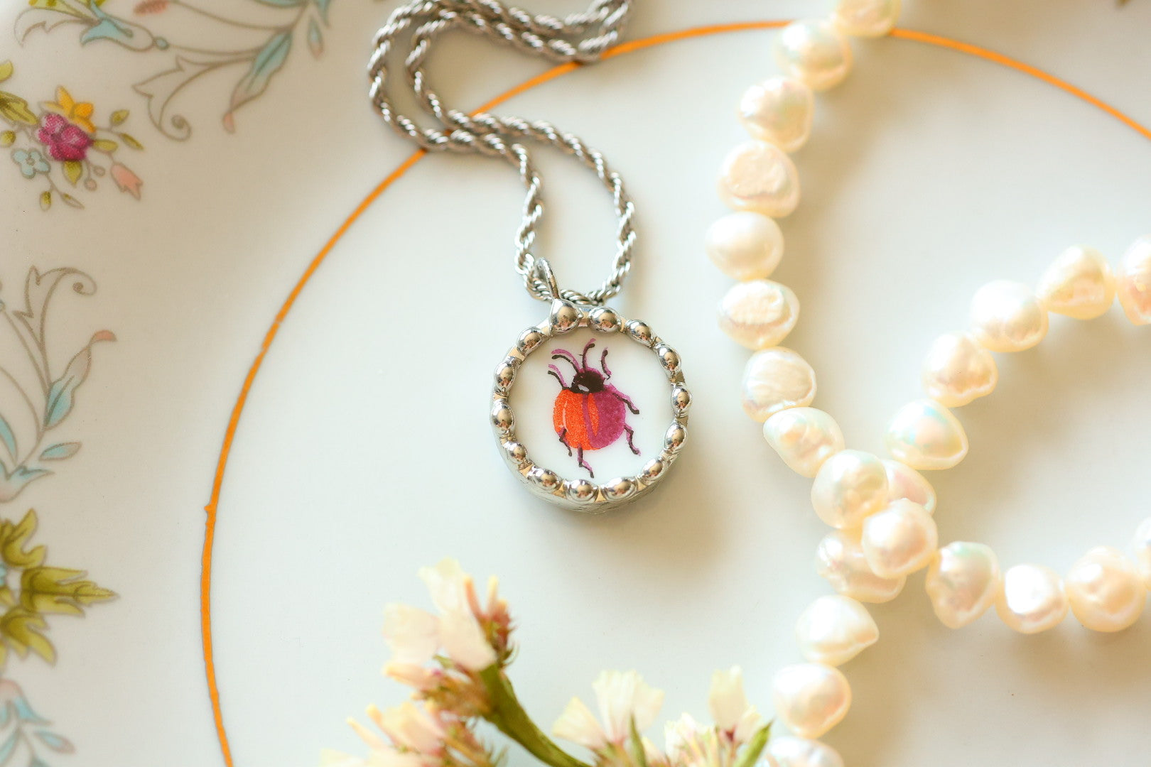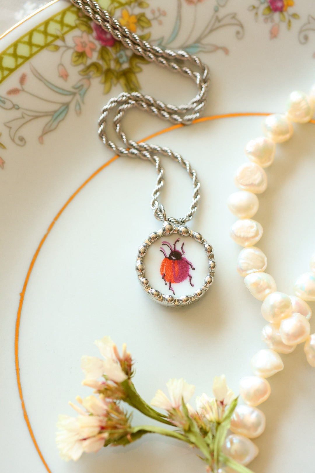 Please remember that these jewelry pieces are made from a unique and unusual medium—vintage dishware. With this, there can be curves and varied thicknesses throughout a single piece.