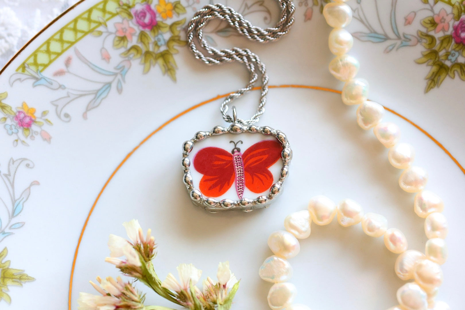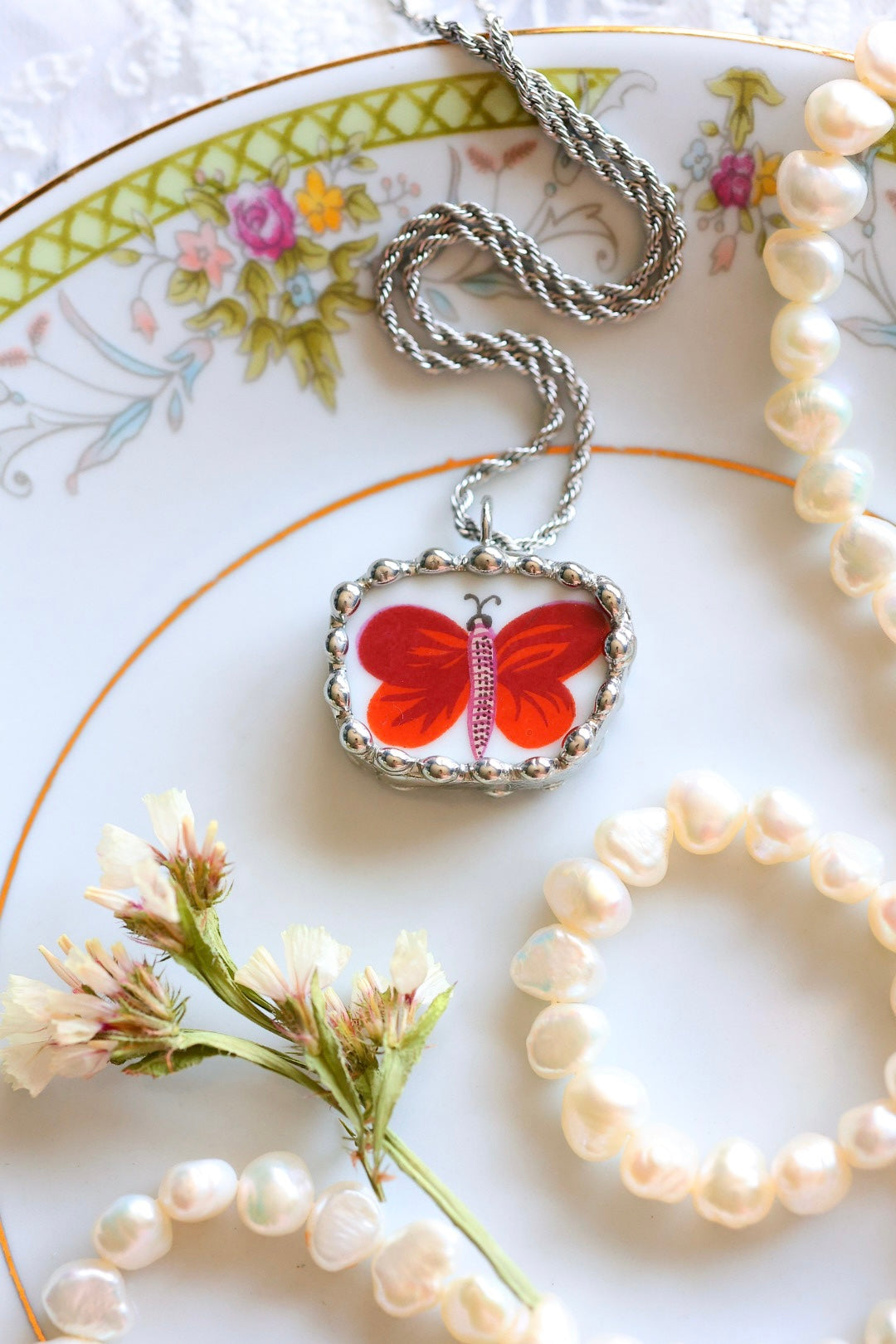 Please remember that these jewelry pieces are made from a unique and unusual medium—vintage dishware. With this, there can be curves and varied thicknesses throughout a single piece.