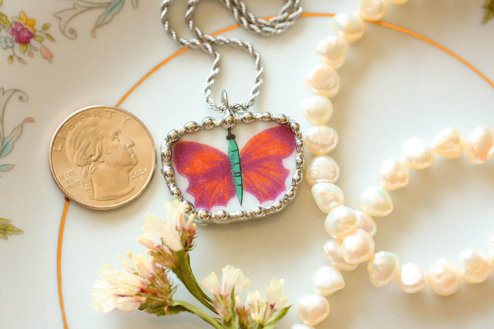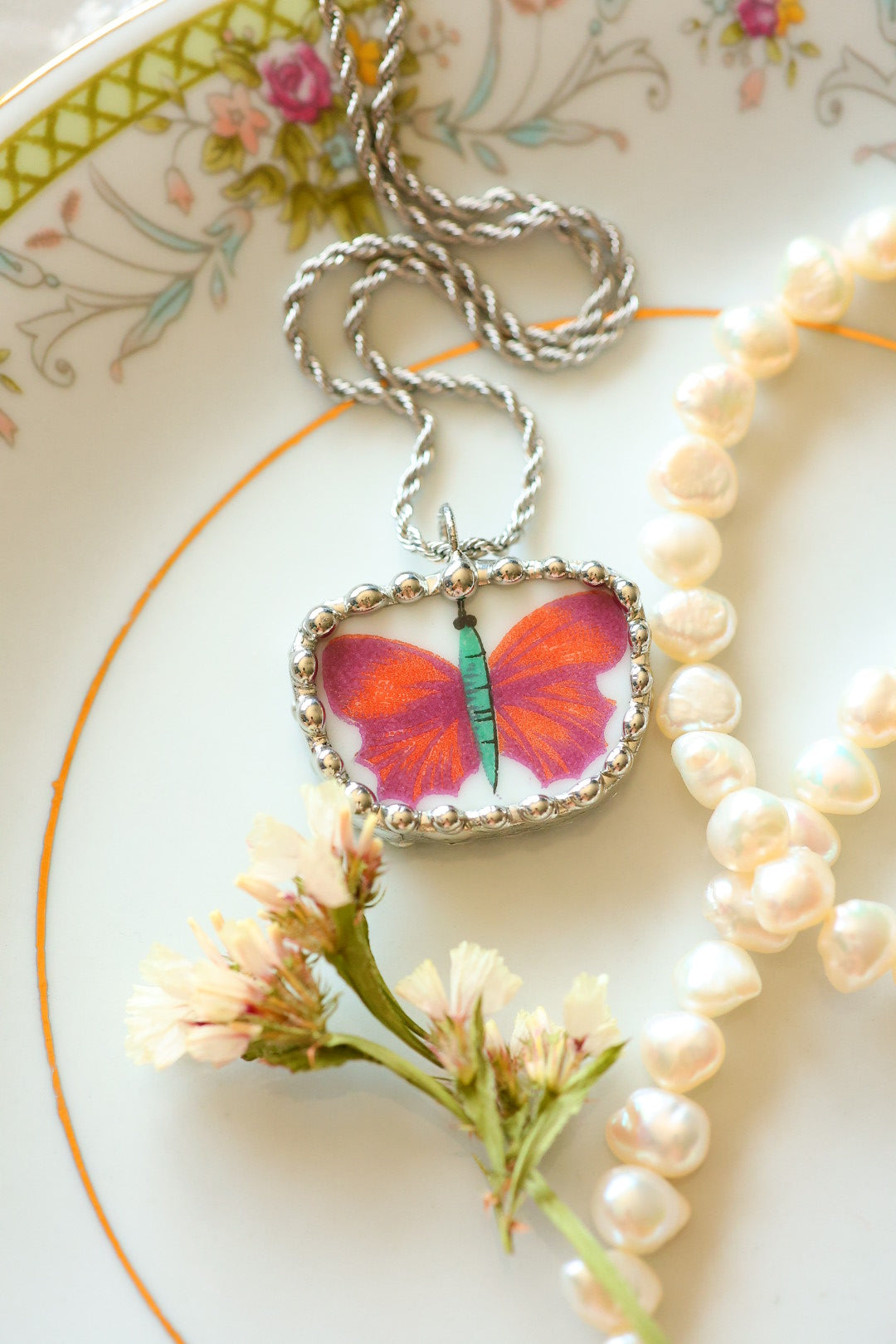 Please remember that these jewelry pieces are made from a unique and unusual medium—vintage dishware. With this, there can be curves and varied thicknesses throughout a single piece.