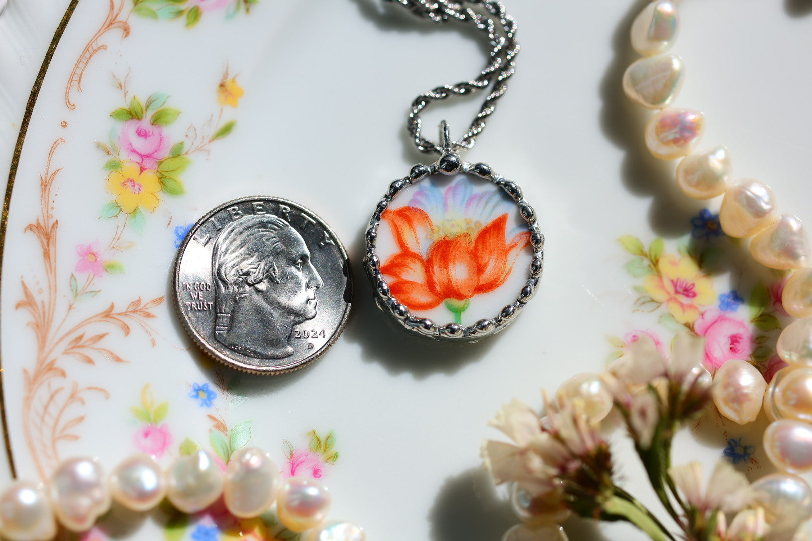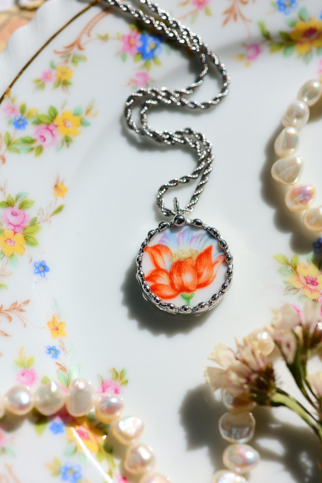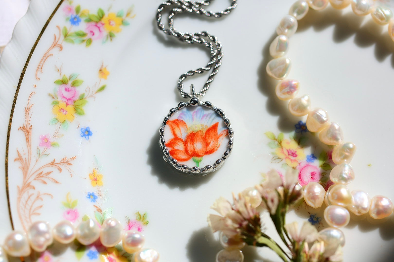 Please remember that these jewelry pieces are made from a unique and unusual medium—vintage dishware. With this, there can be curves and varied thicknesses throughout a single piece.