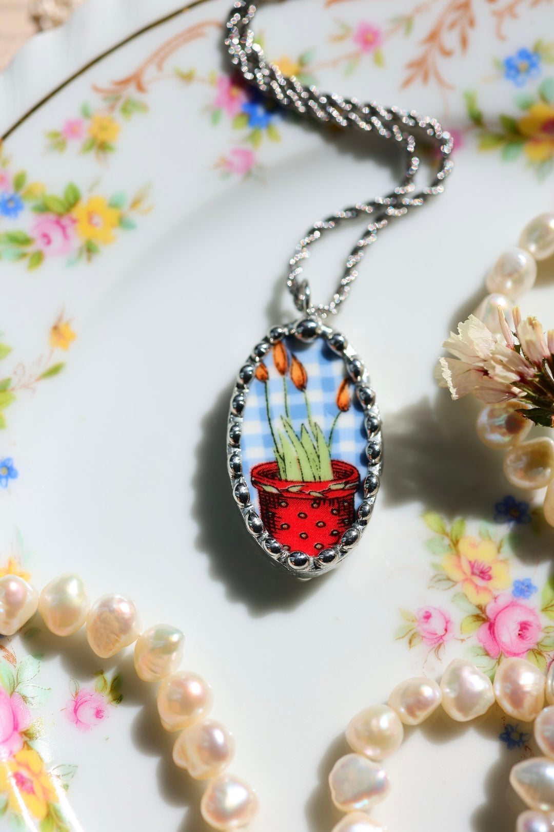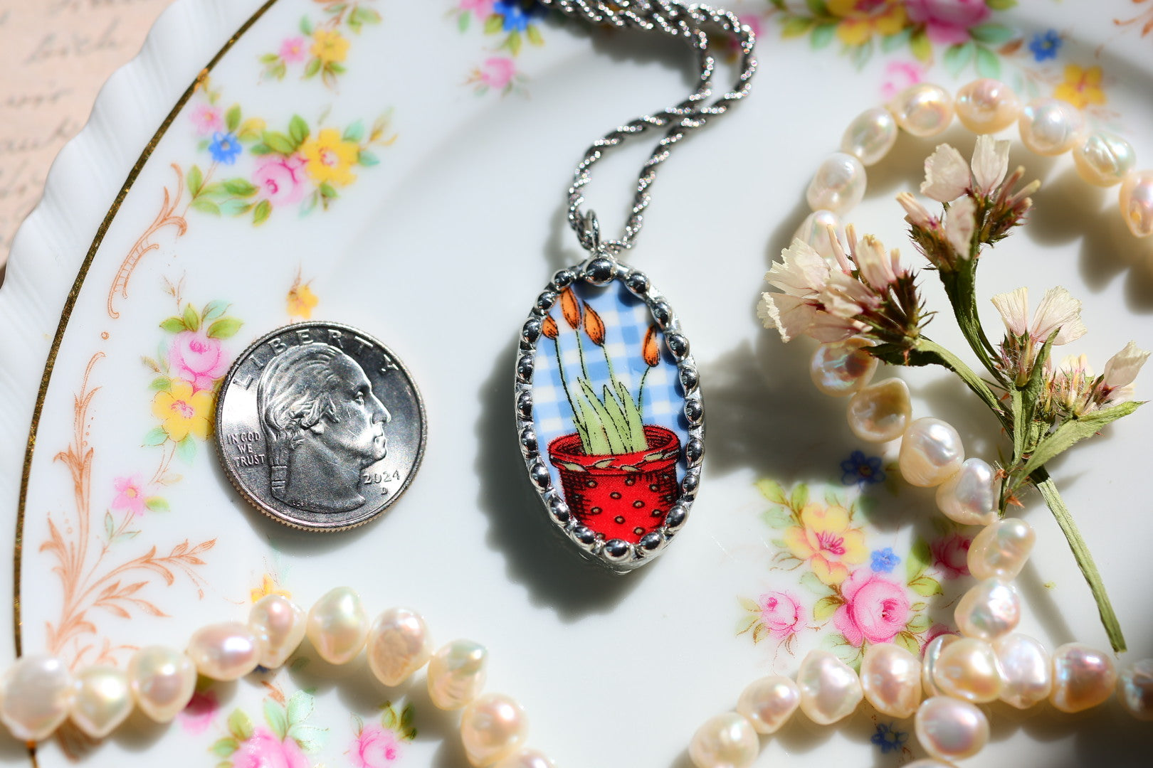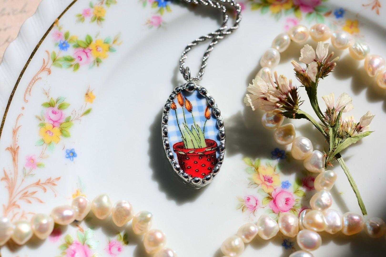 Please remember that these jewelry pieces are made from a unique and unusual medium—vintage dishware. With this, there can be curves and varied thicknesses throughout a single piece.