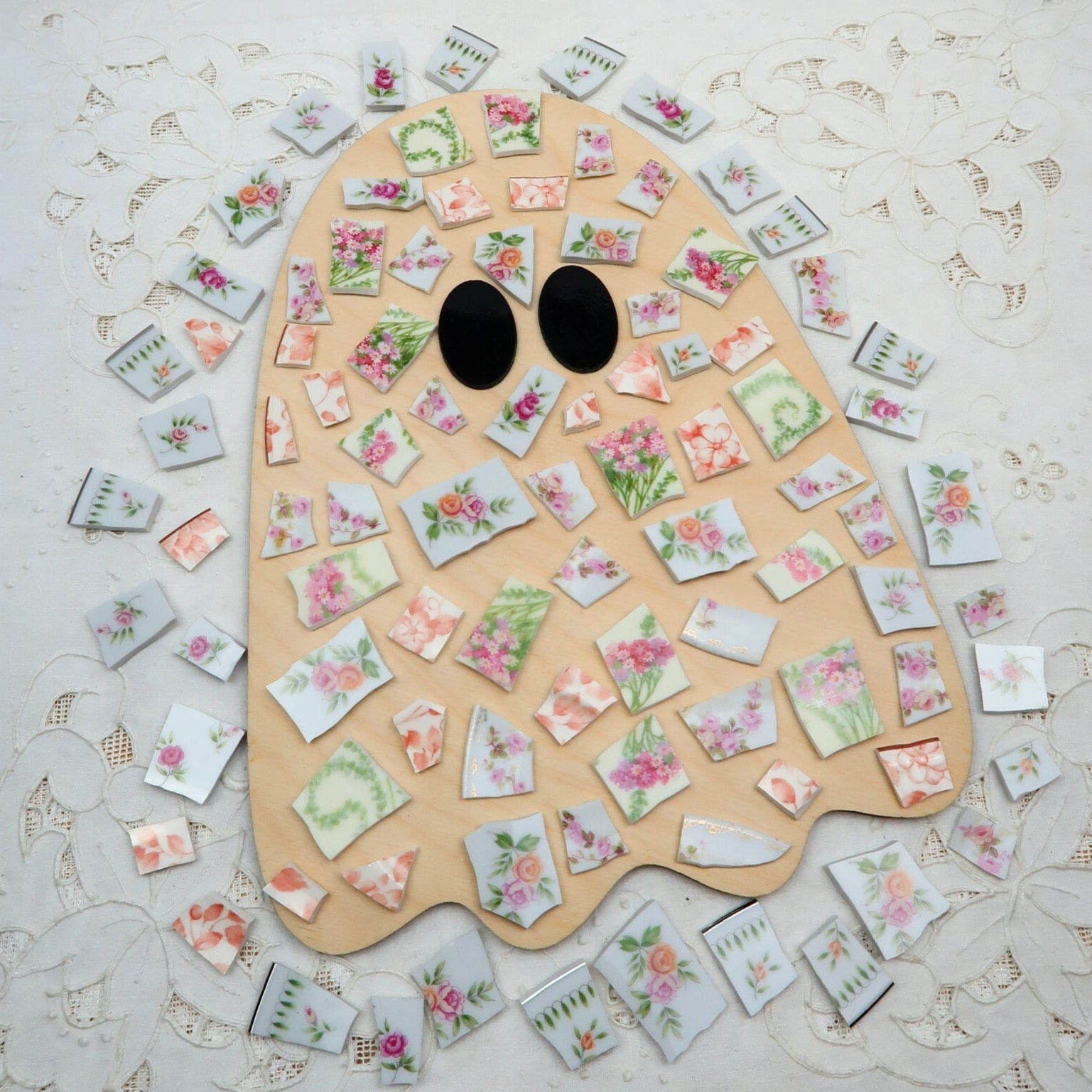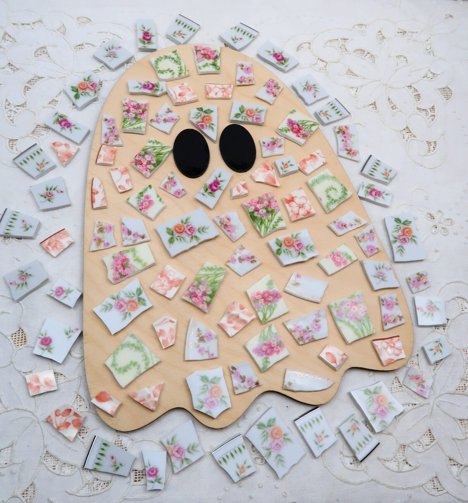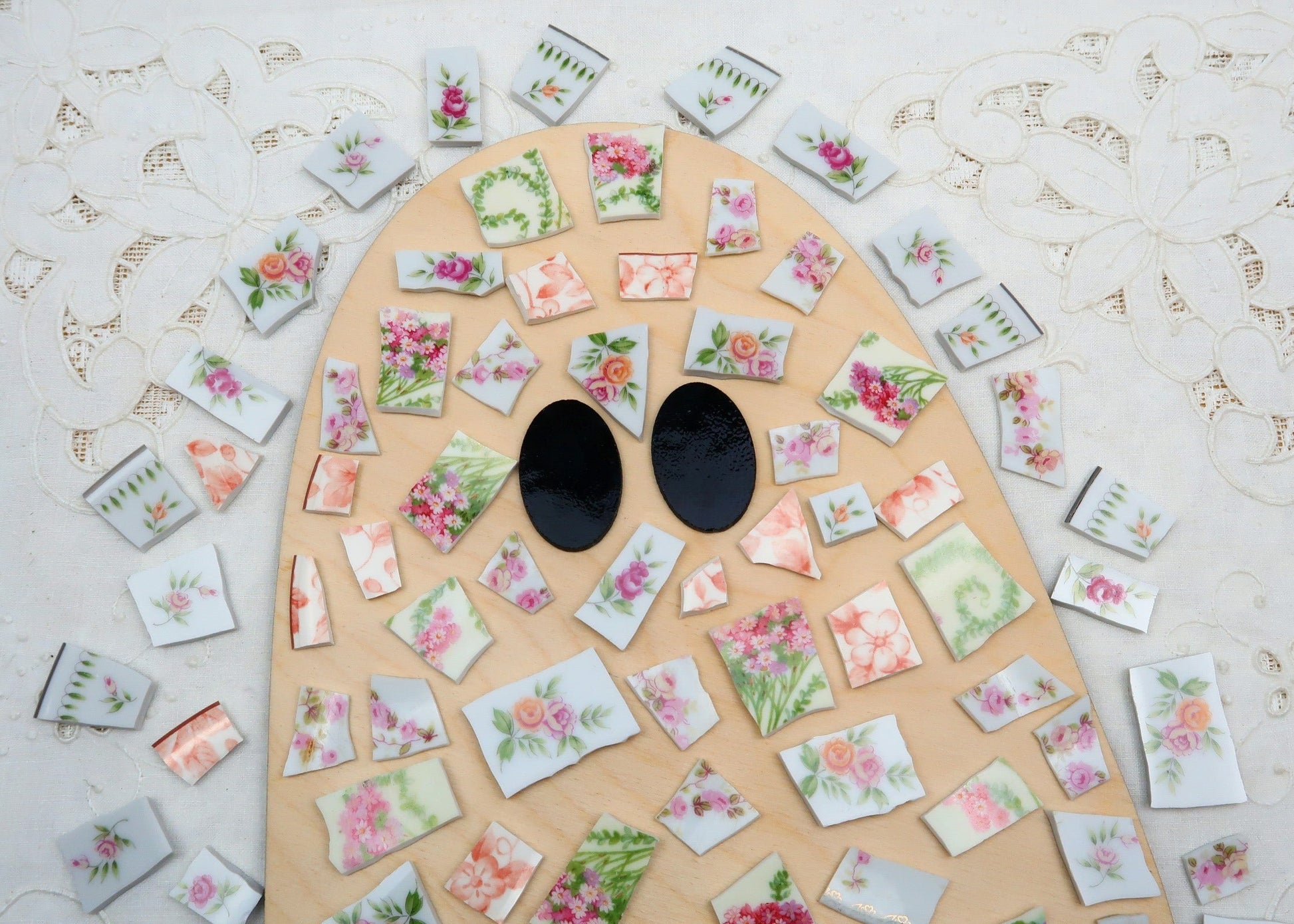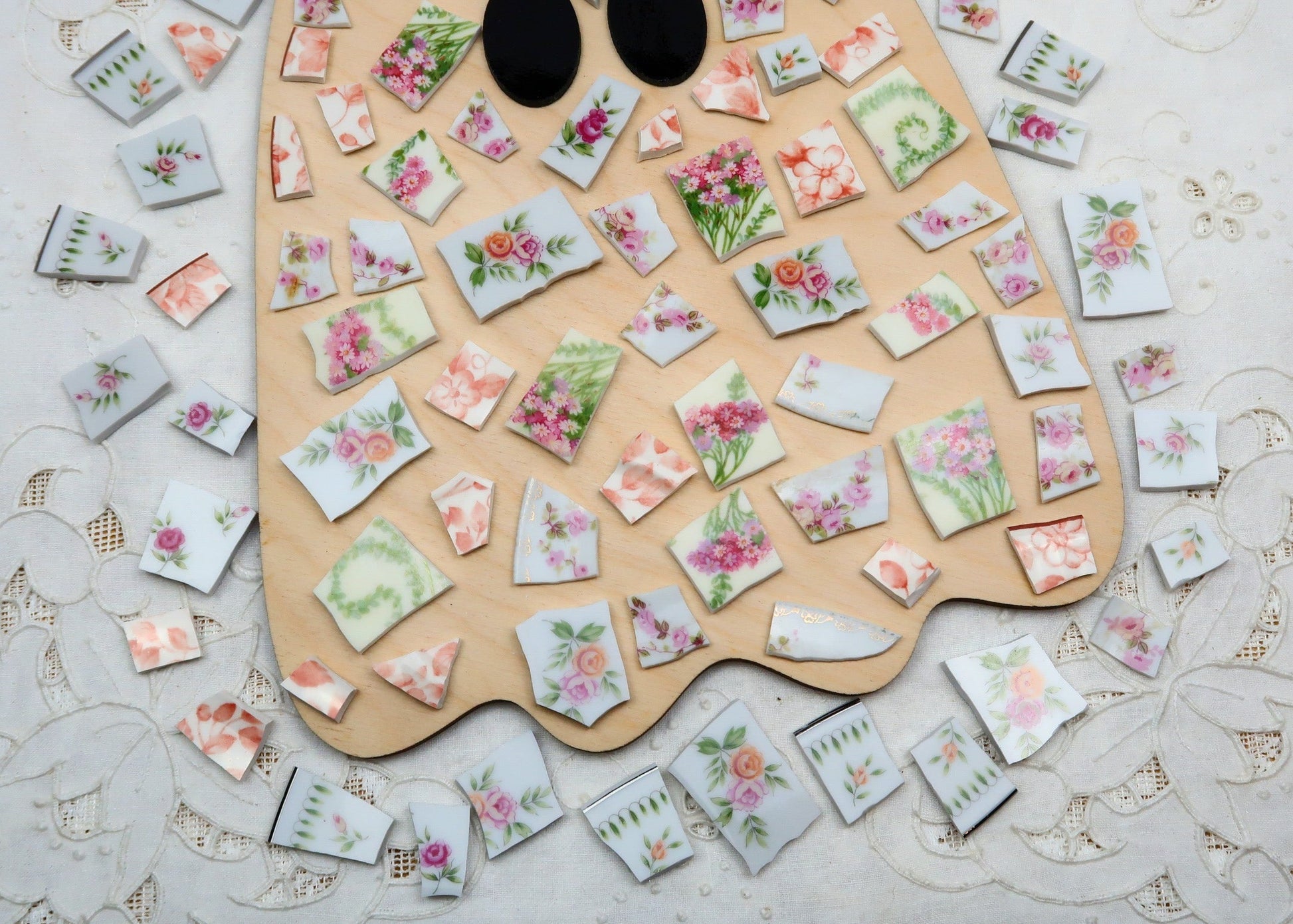 - A hand-selected assortment of broken china Poetic Mosaic tiles