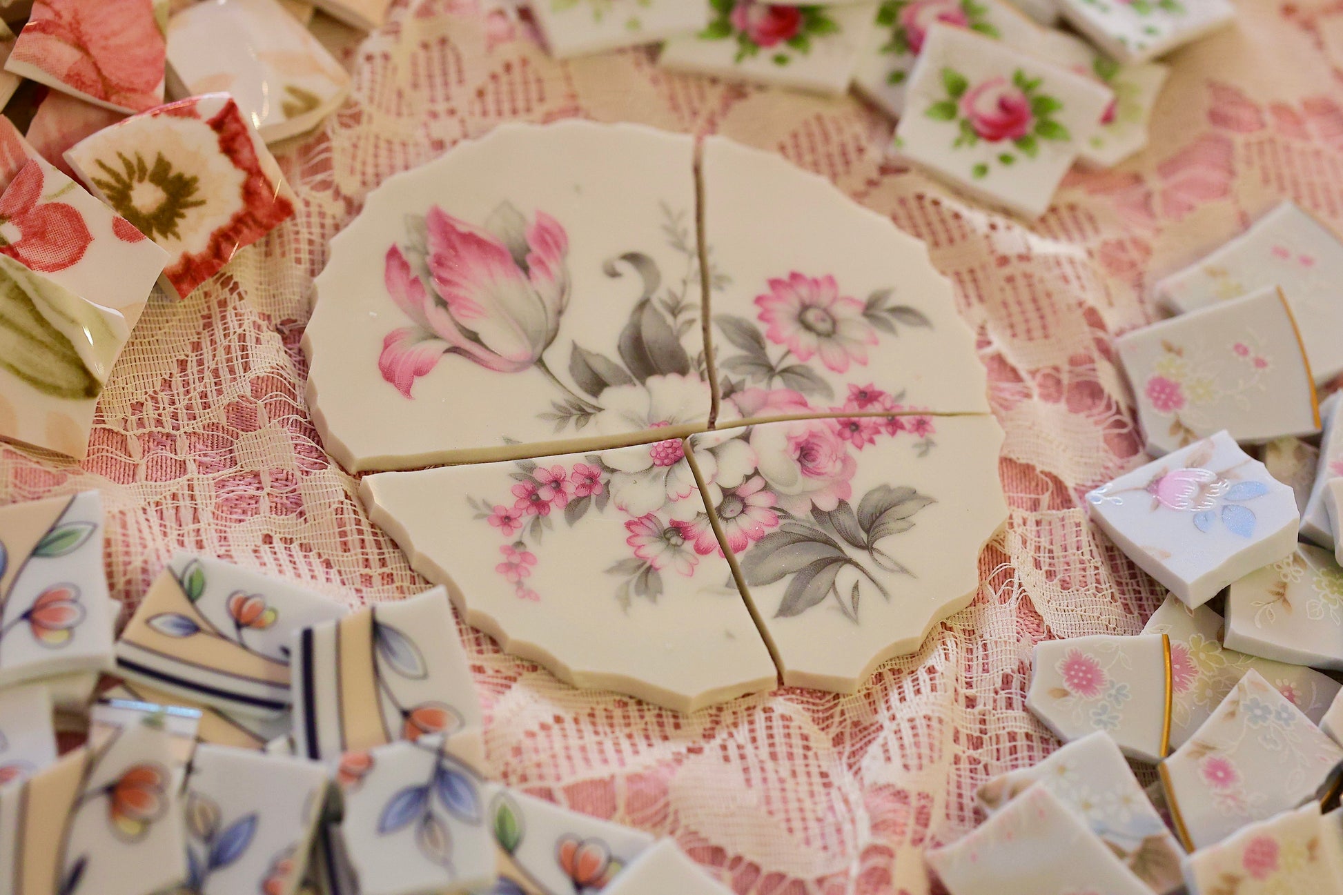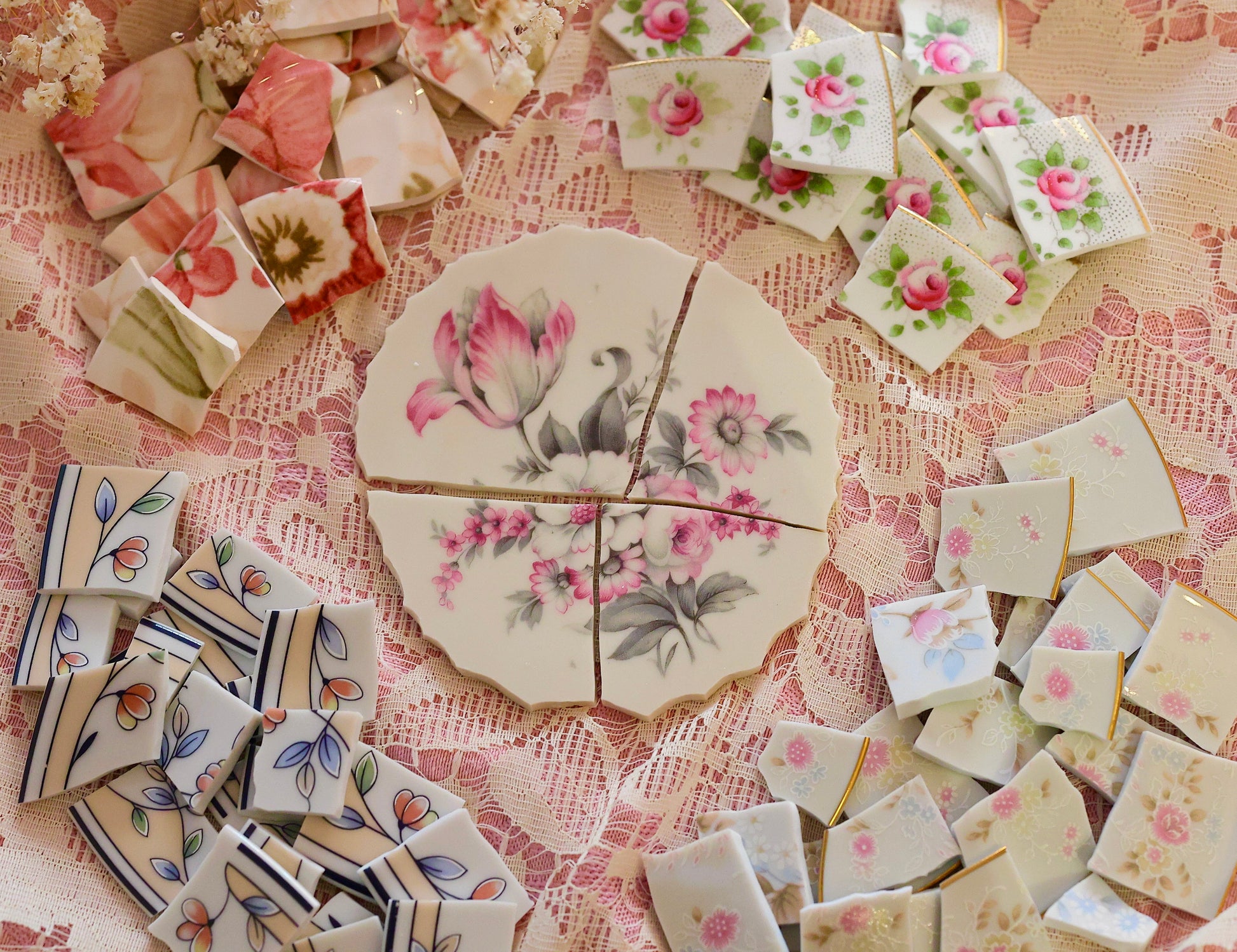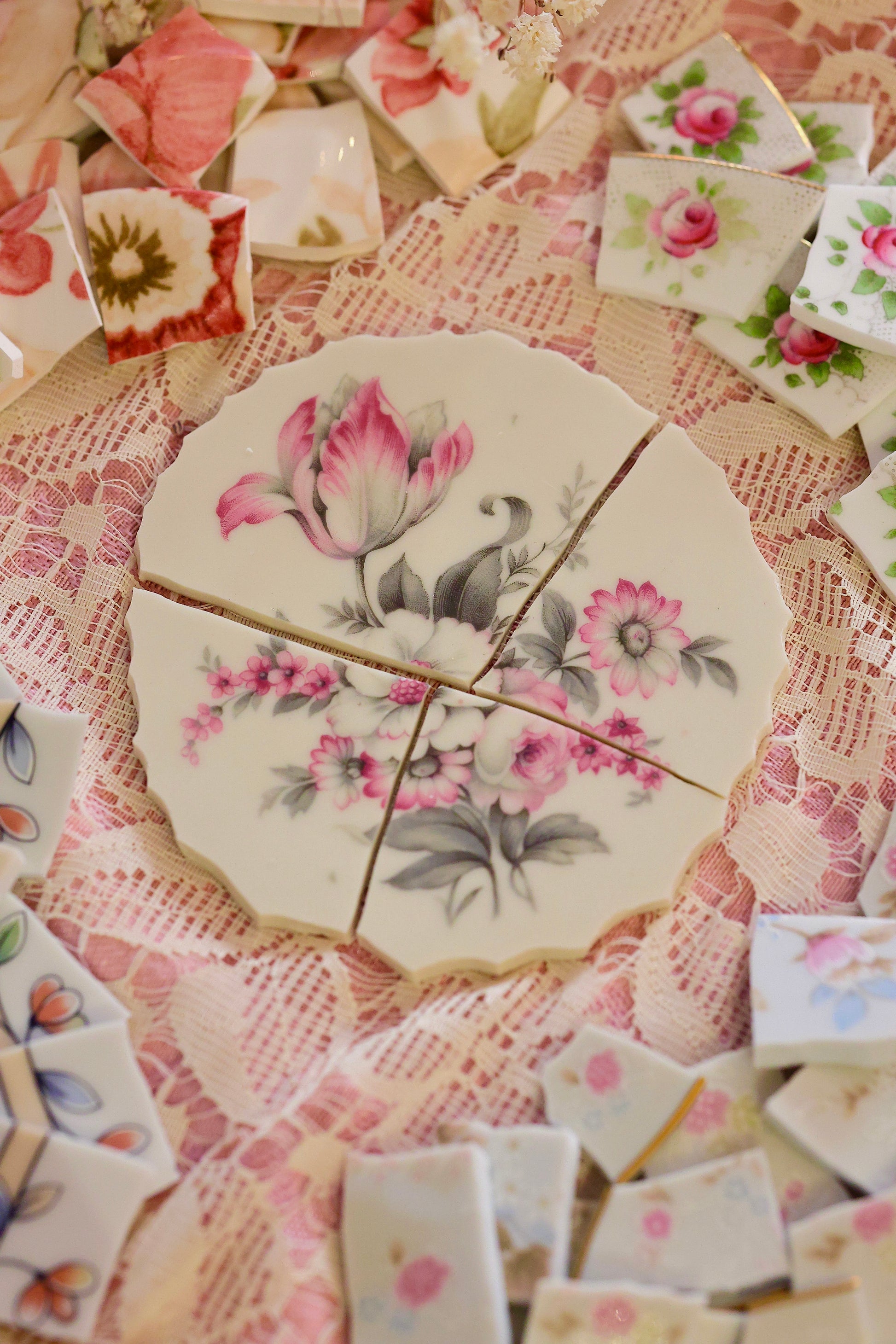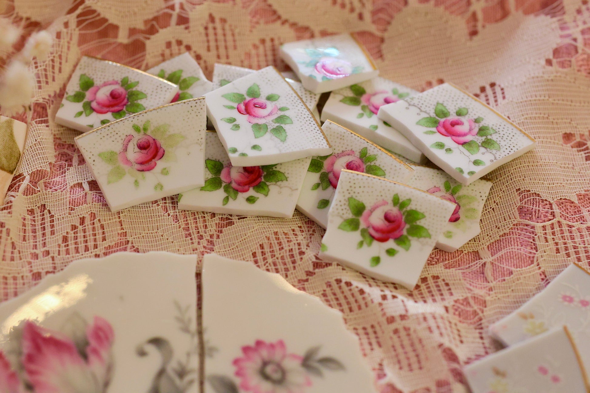 - A hand-selected assortment of broken china Poetic Mosaic tiles