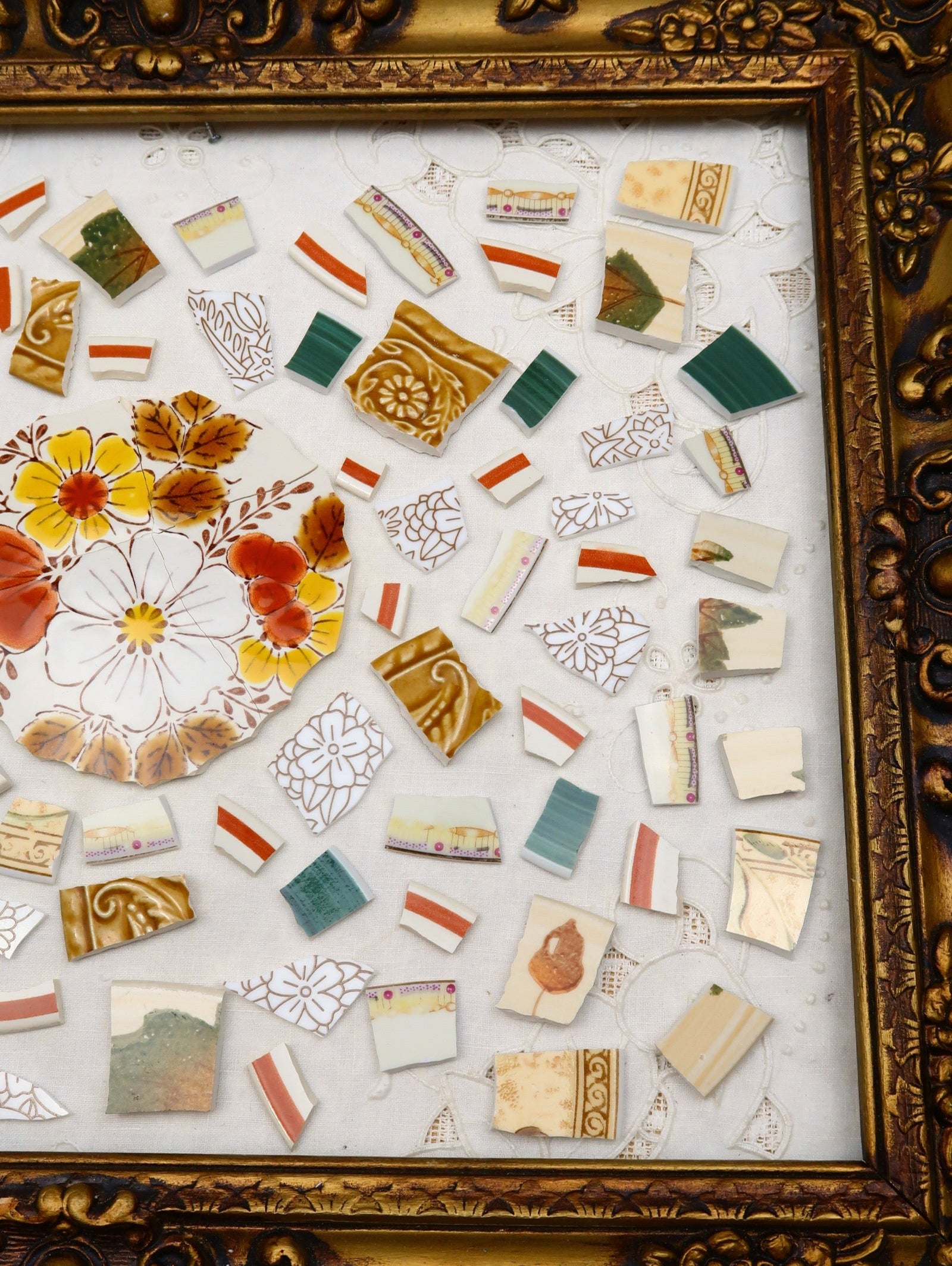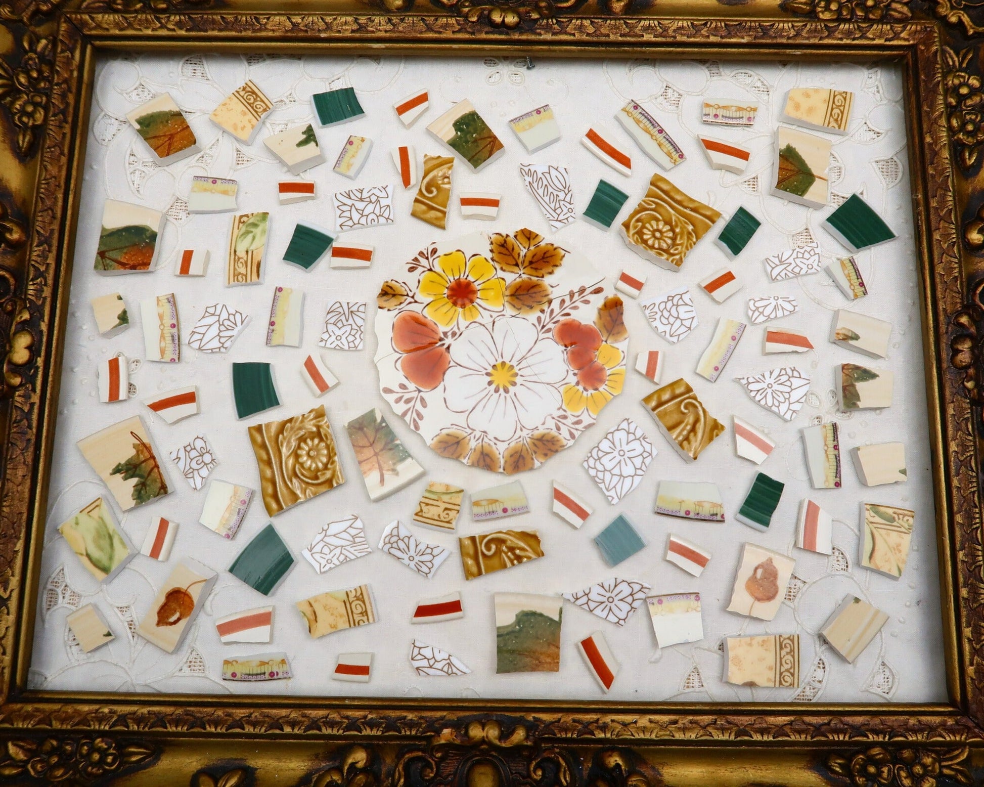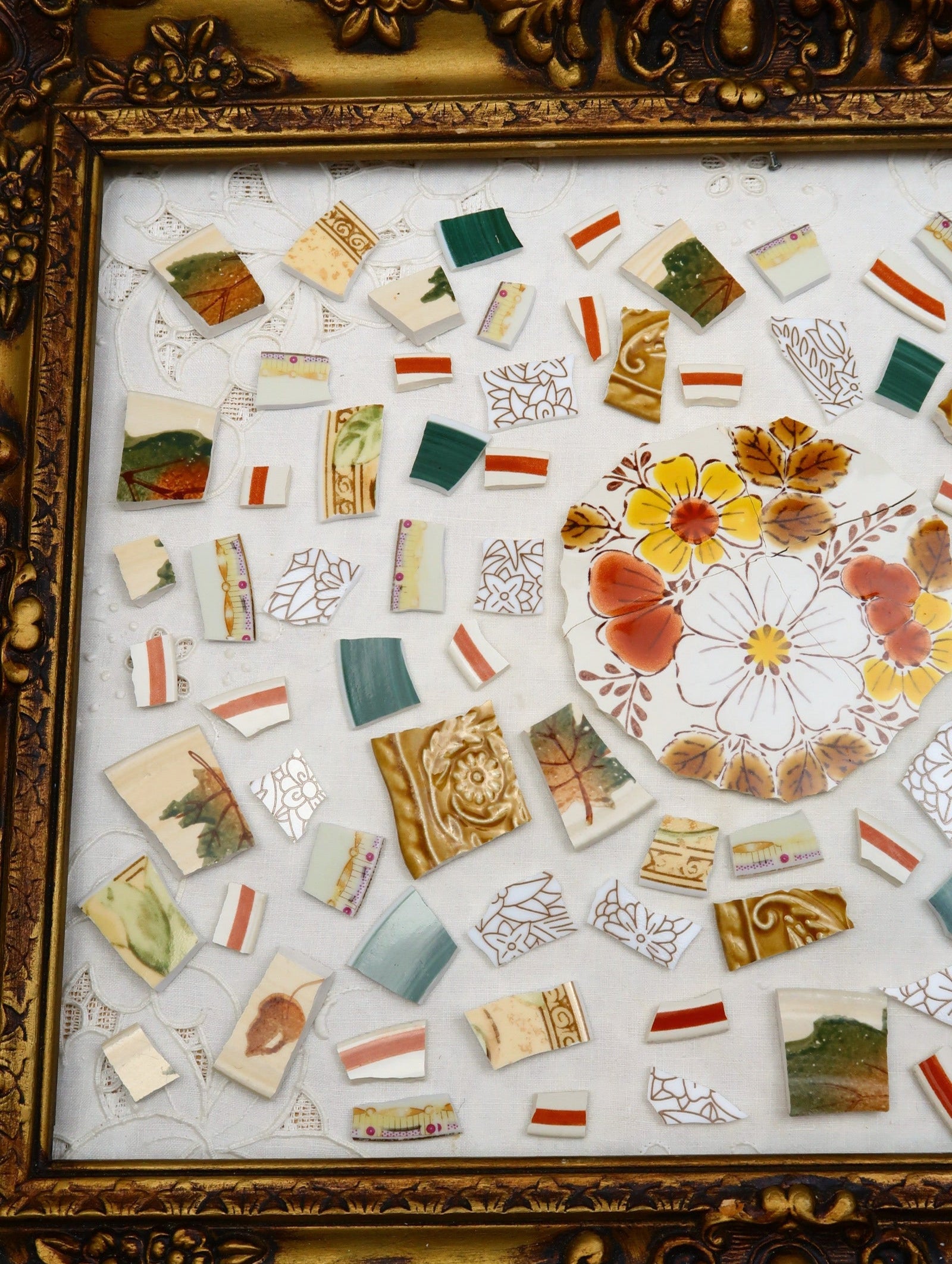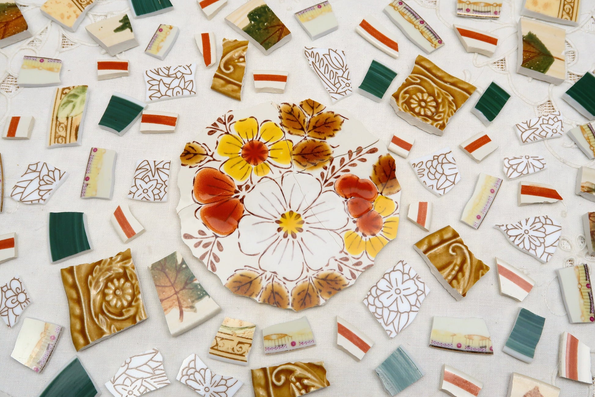 - A hand-selected assortment of broken china Poetic Mosaic tiles