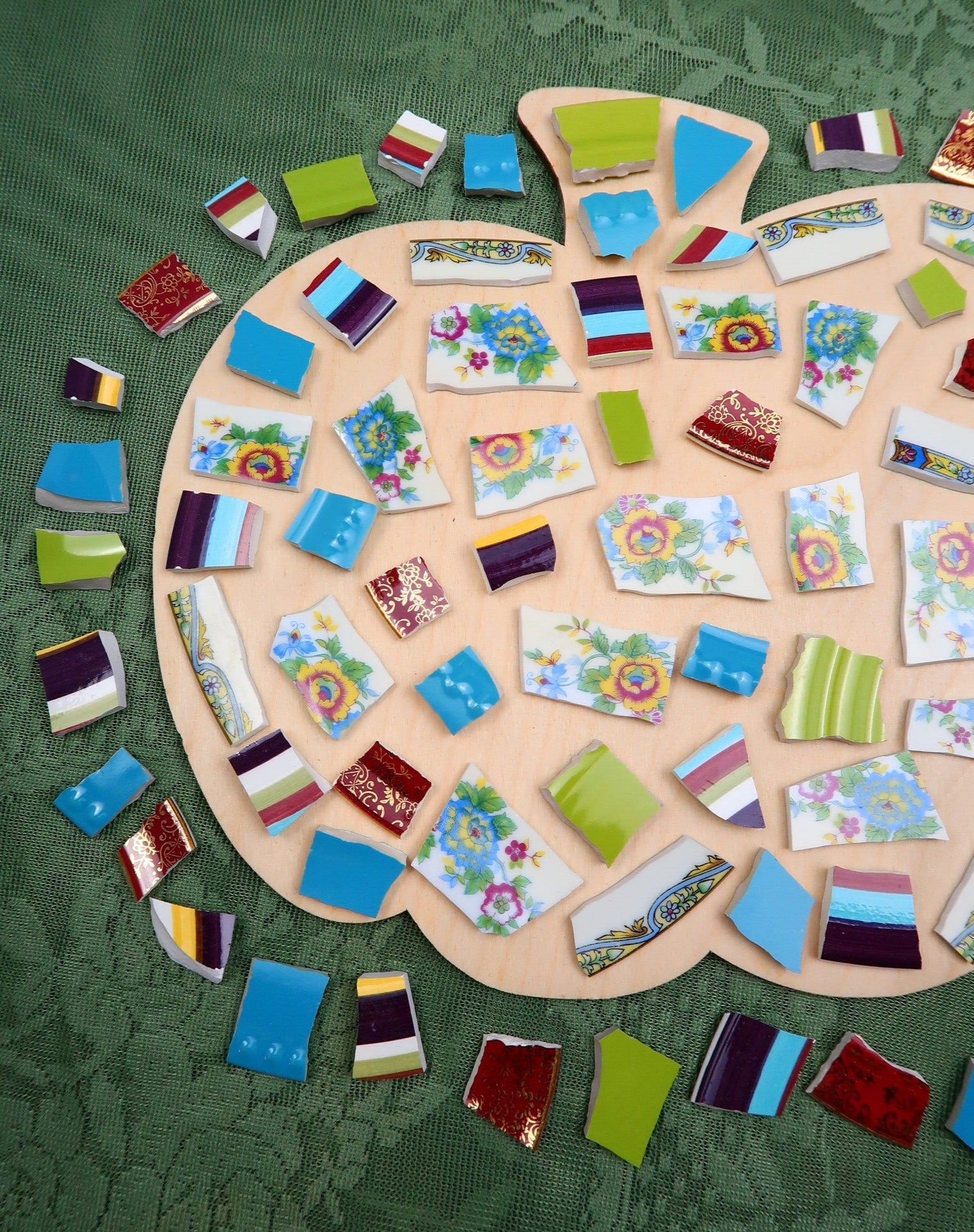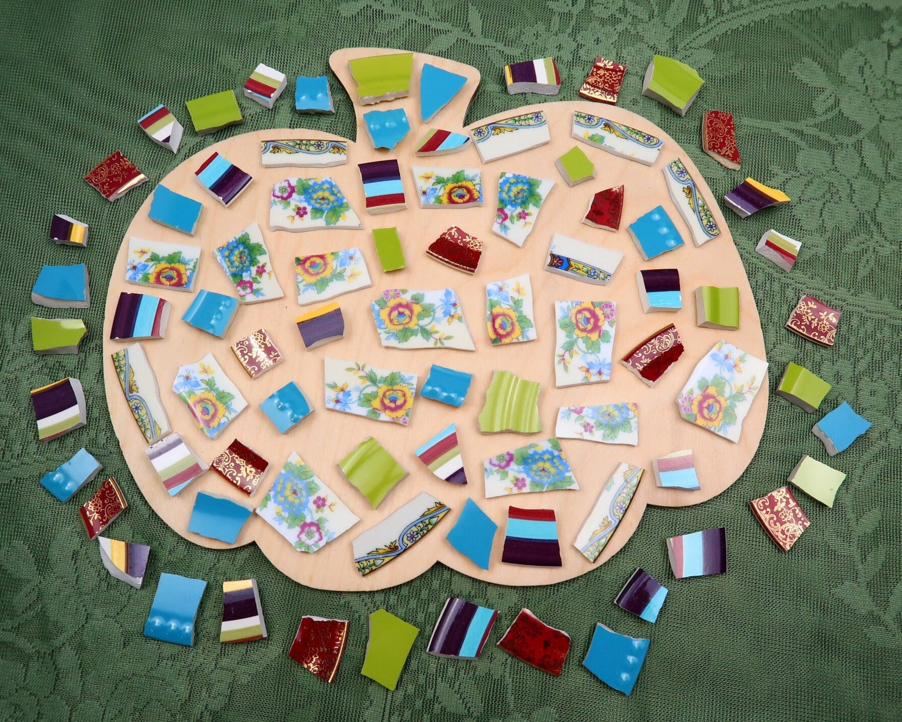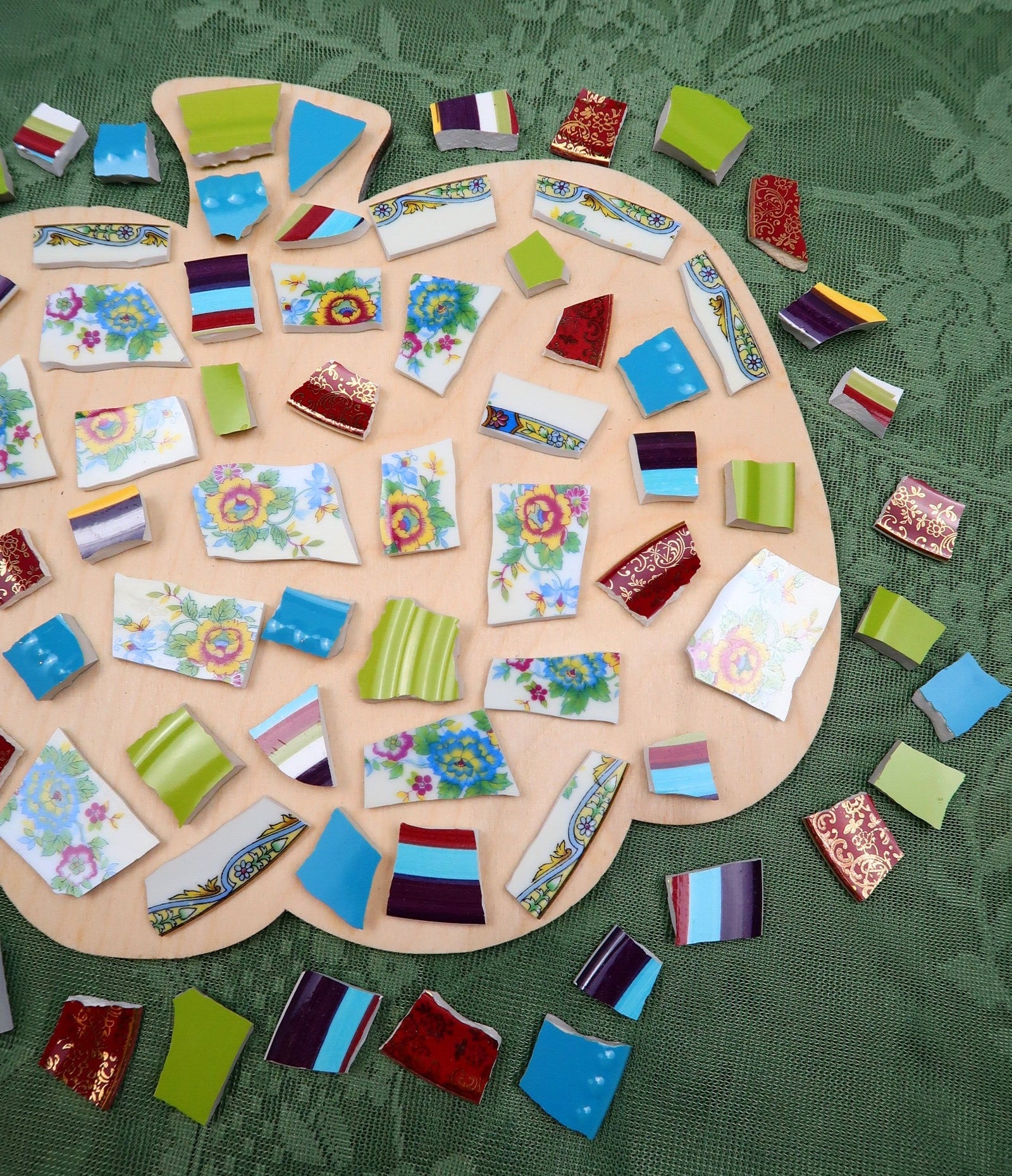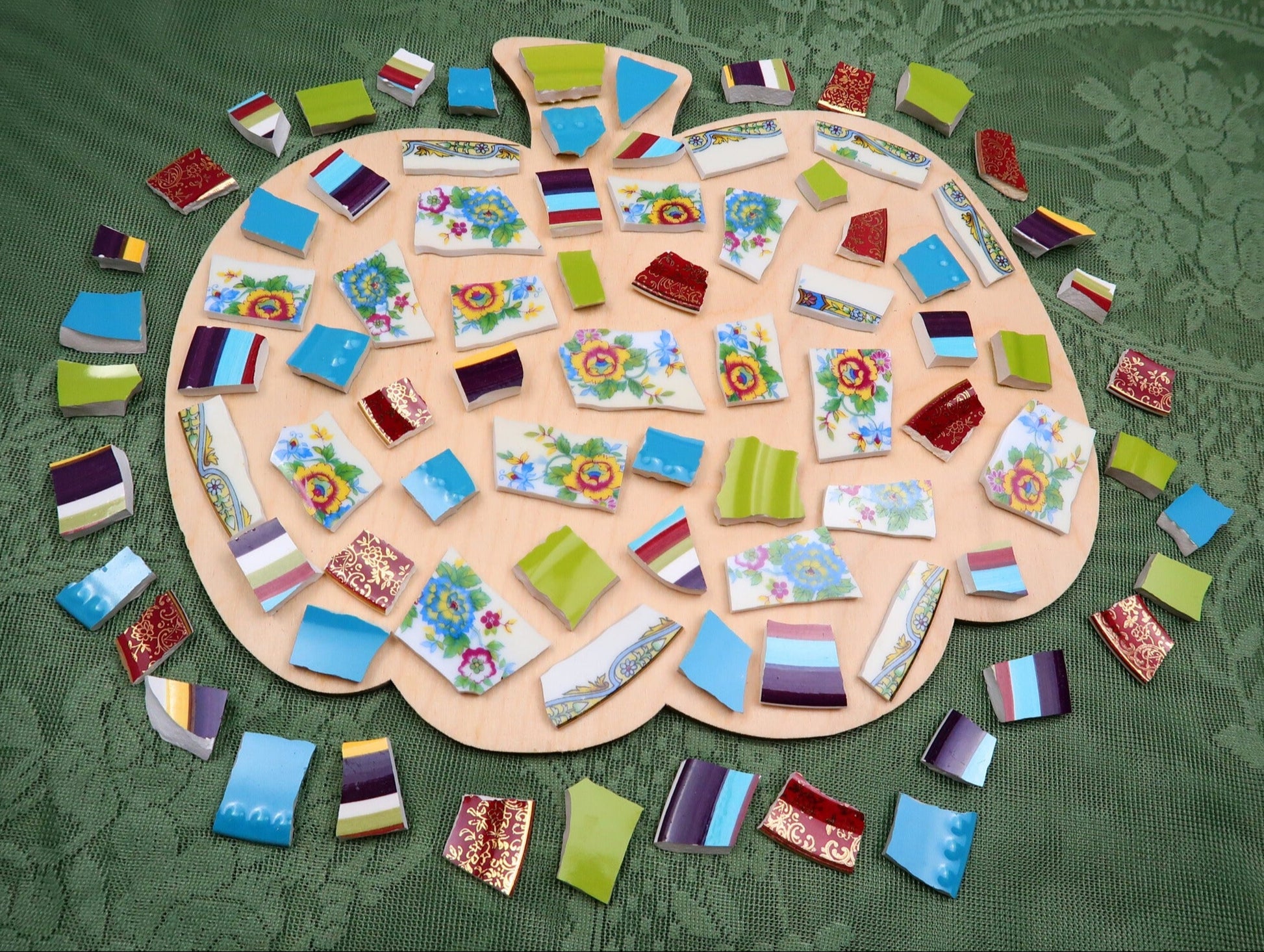 - A hand-selected assortment of broken china Poetic Mosaic tiles