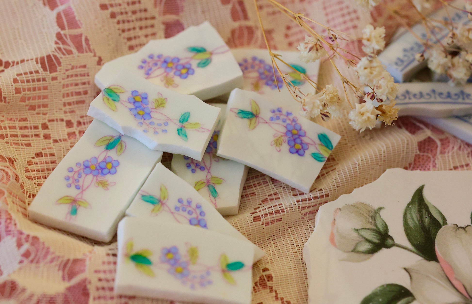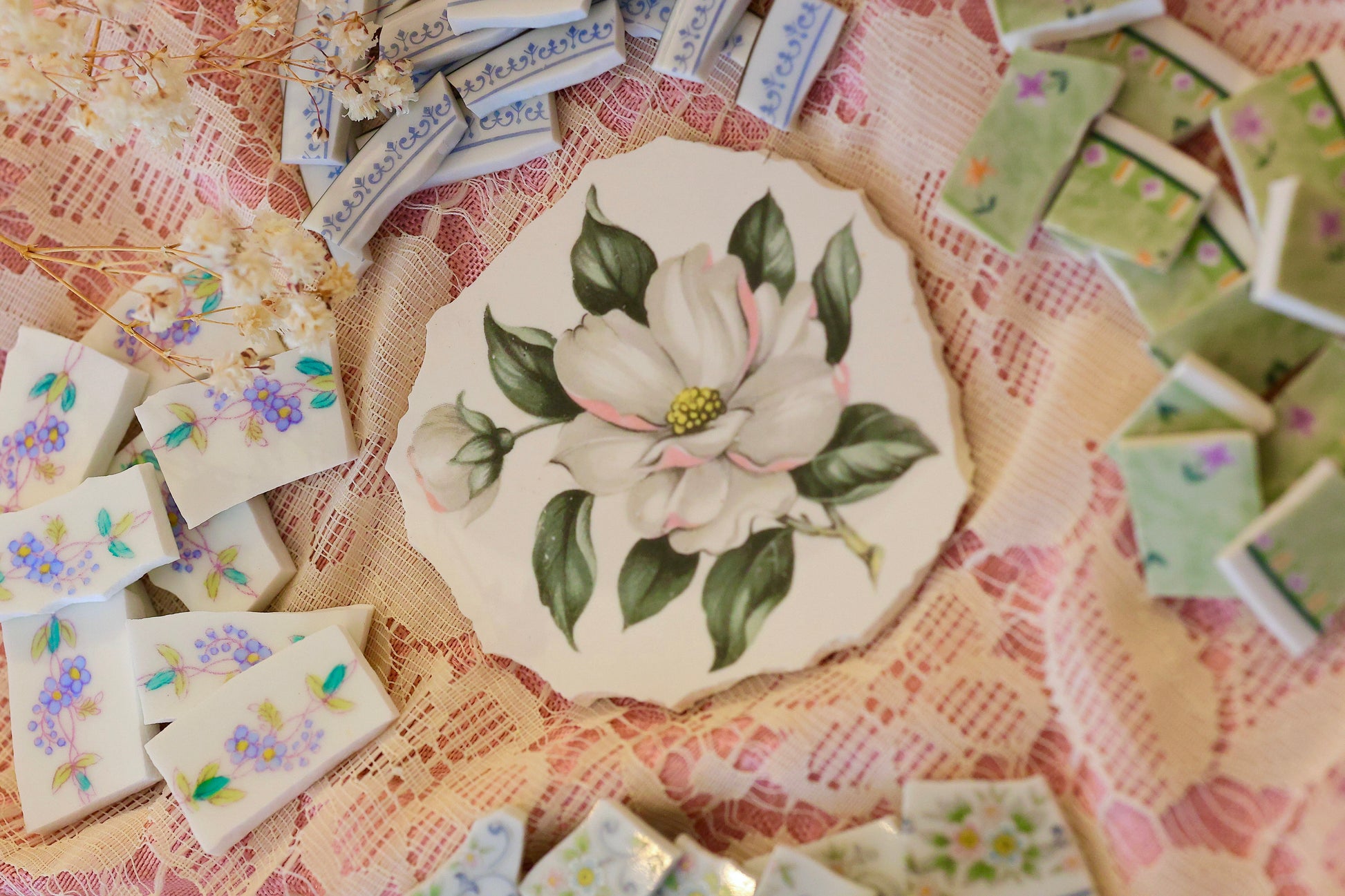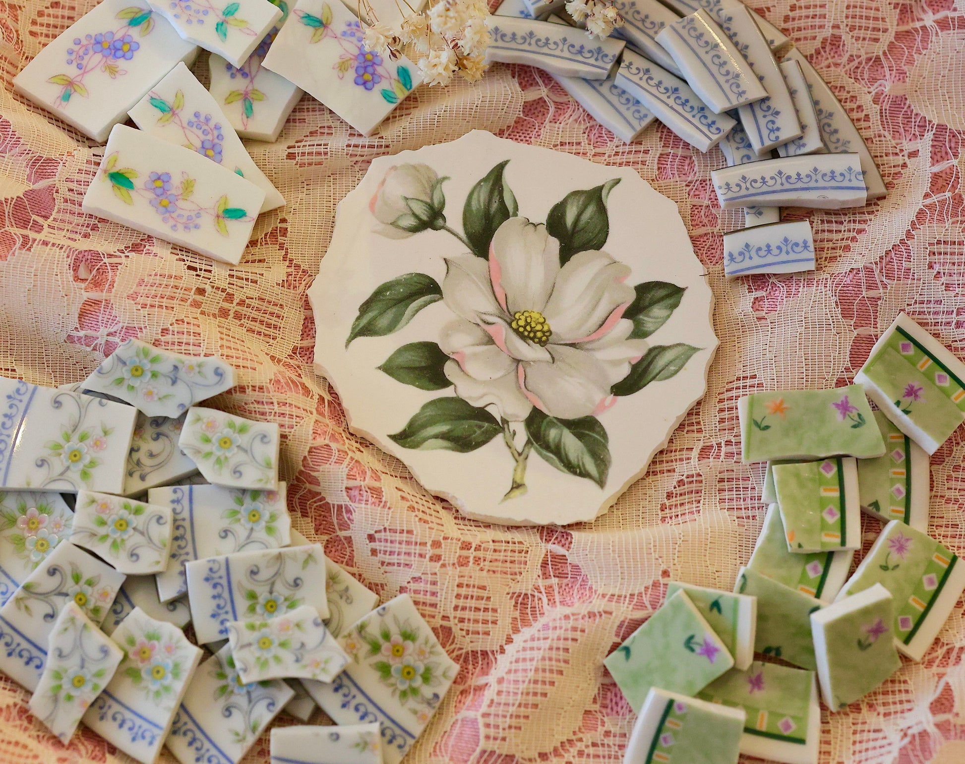 - A hand-selected assortment of broken china Poetic Mosaic tiles