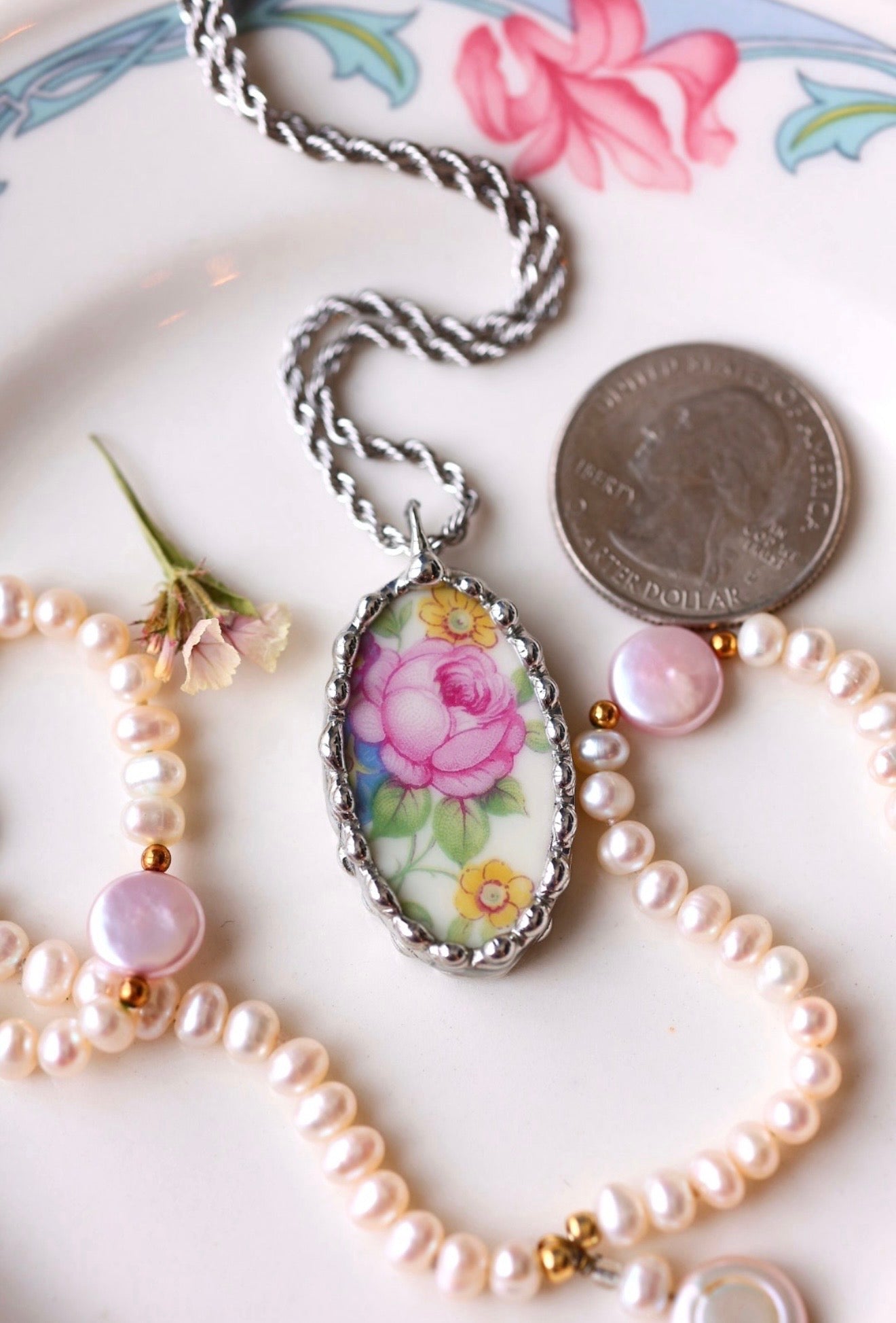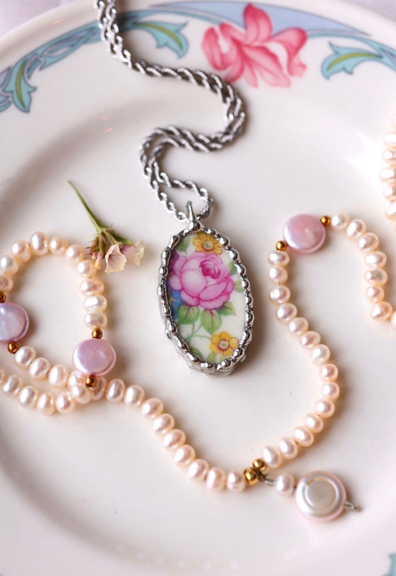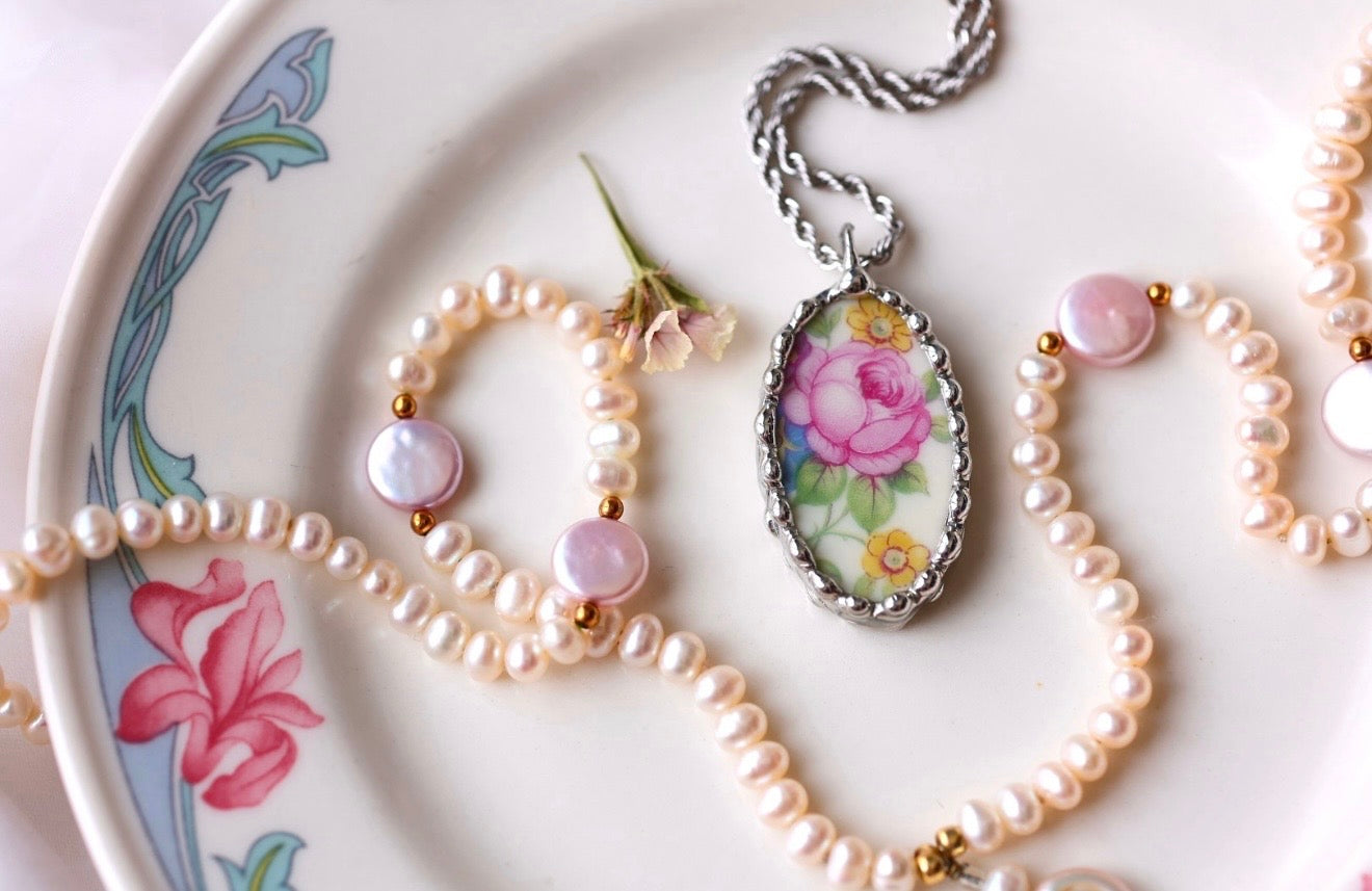 Please remember that these jewelry pieces are made from a unique and unusual medium—vintage dishware. With this, there can be curves and varied thicknesses throughout a single piece.