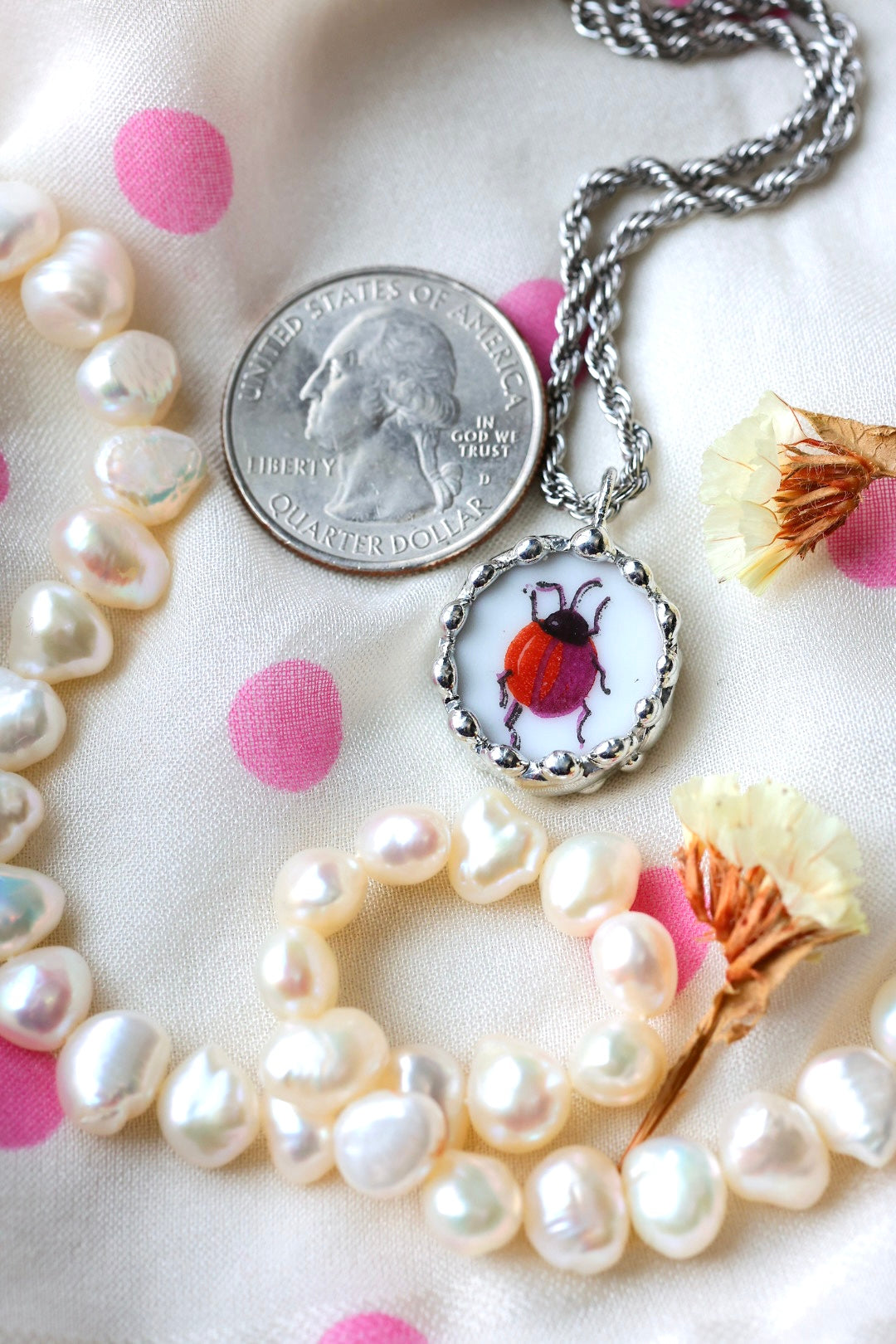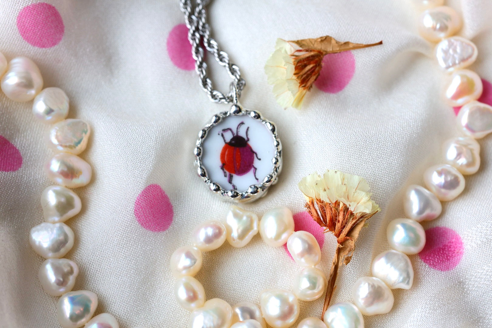 Please remember that these jewelry pieces are made from a unique and unusual medium—vintage dishware. With this, there can be curves and varied thicknesses throughout a single piece.