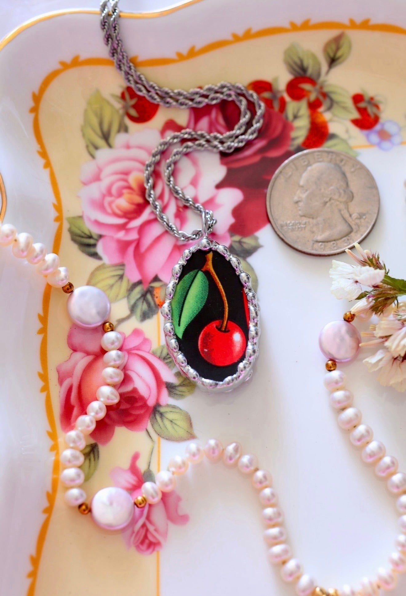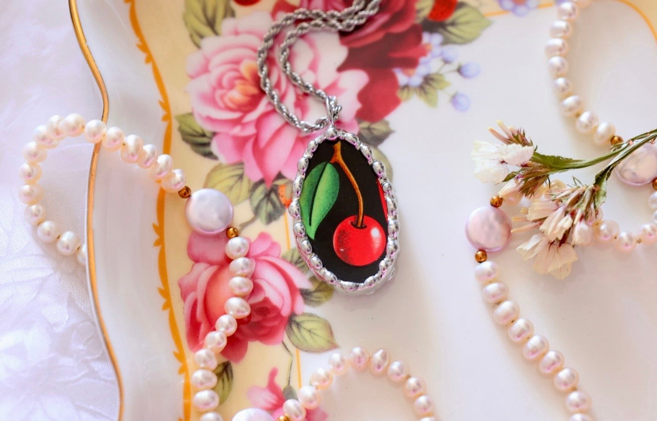 Please remember that these jewelry pieces are made from a unique and unusual medium—vintage dishware. With this, there can be curves and varied thicknesses throughout a single piece.