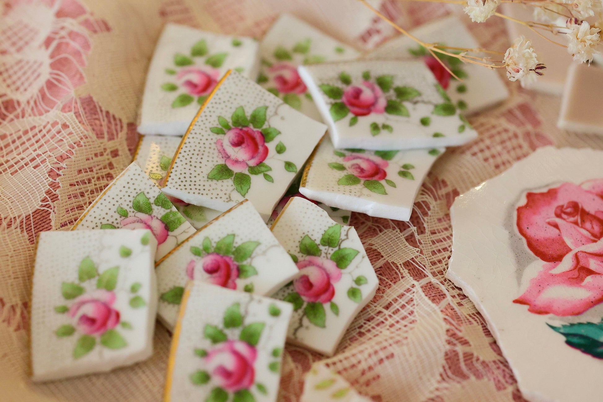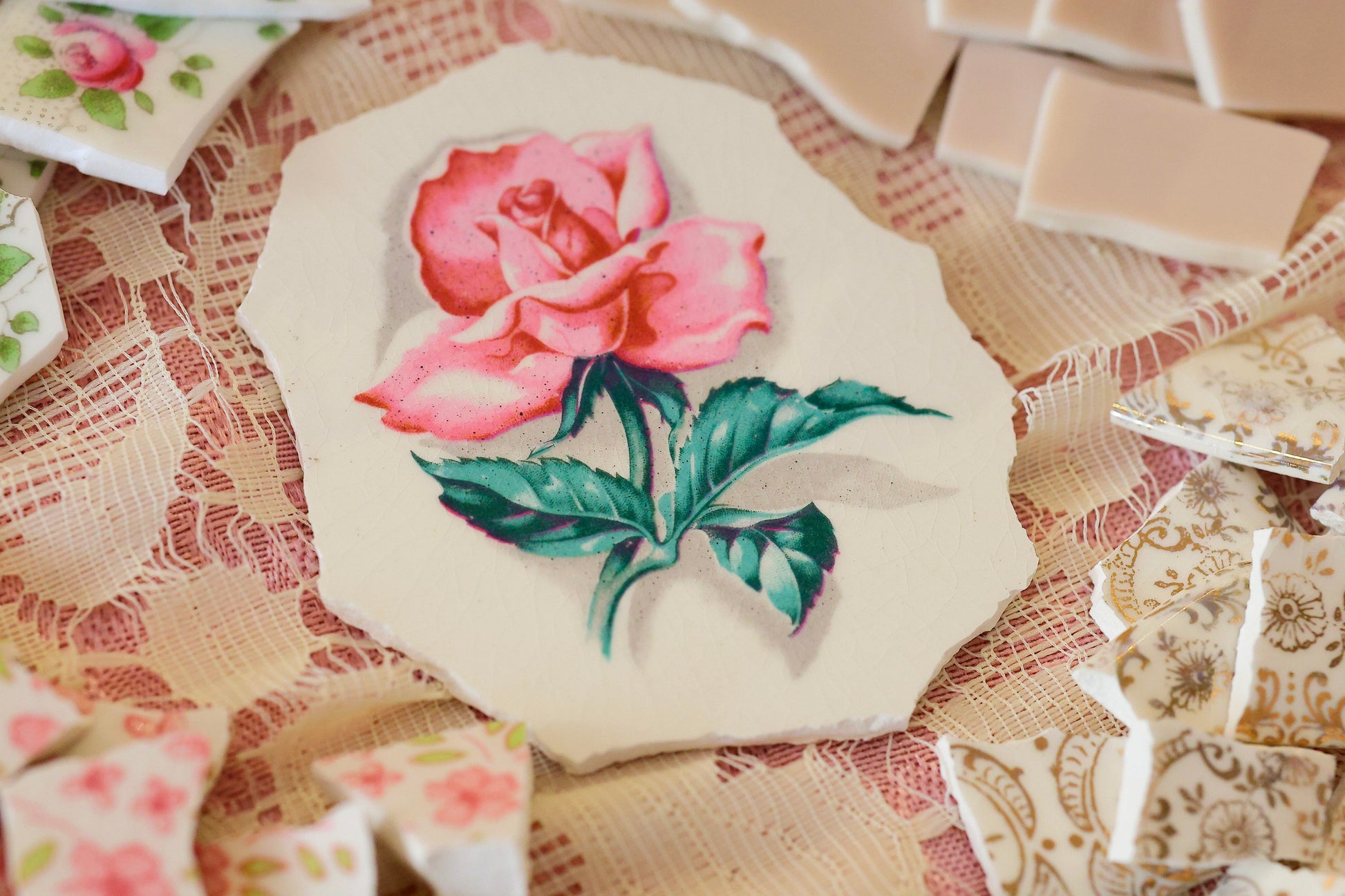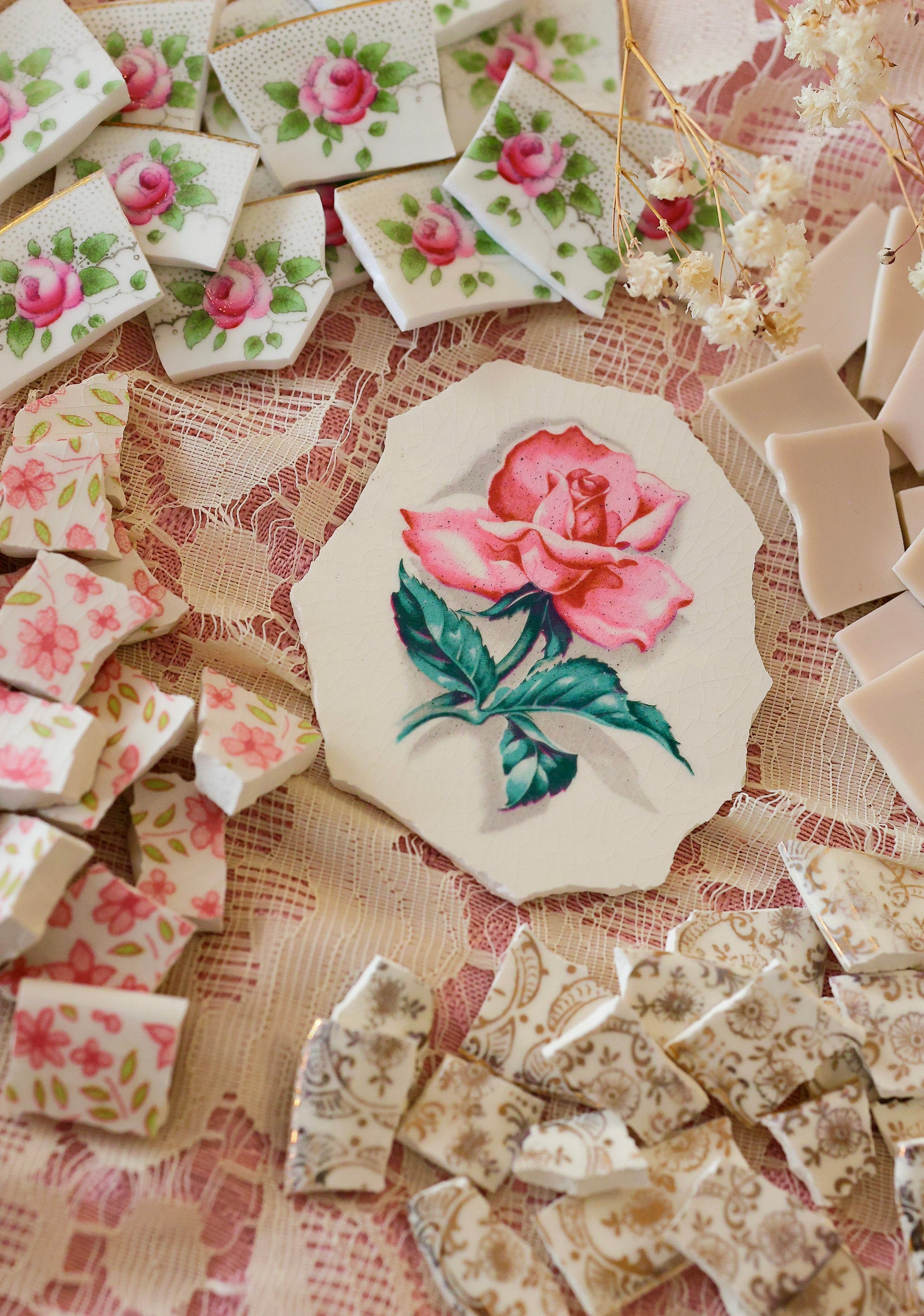 - A hand-selected assortment of broken china Poetic Mosaic tiles