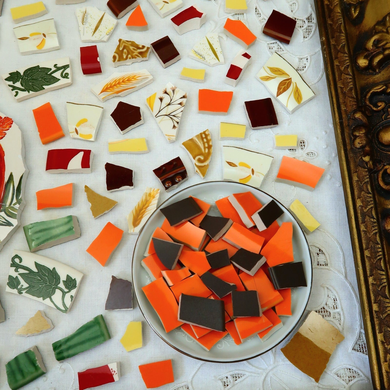- A hand-selected assortment of broken china Poetic Mosaic tiles