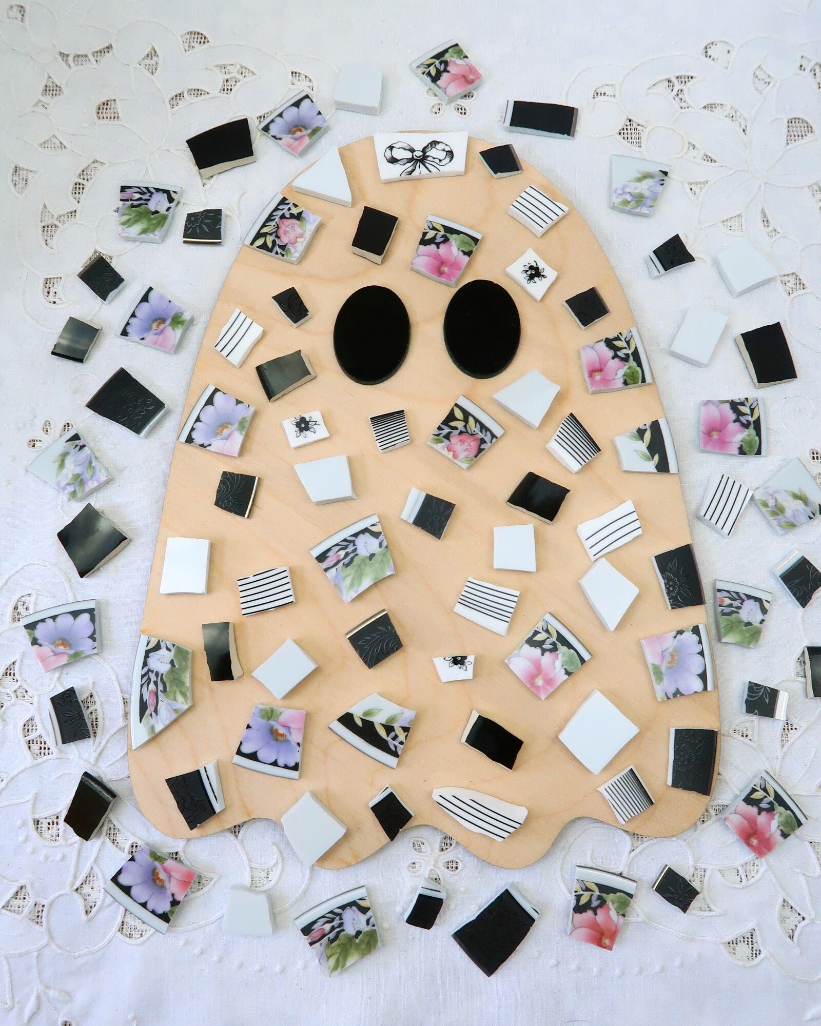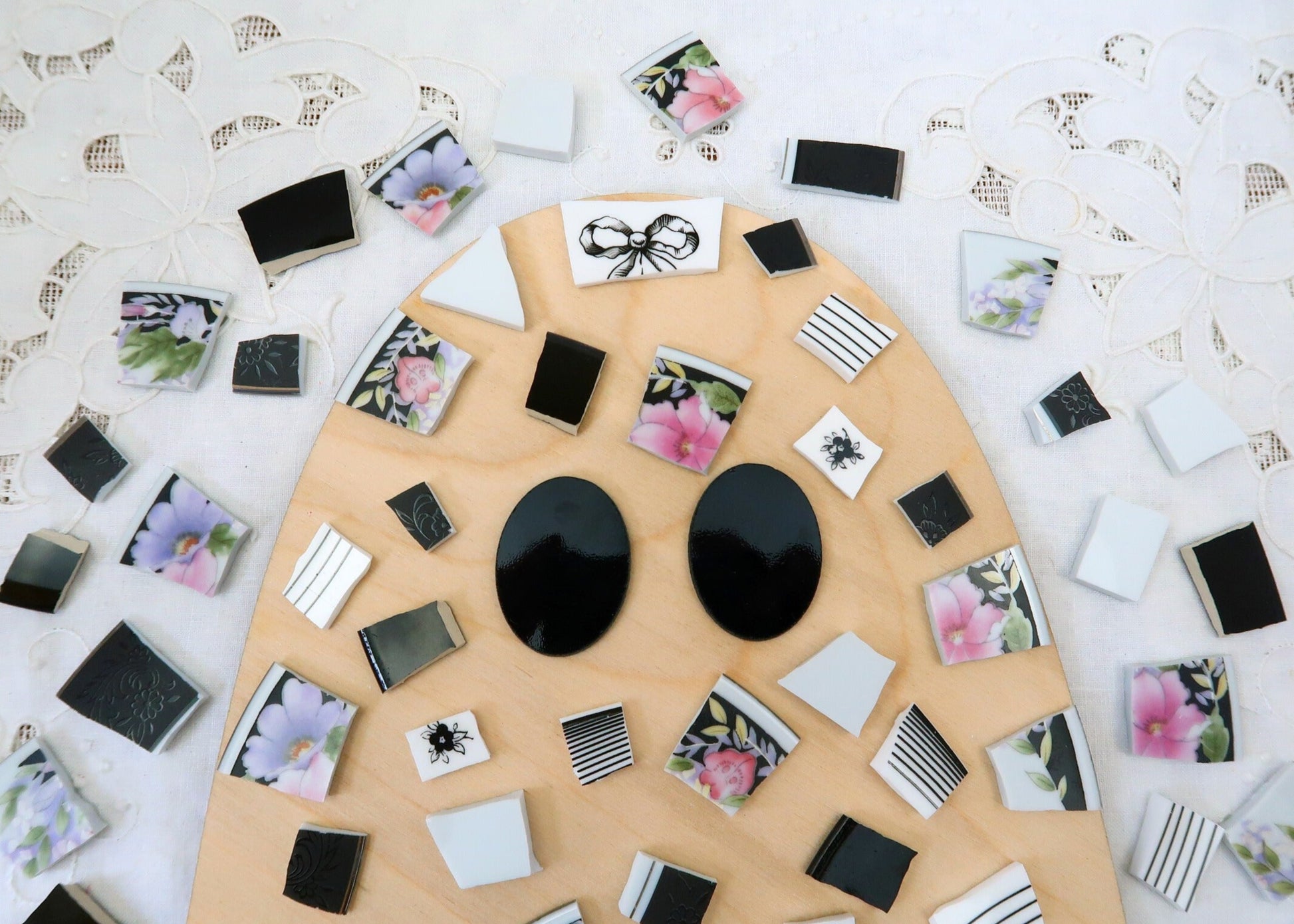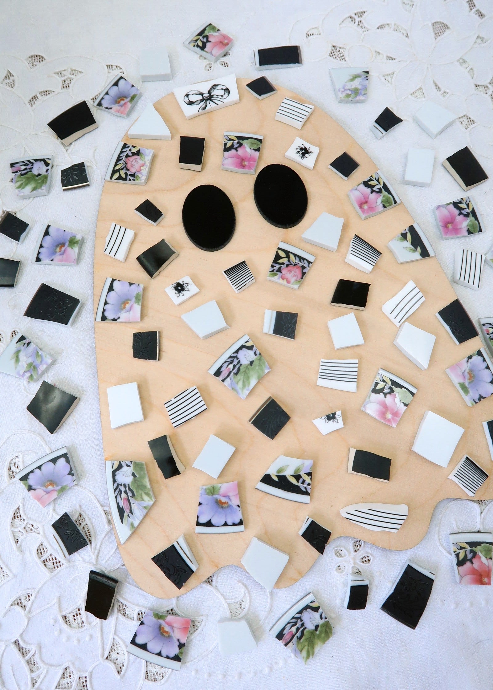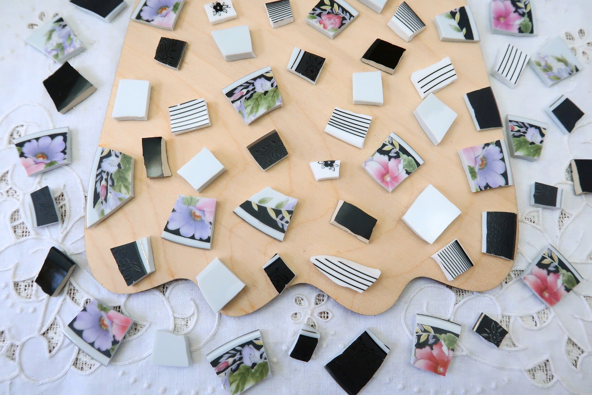- A hand-selected assortment of broken china Poetic Mosaic tiles