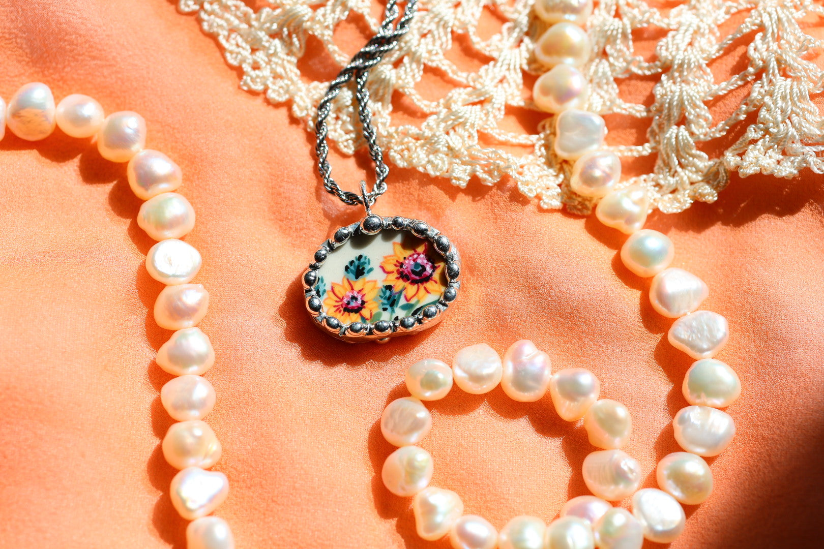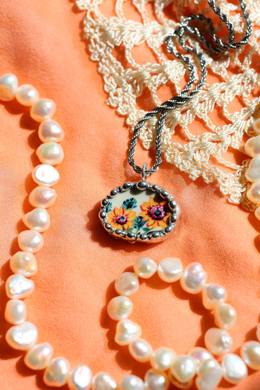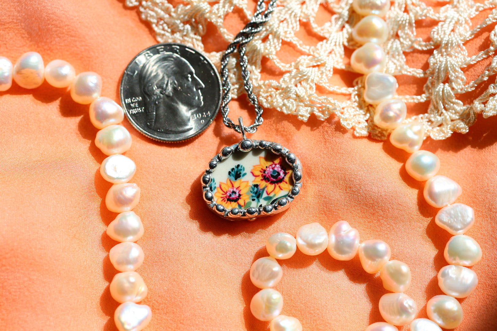 Please remember that these jewelry pieces are made from a unique and unusual medium—vintage dishware. With this, there can be curves and varied thicknesses throughout a single piece.