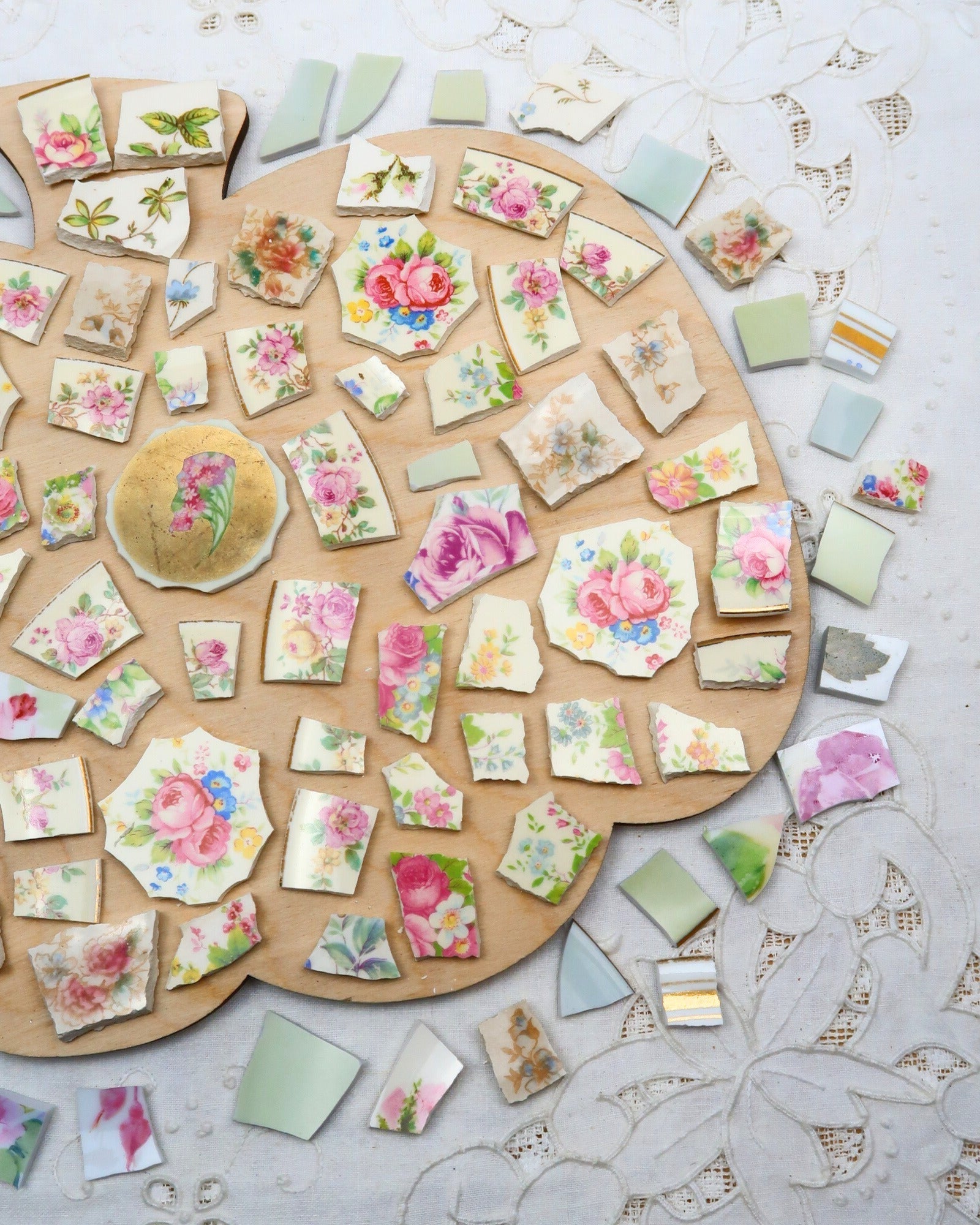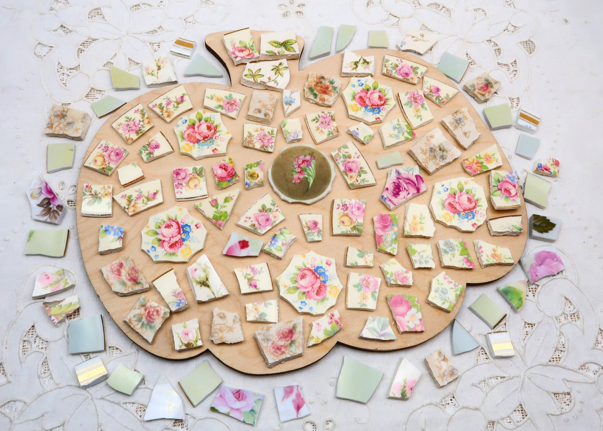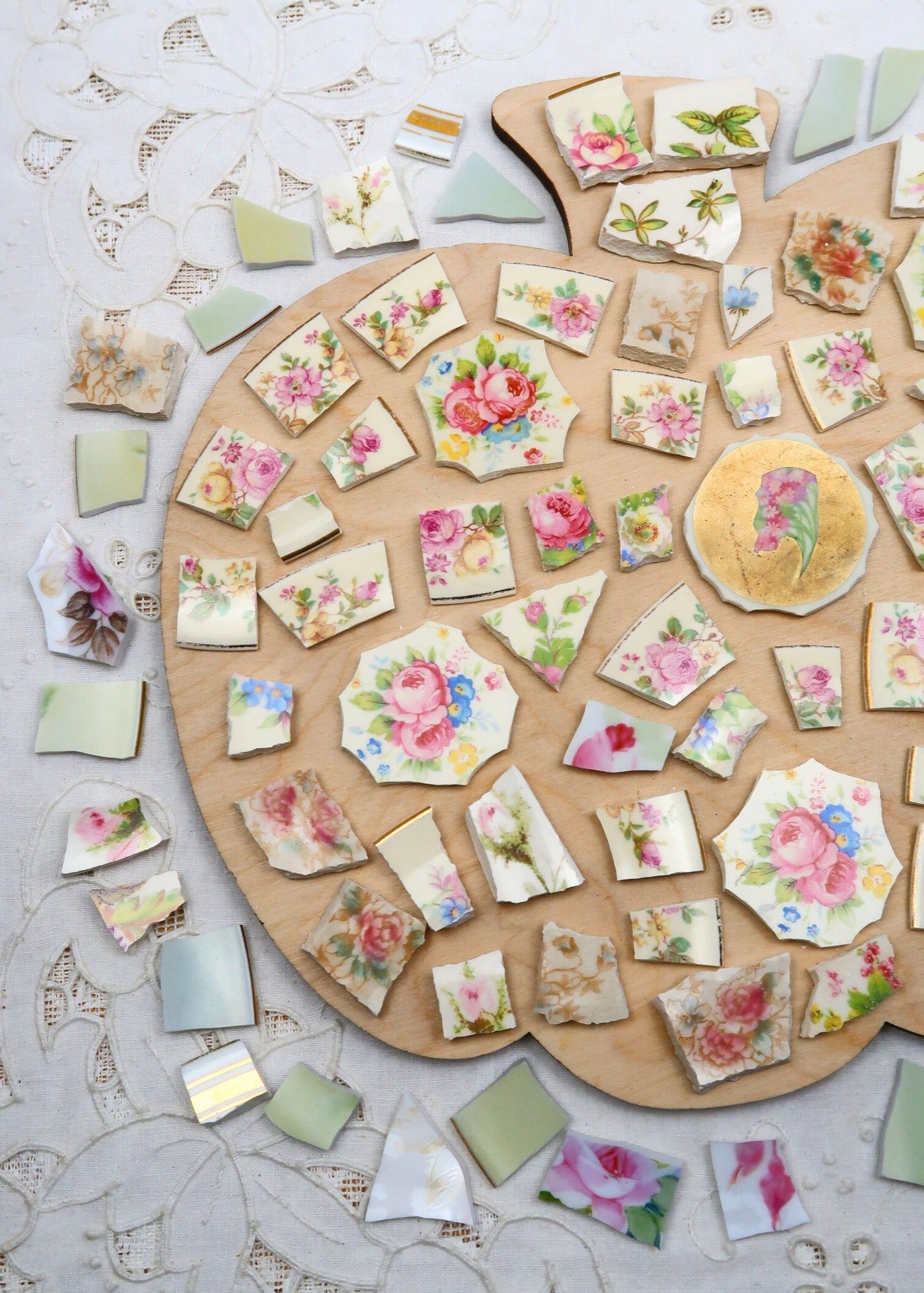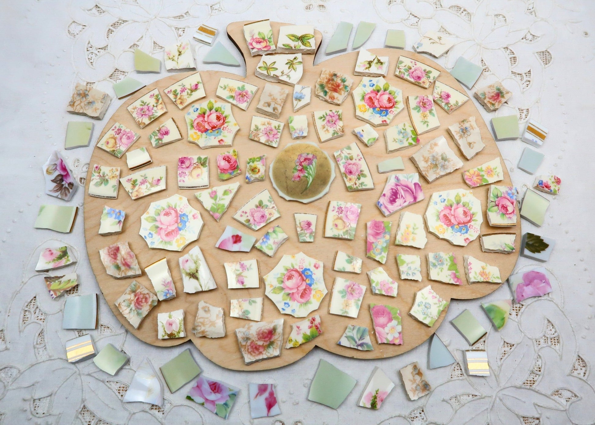 - A hand-selected assortment of broken china Poetic Mosaic tiles