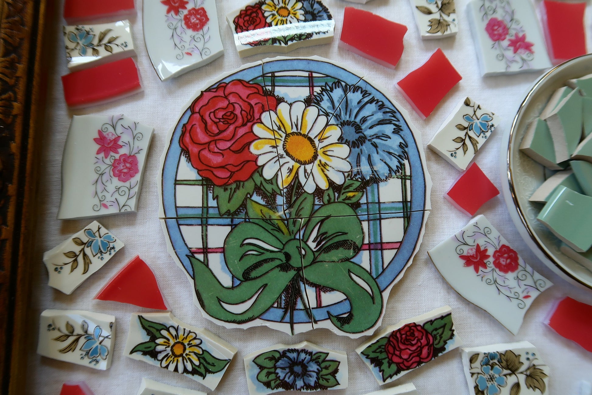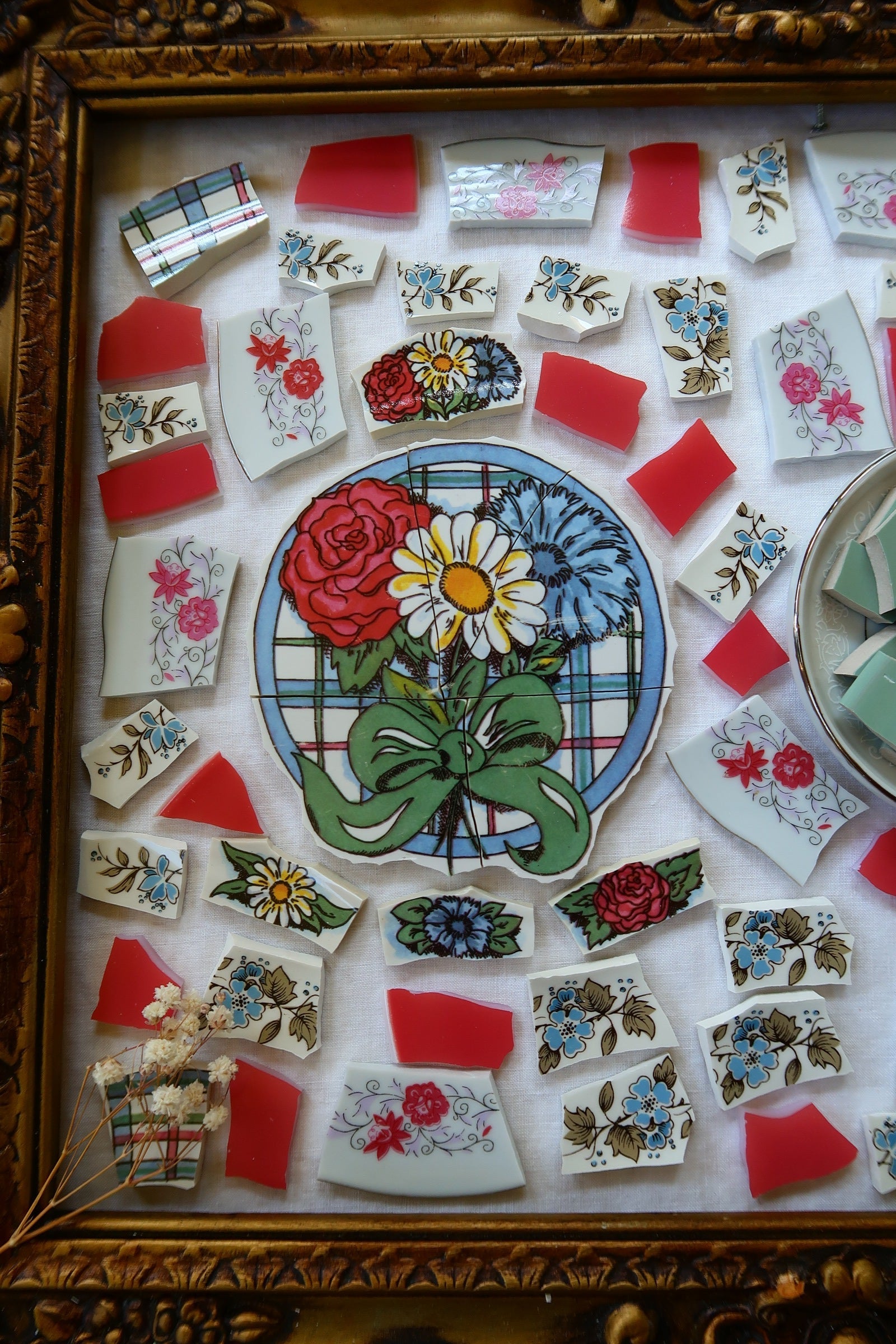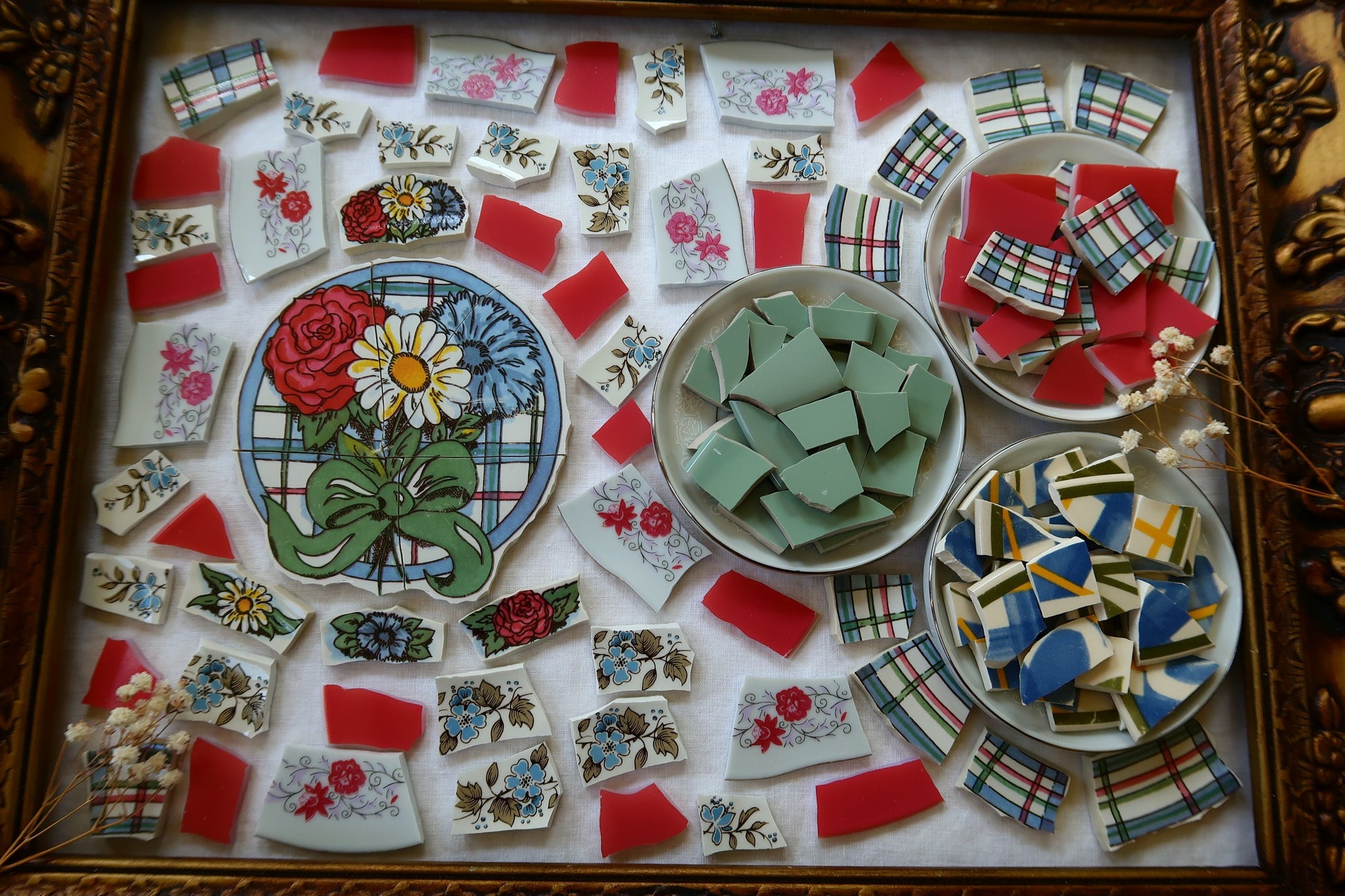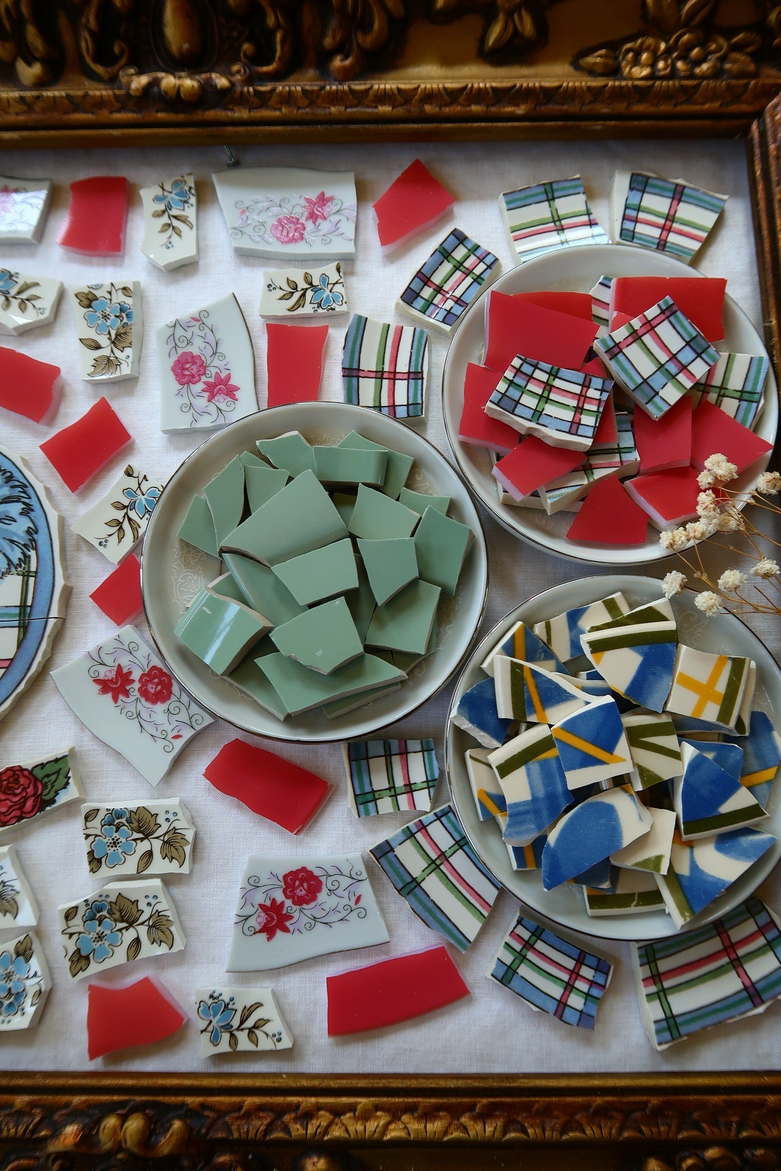 - A hand-selected assortment of broken china Poetic Mosaic tiles