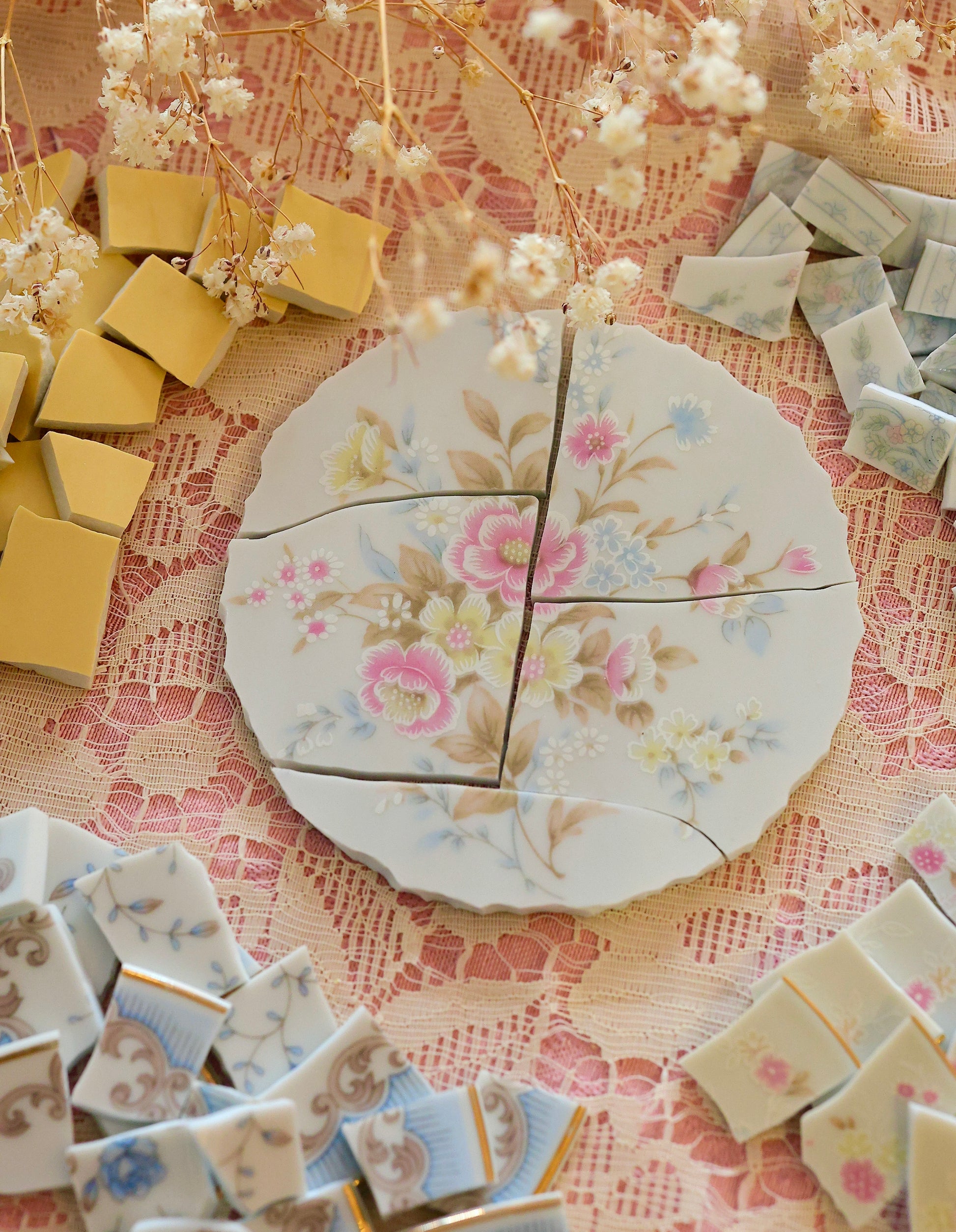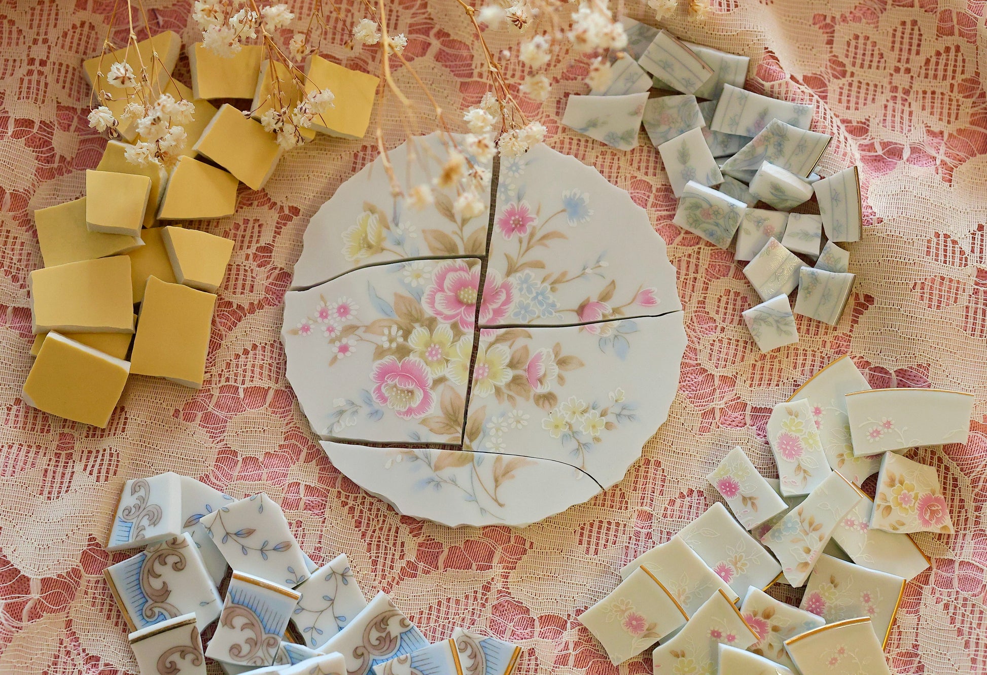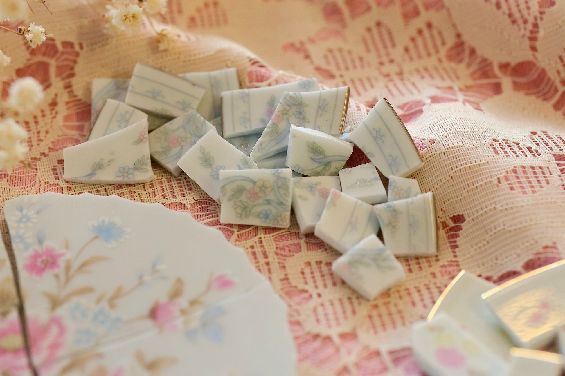 - A hand-selected assortment of broken china Poetic Mosaic tiles
