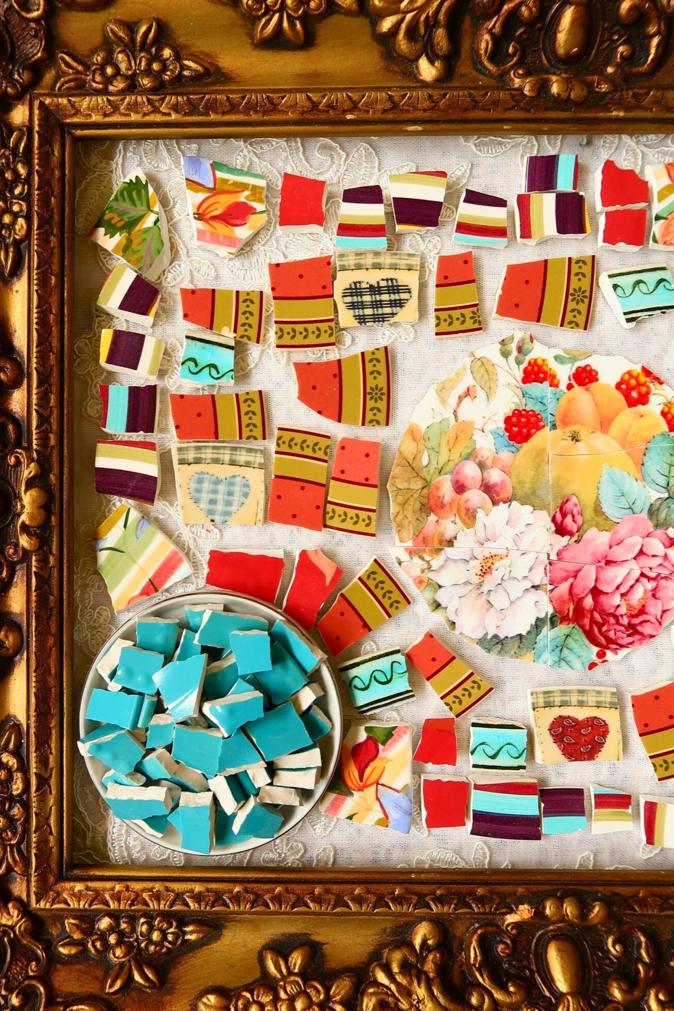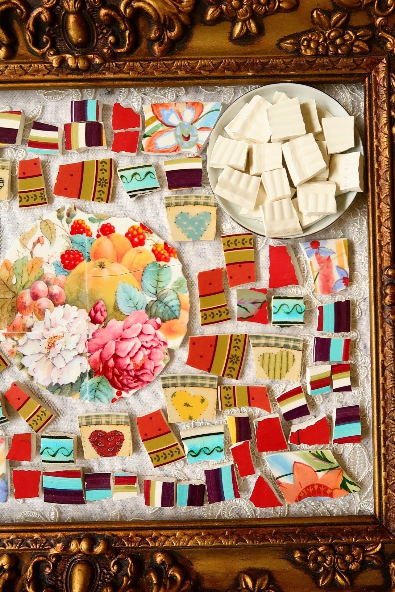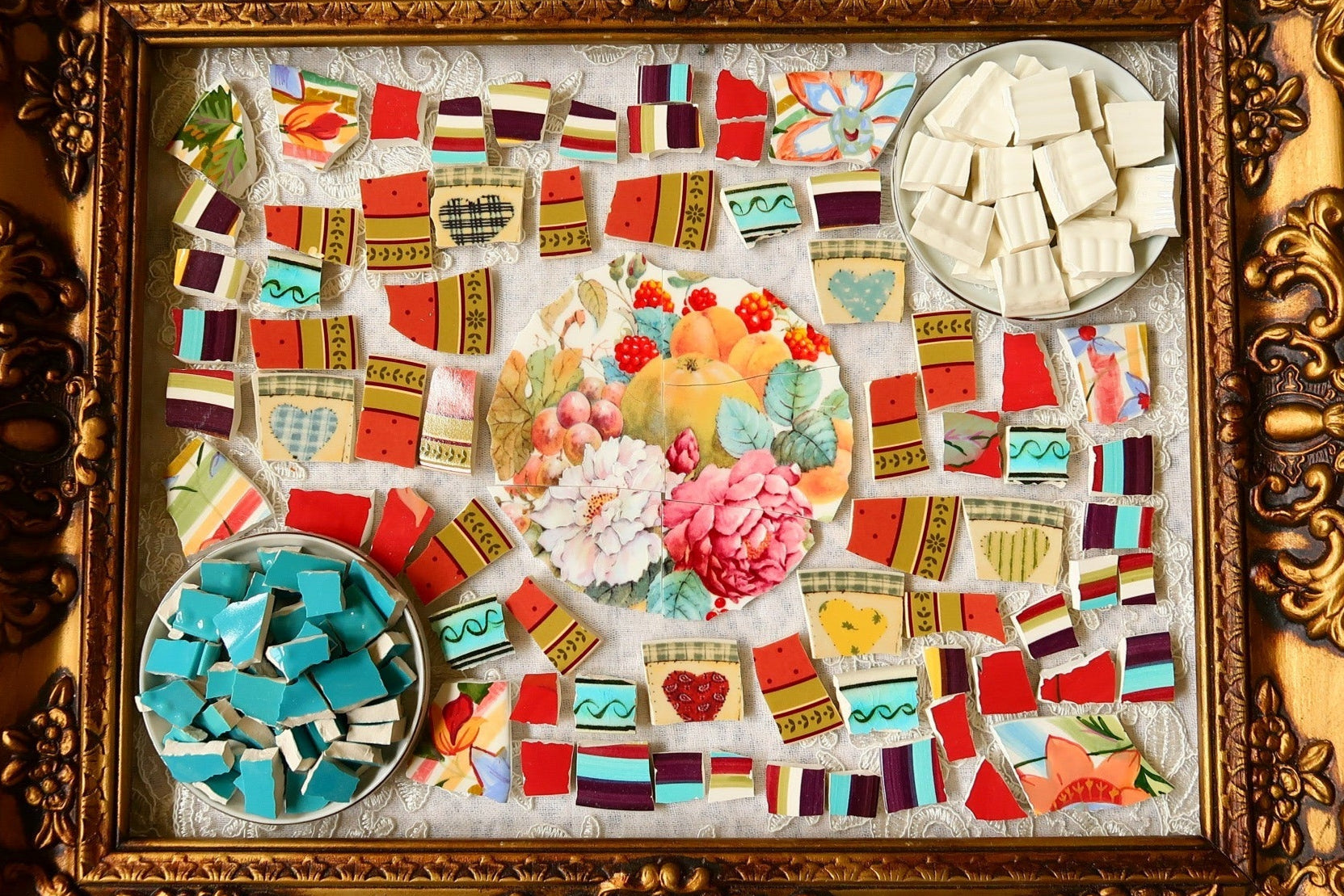 - A hand-selected assortment of broken china Poetic Mosaic tiles