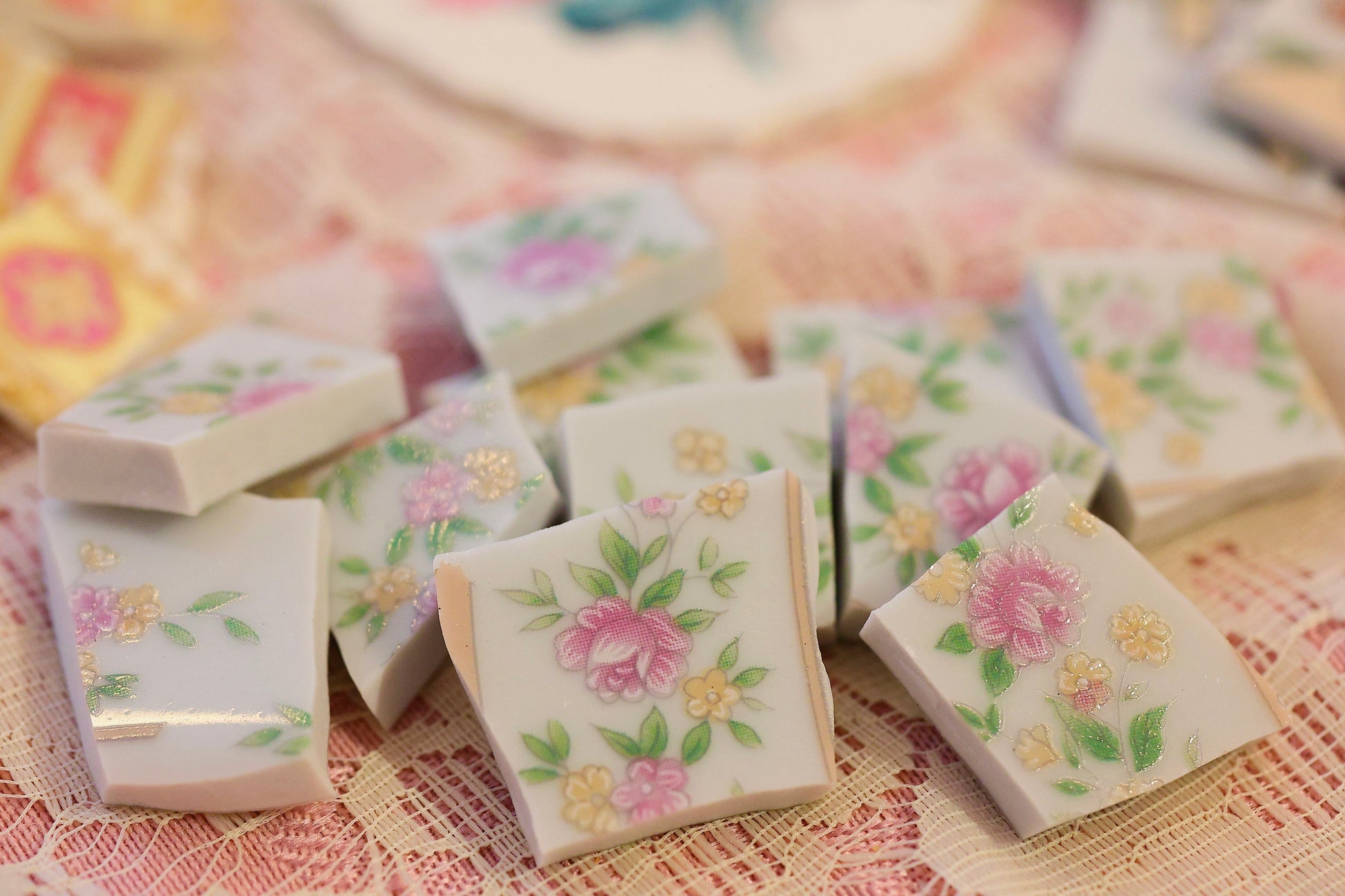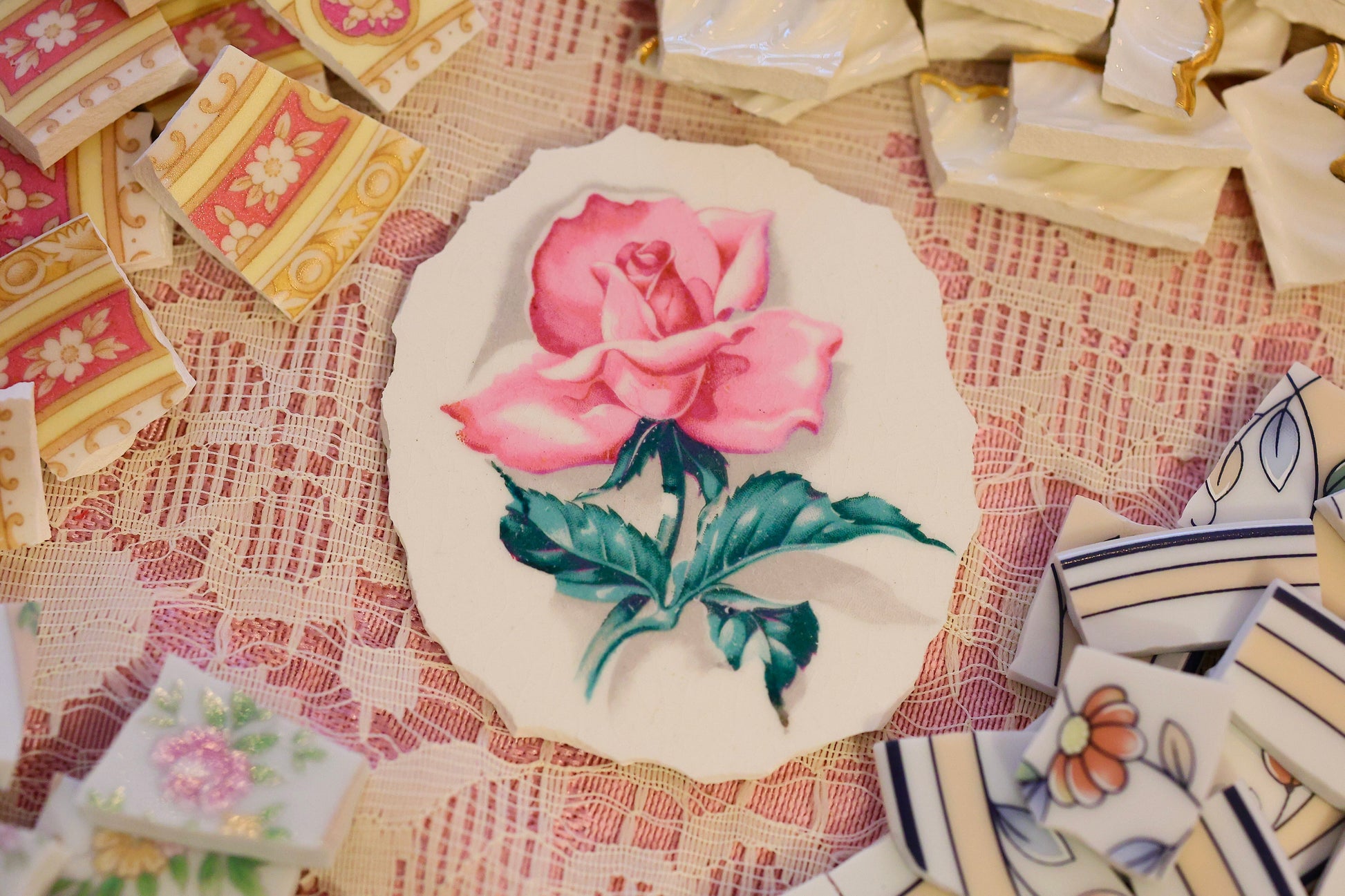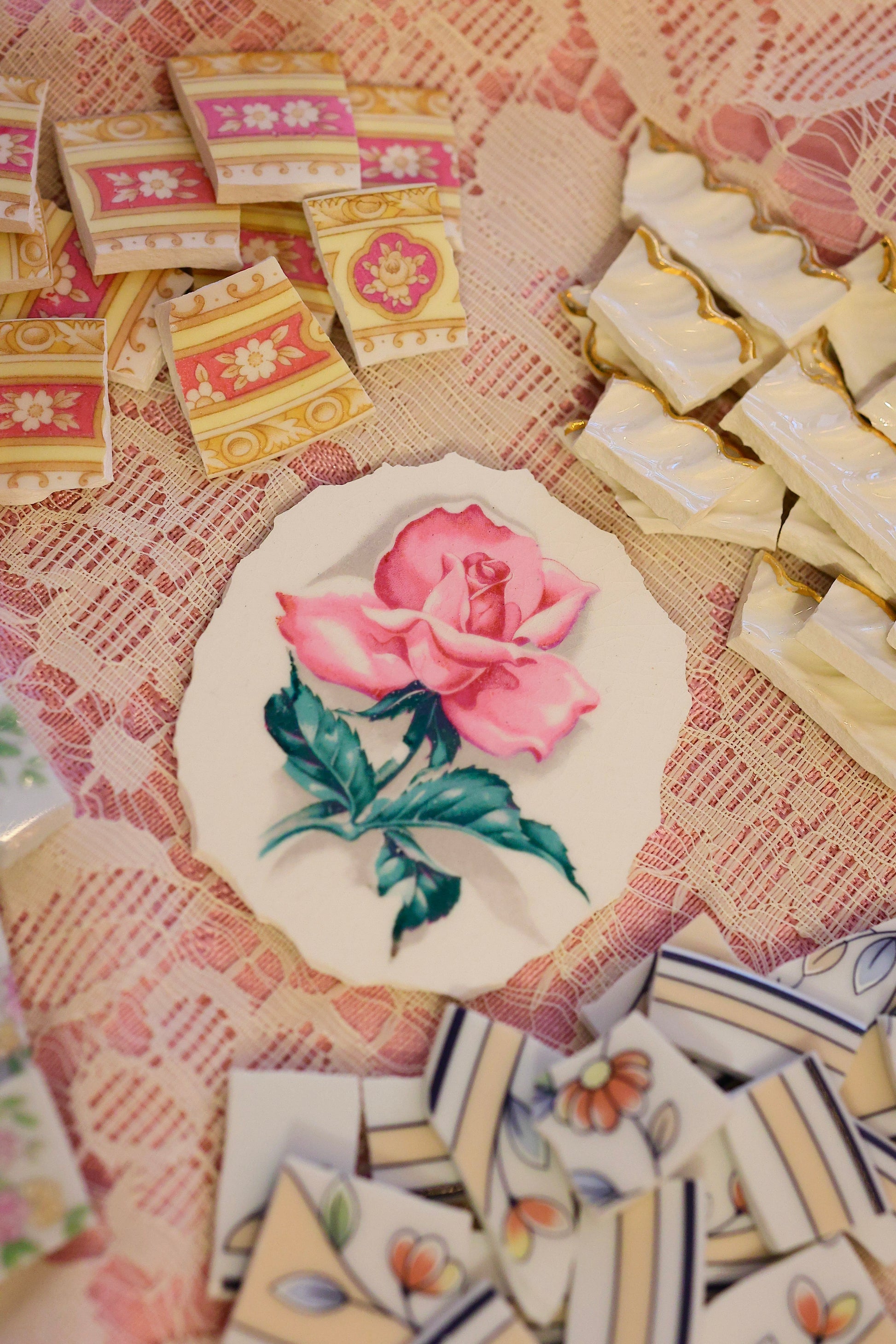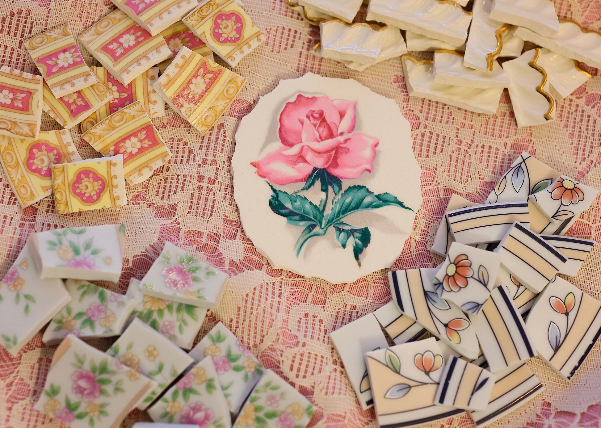 - A hand-selected assortment of broken china Poetic Mosaic tiles