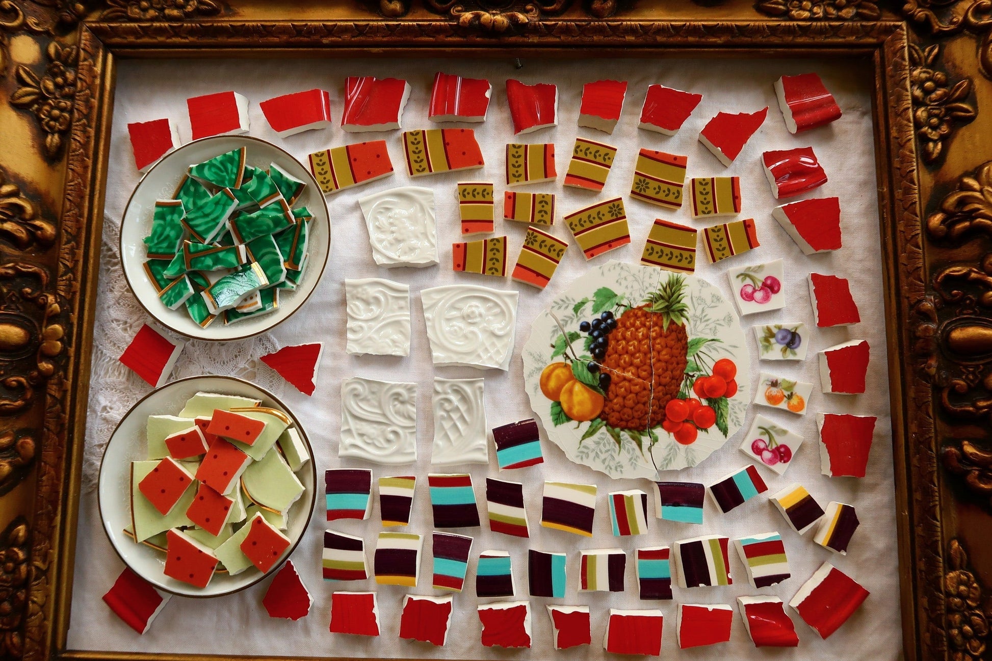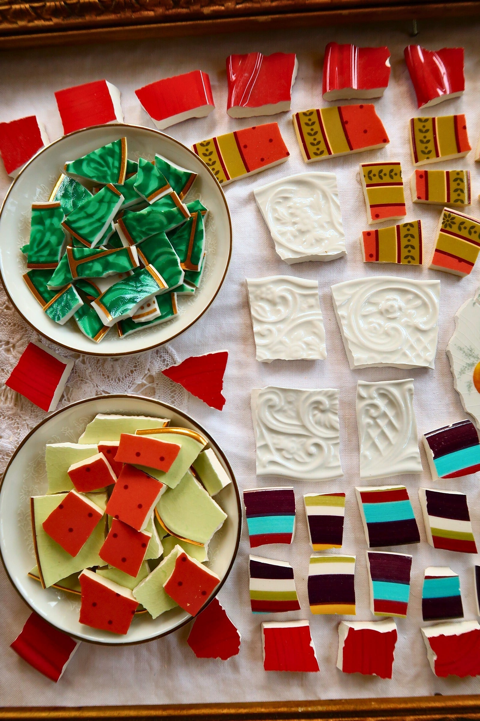 - A hand-selected assortment of broken china Poetic Mosaic tiles