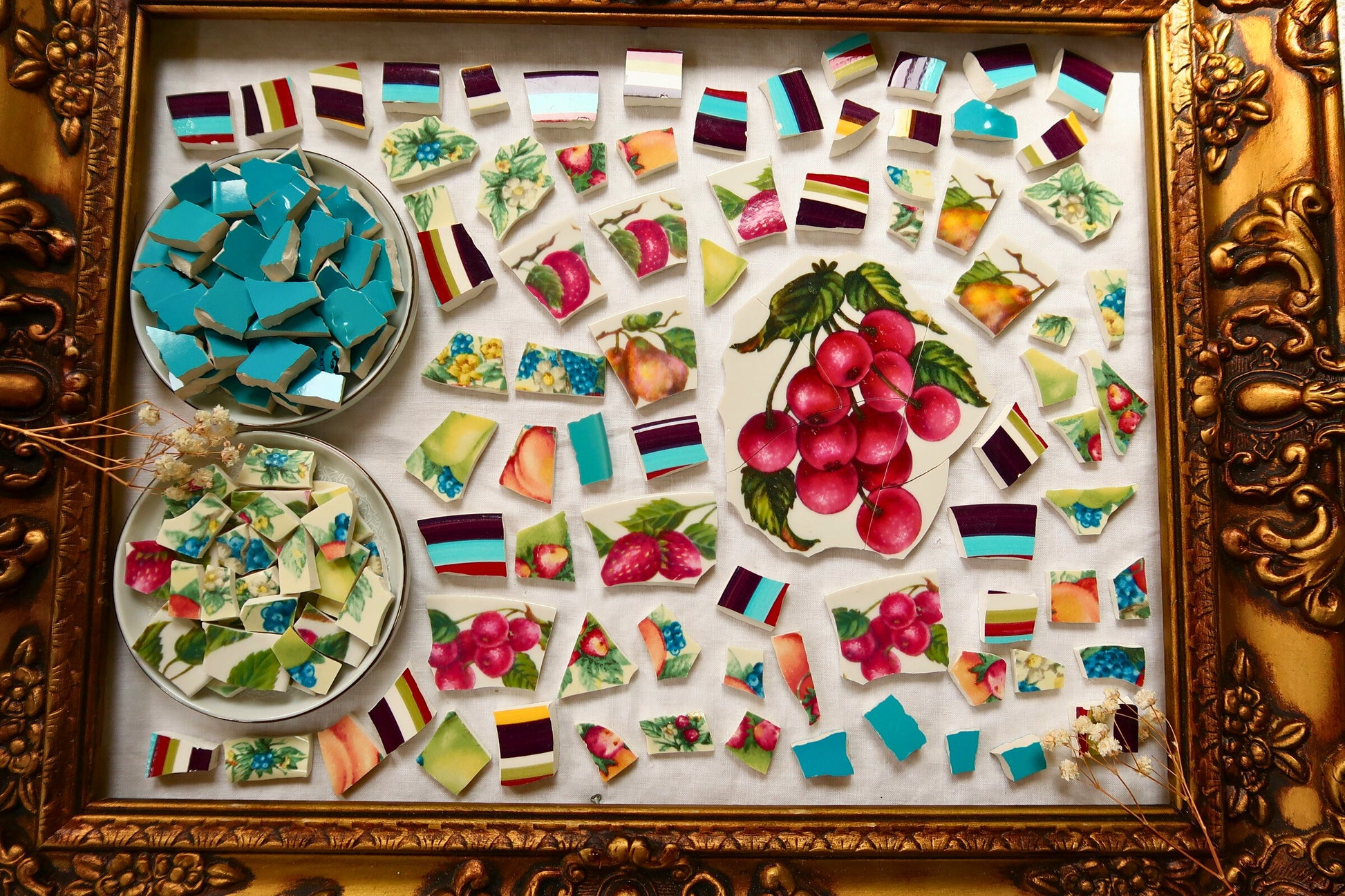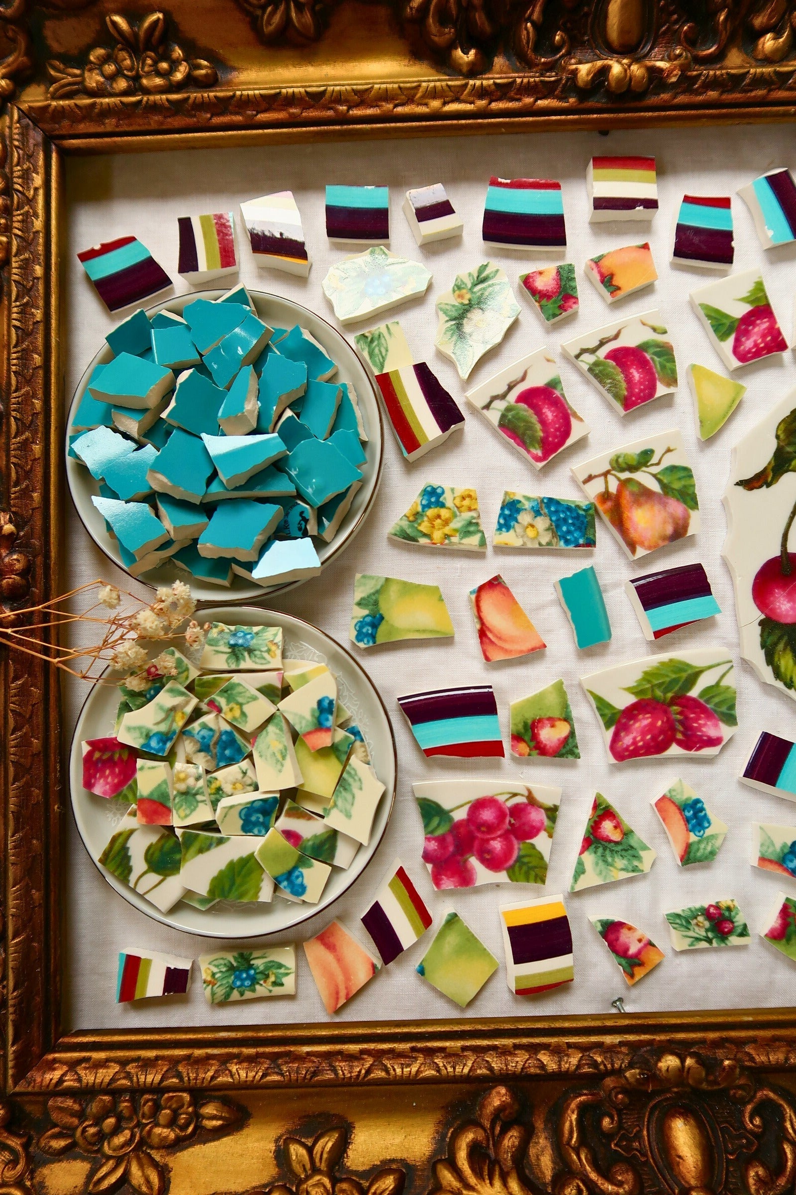 - A hand-selected assortment of broken china Poetic Mosaic tiles