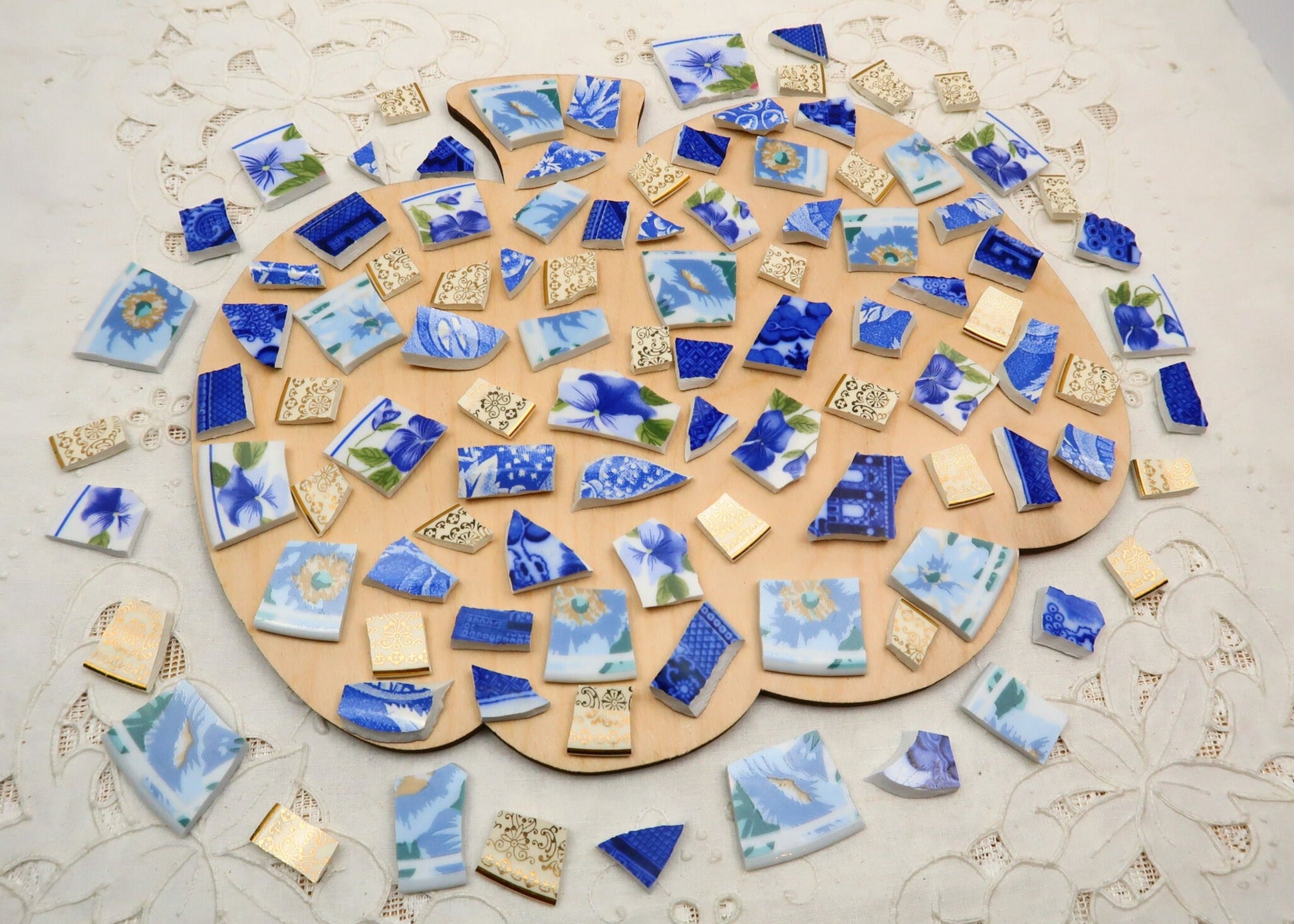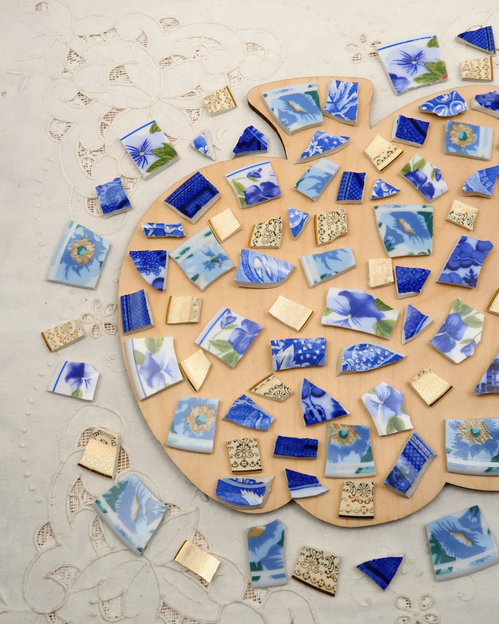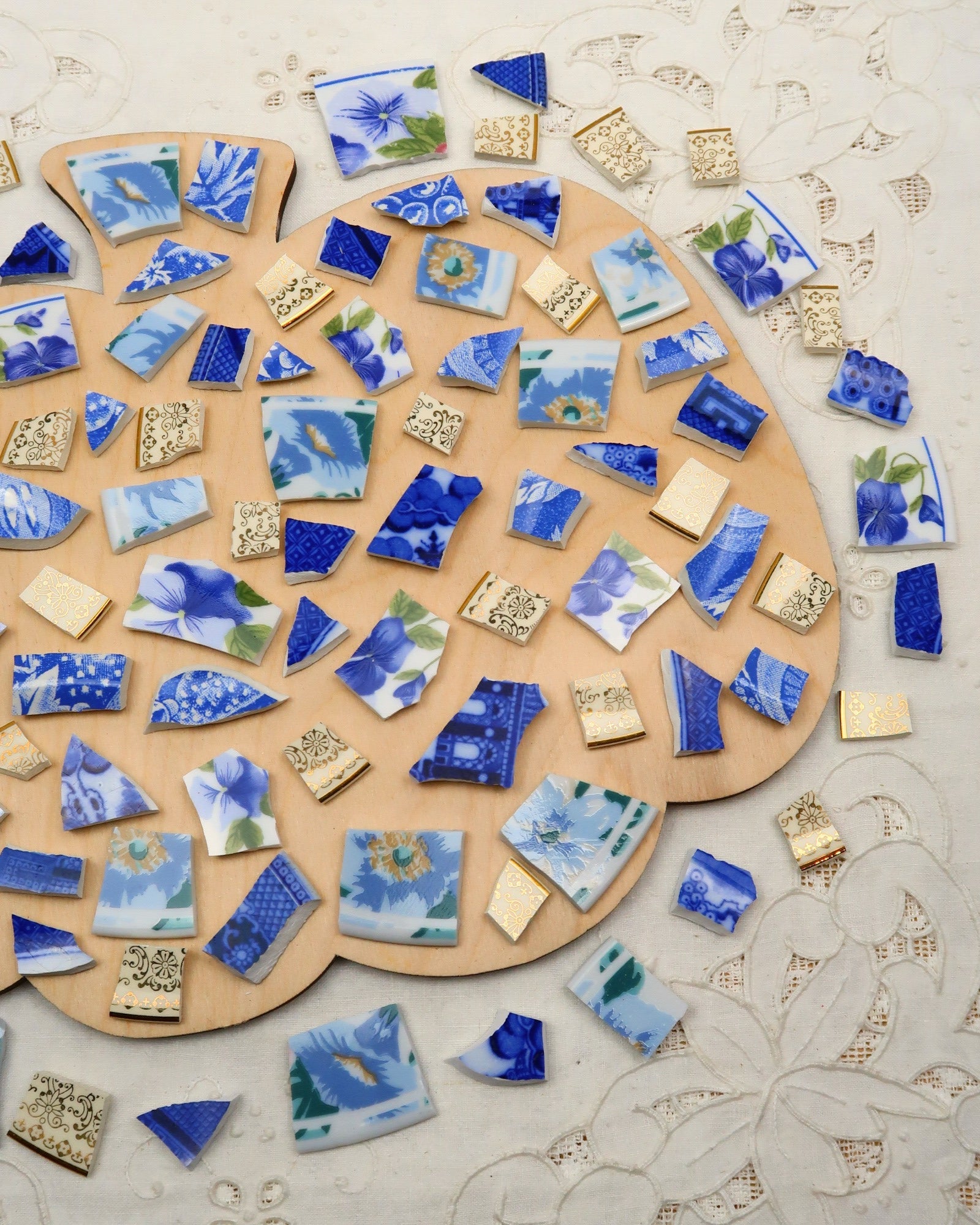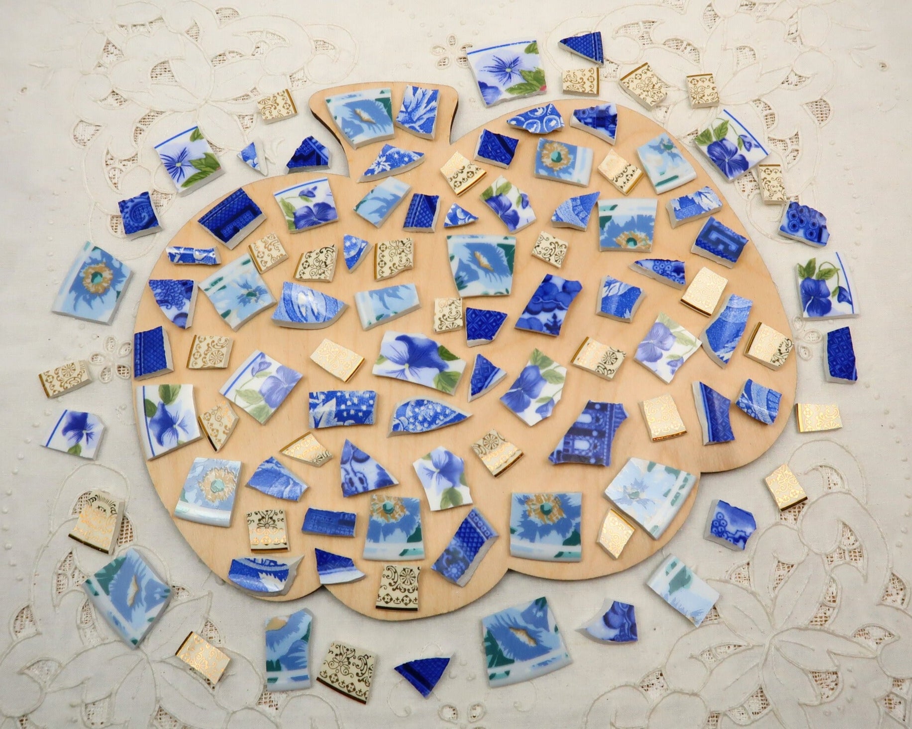- A hand-selected assortment of broken china Poetic Mosaic tiles