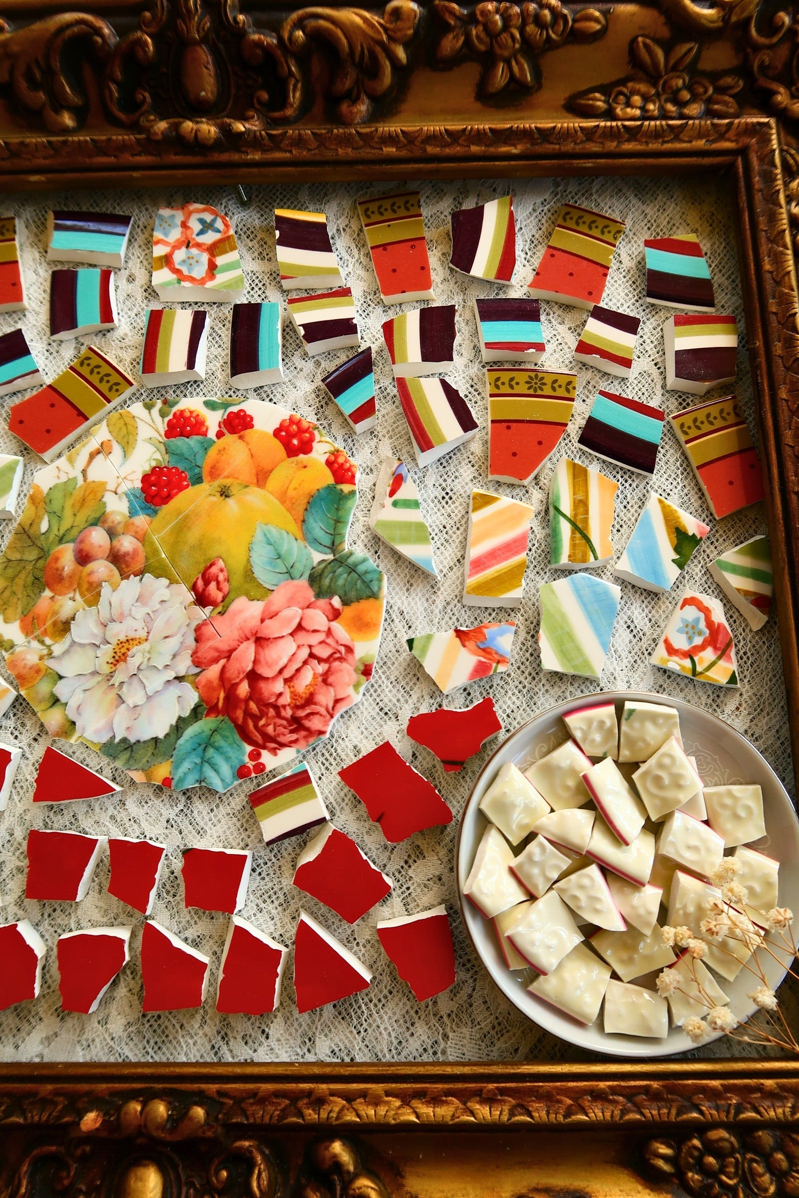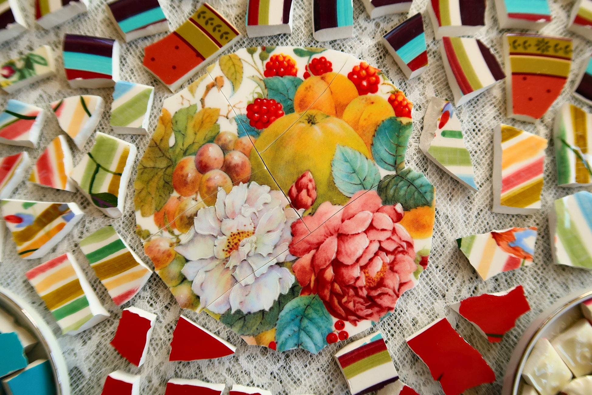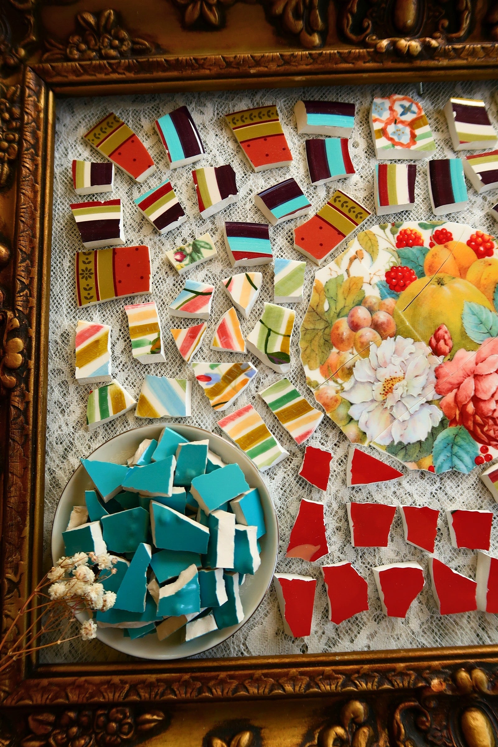 - A hand-selected assortment of broken china Poetic Mosaic tiles