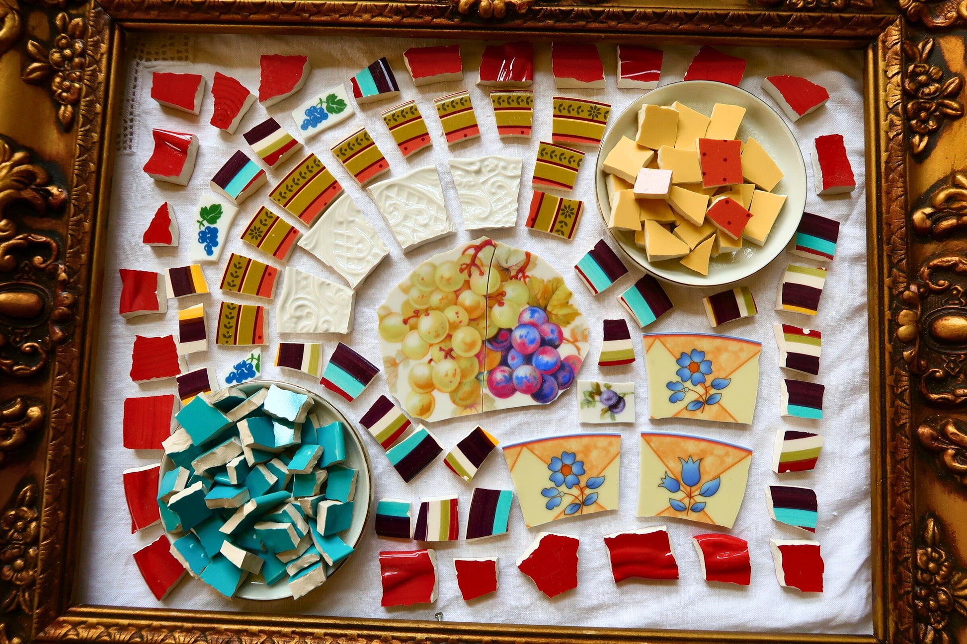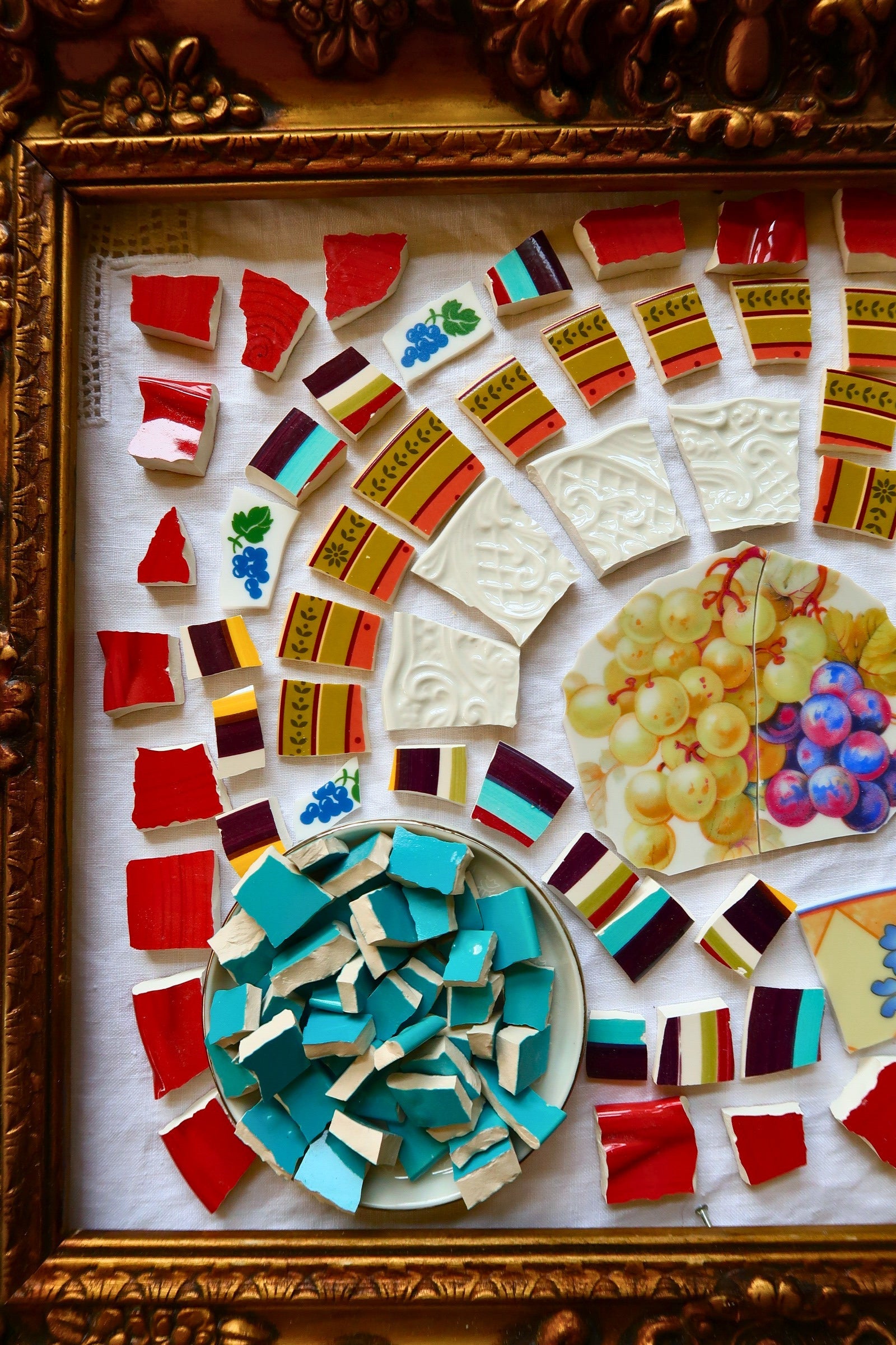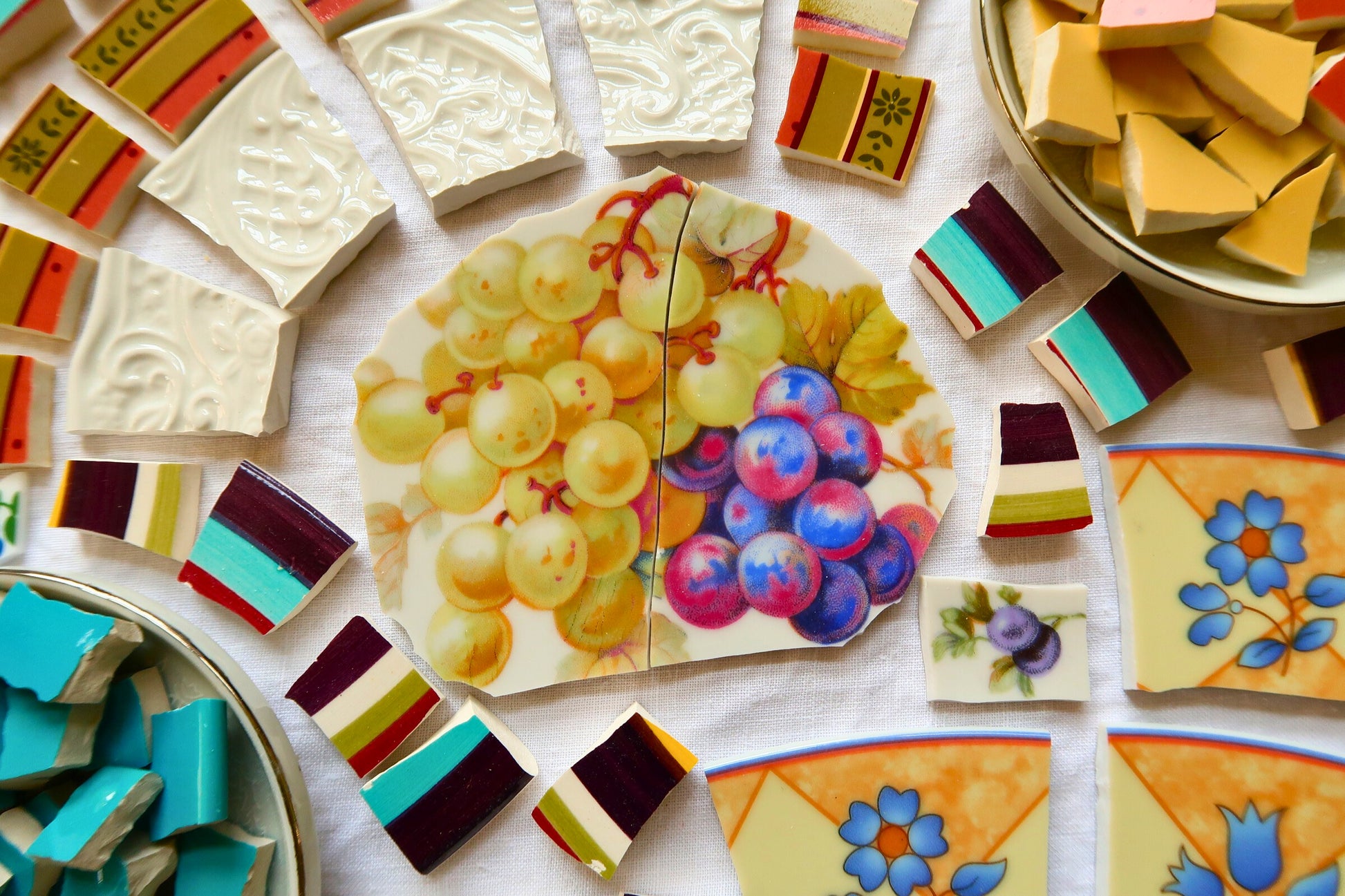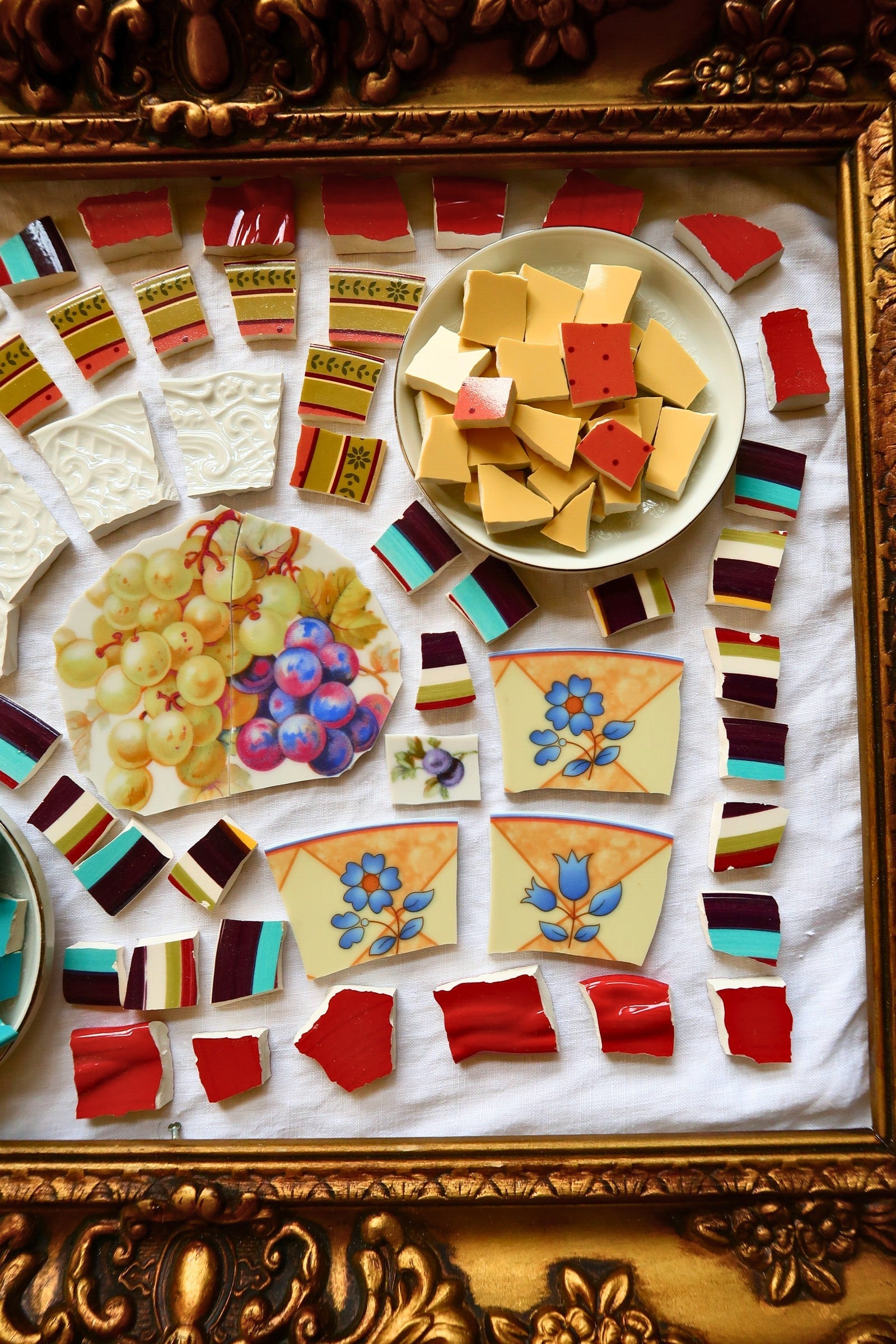 - A hand-selected assortment of broken china Poetic Mosaic tiles
