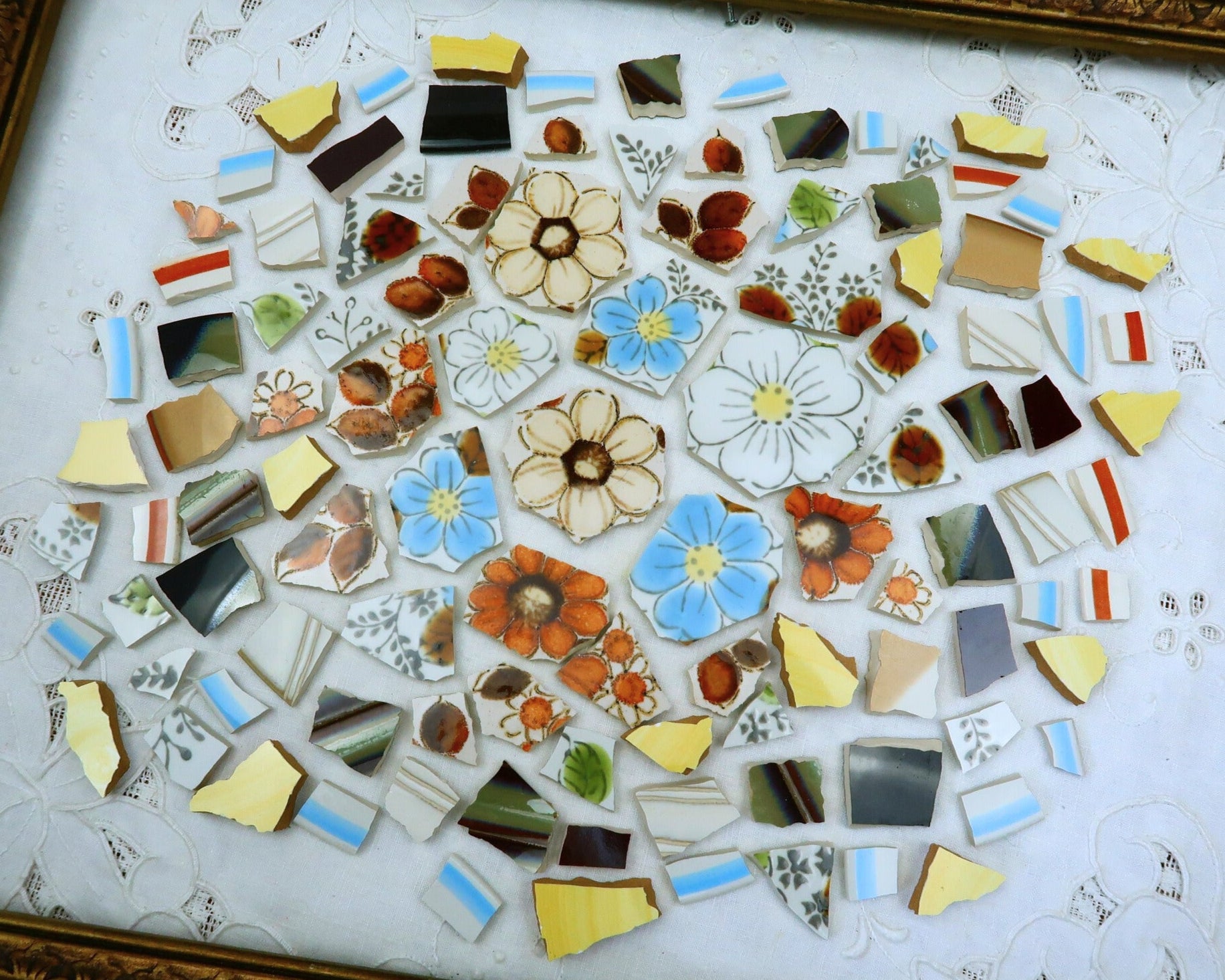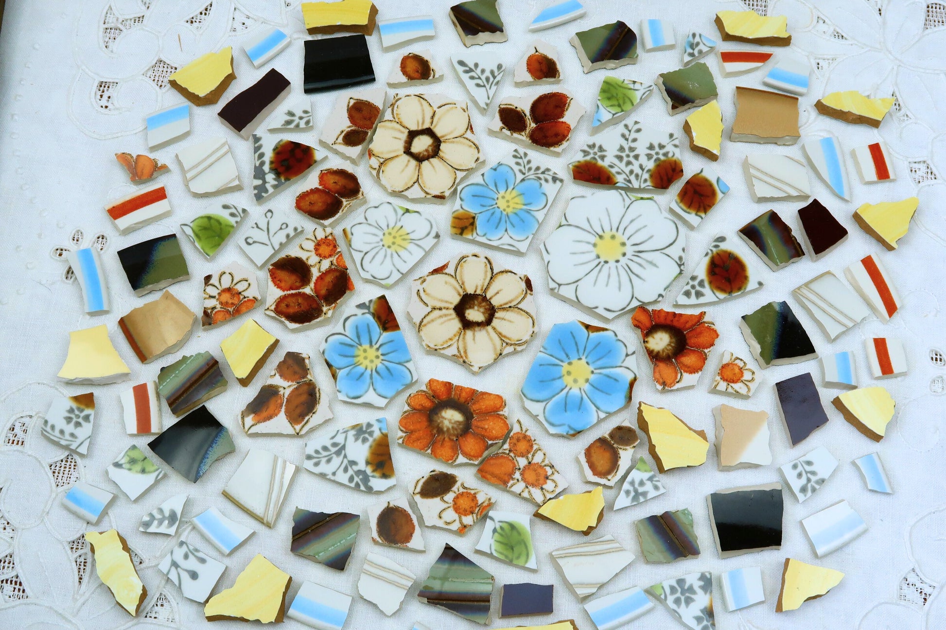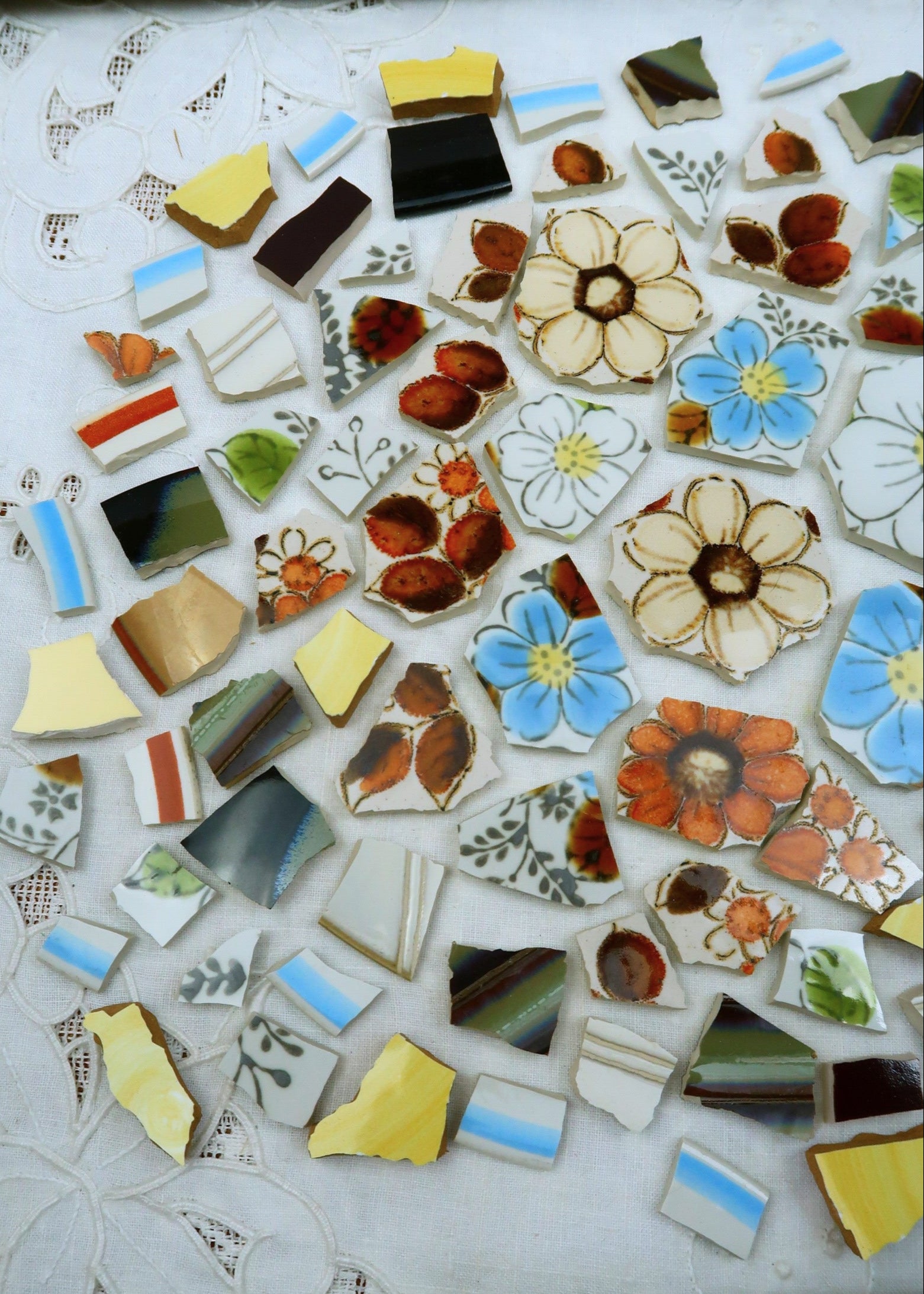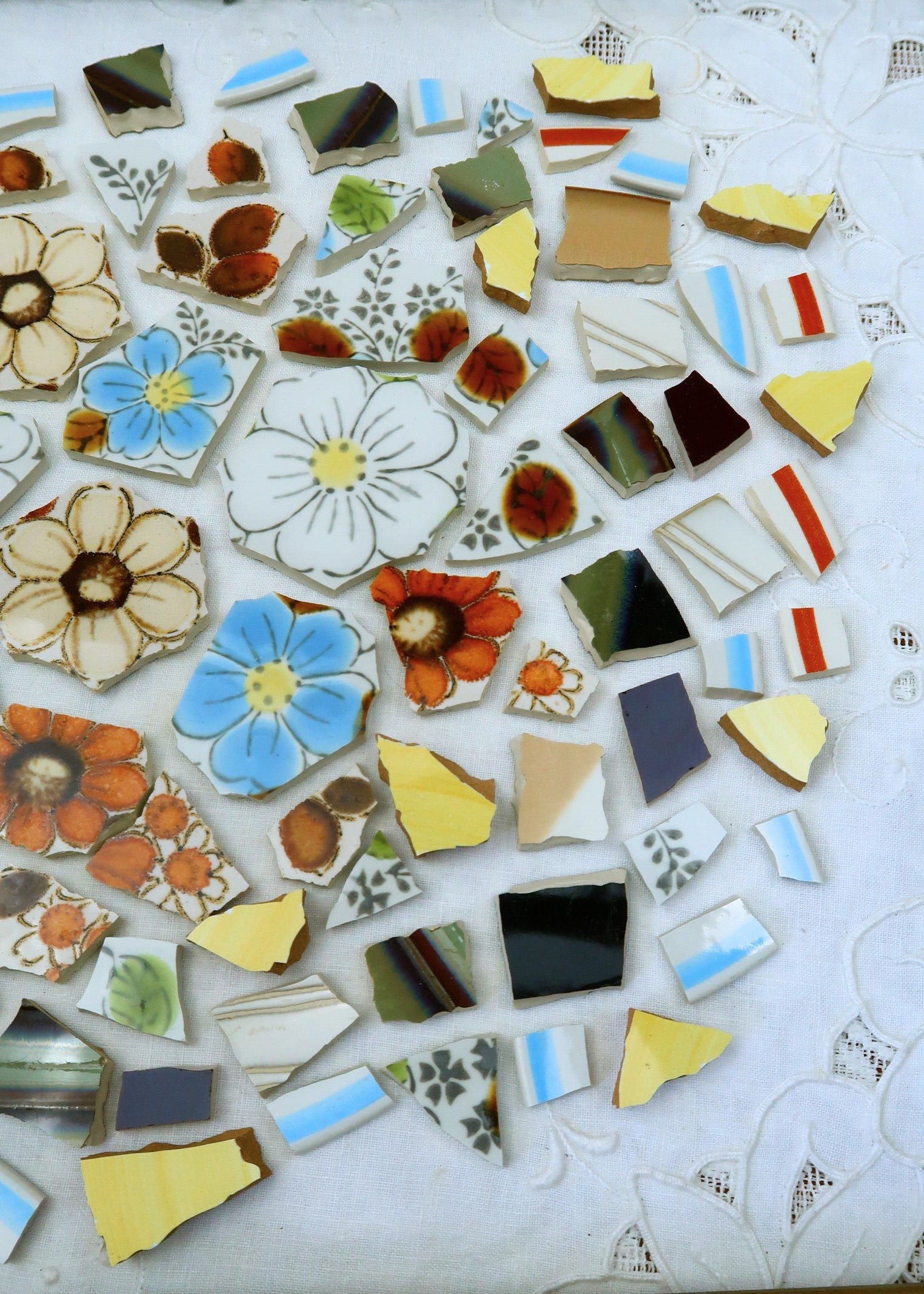 - A hand-selected assortment of broken china Poetic Mosaic tiles