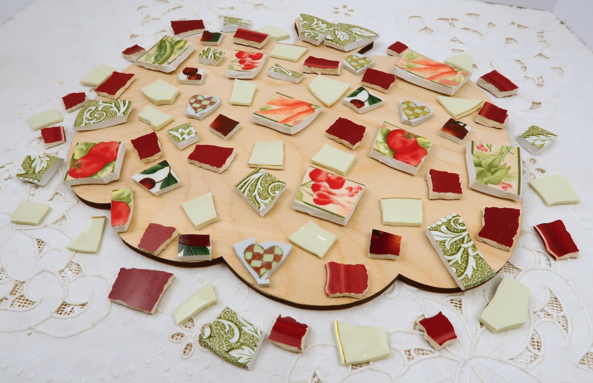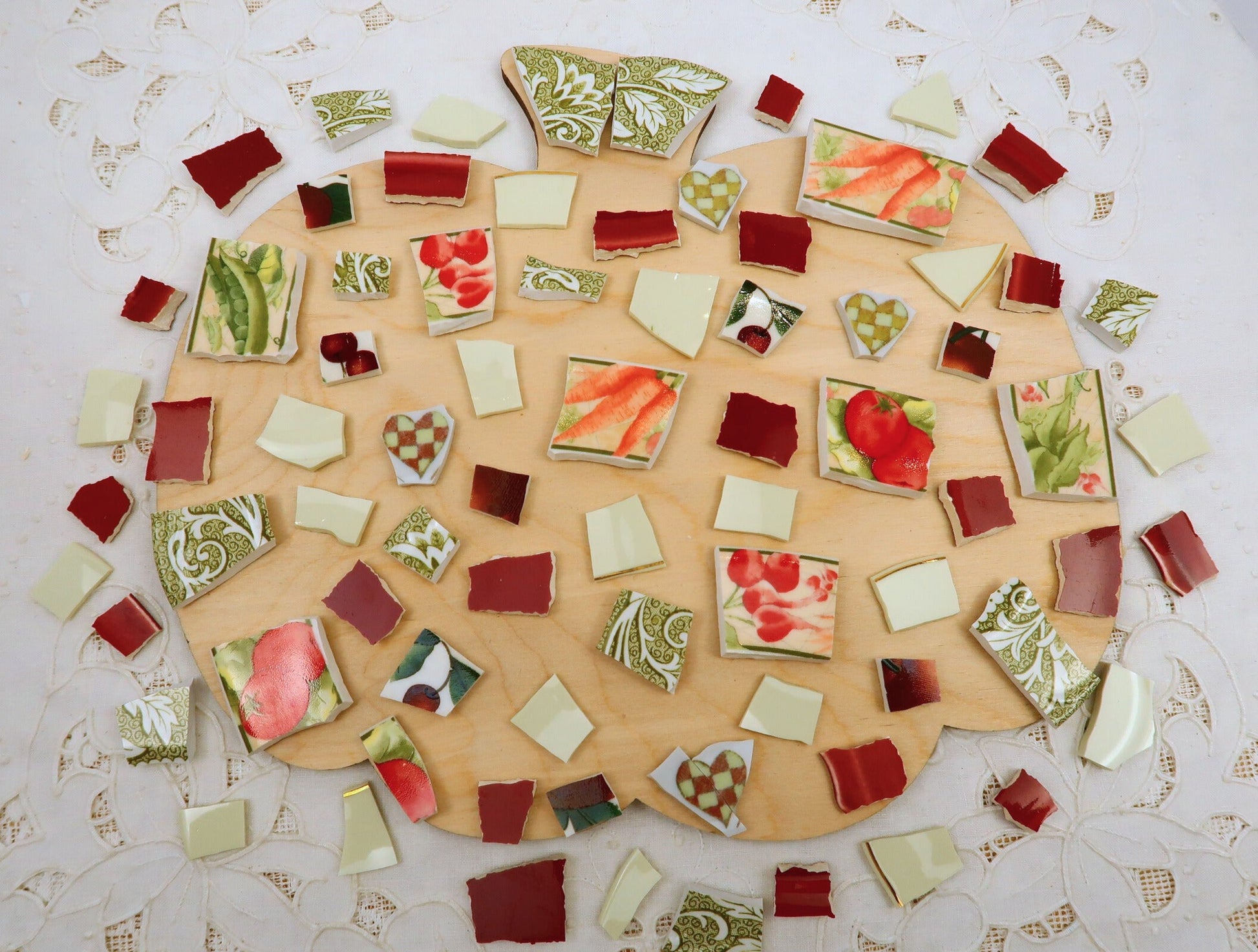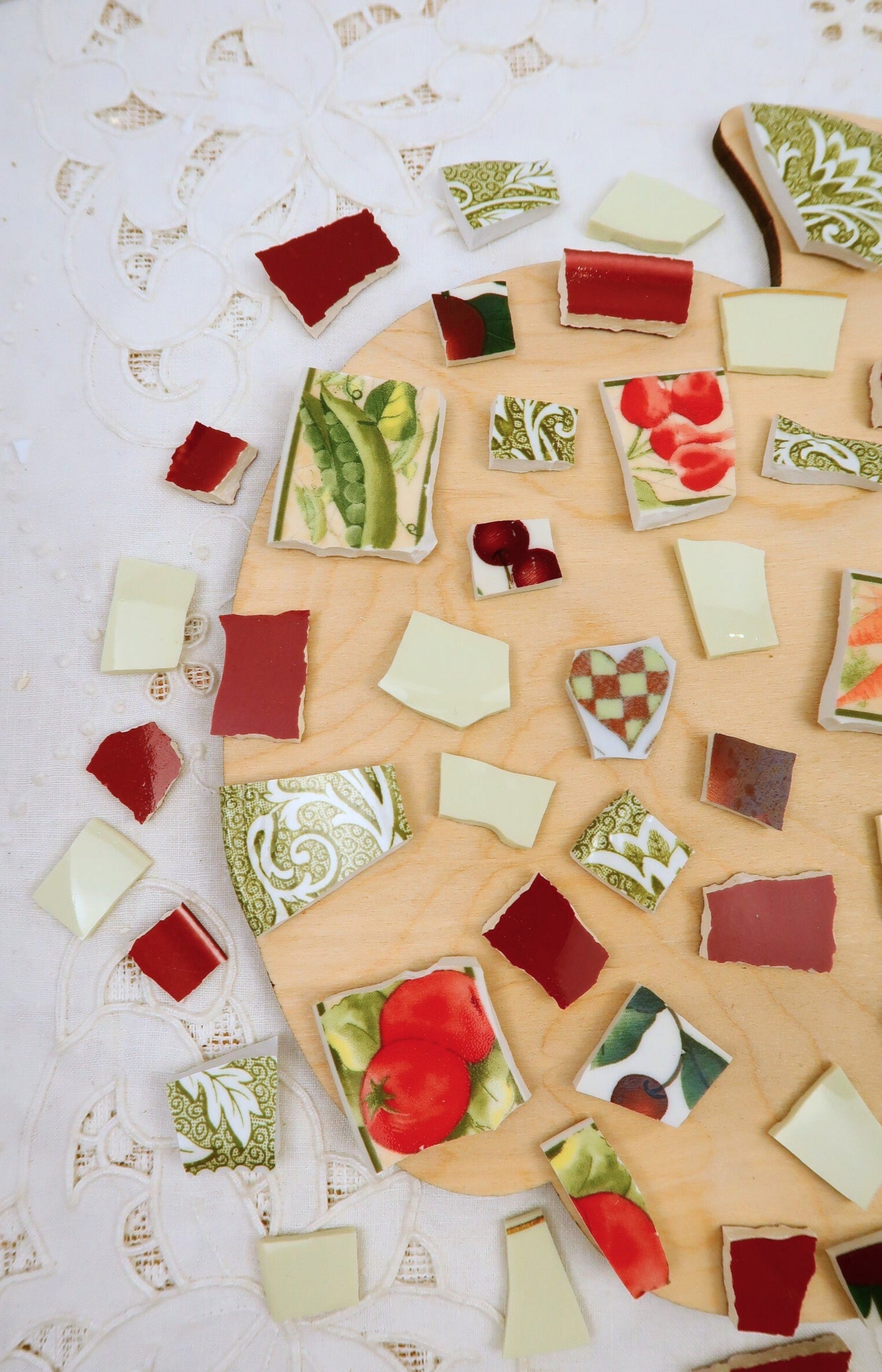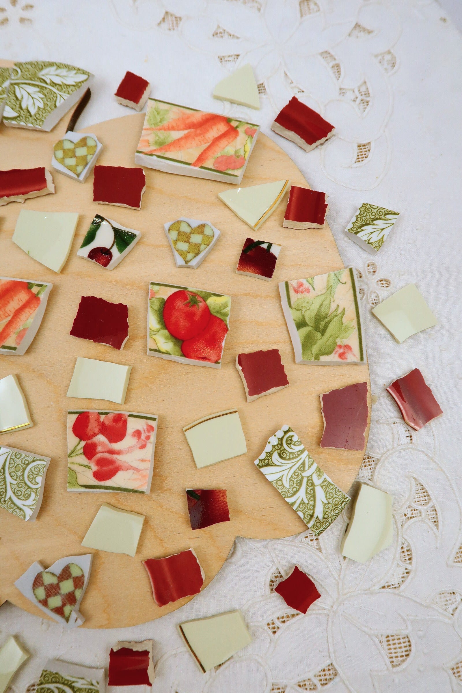 - A hand-selected assortment of broken china Poetic Mosaic tiles