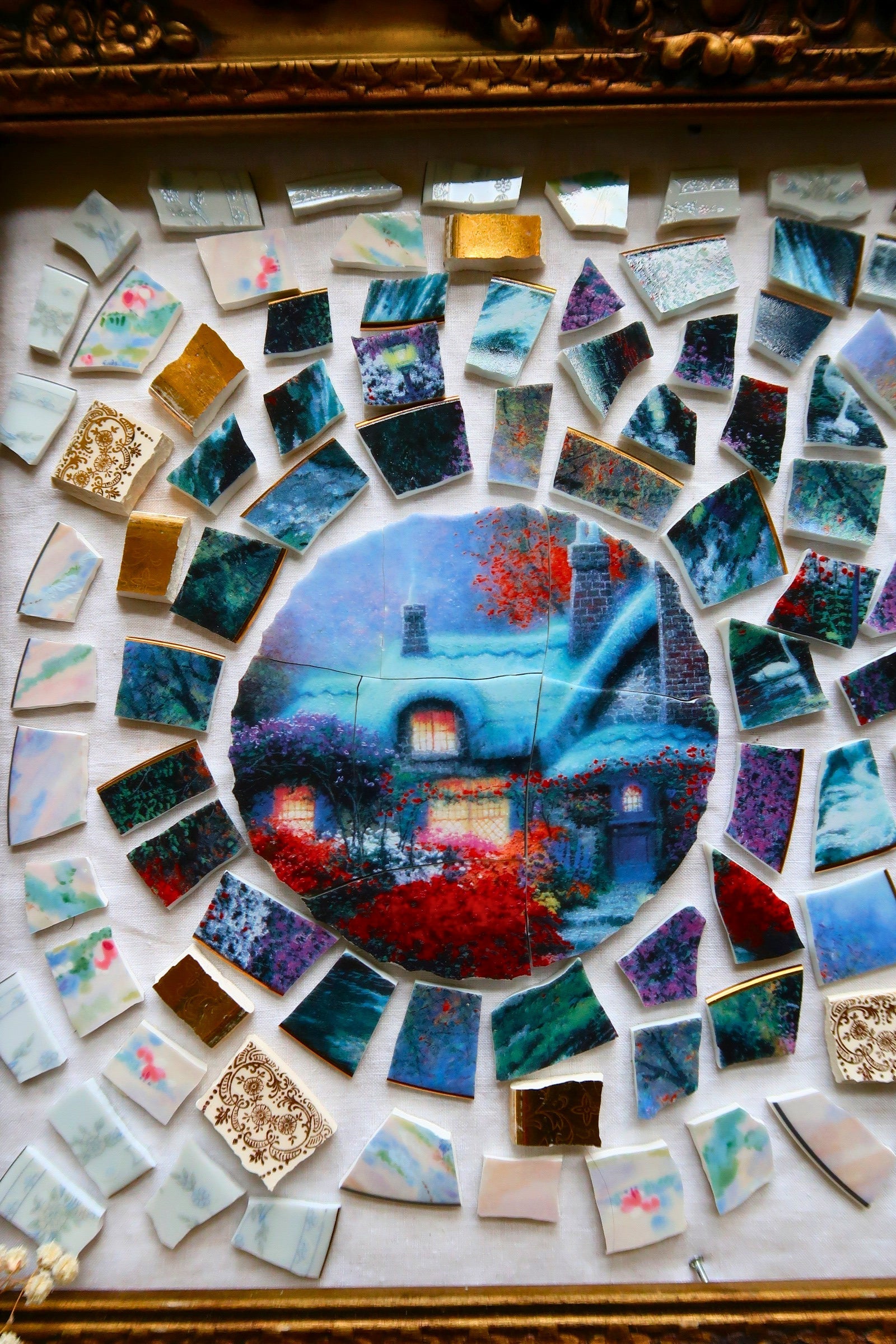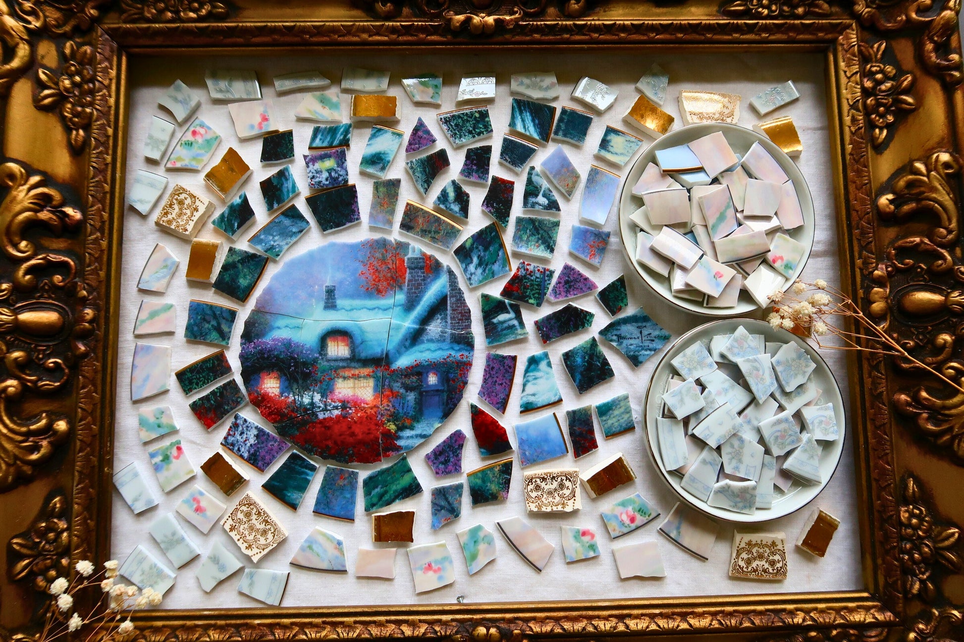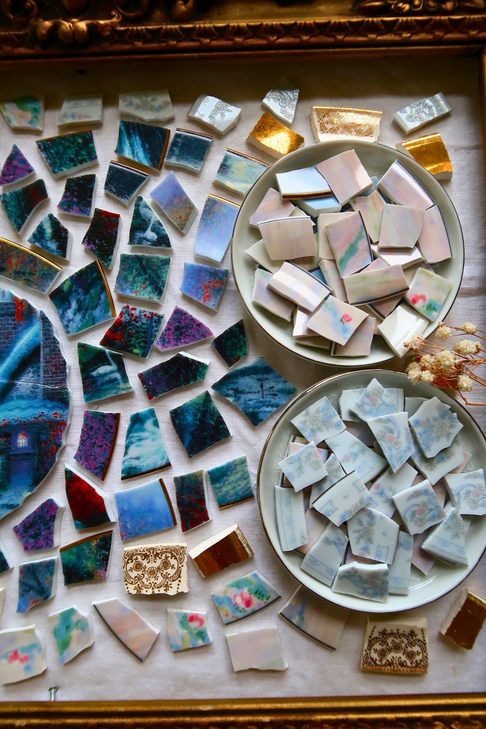 - A hand-selected assortment of broken china Poetic Mosaic tiles