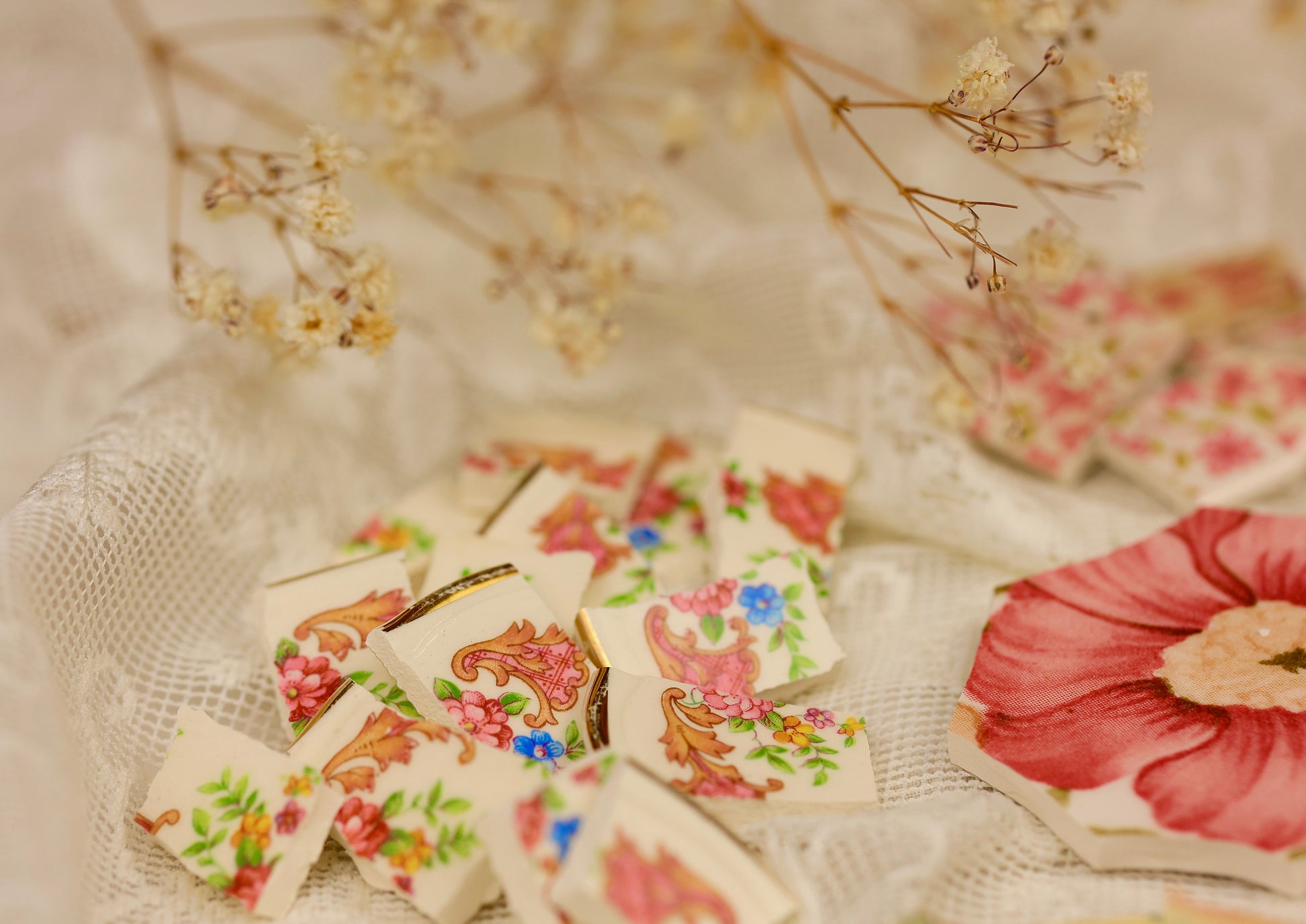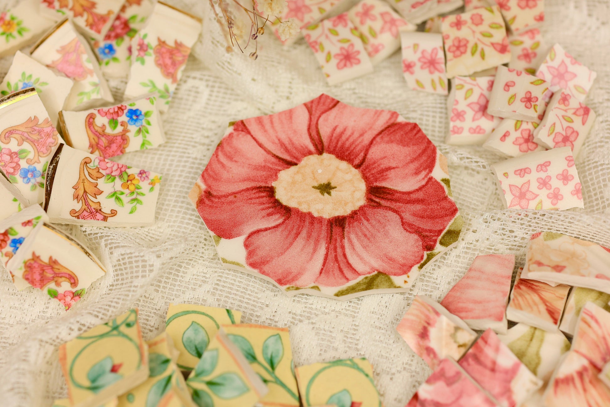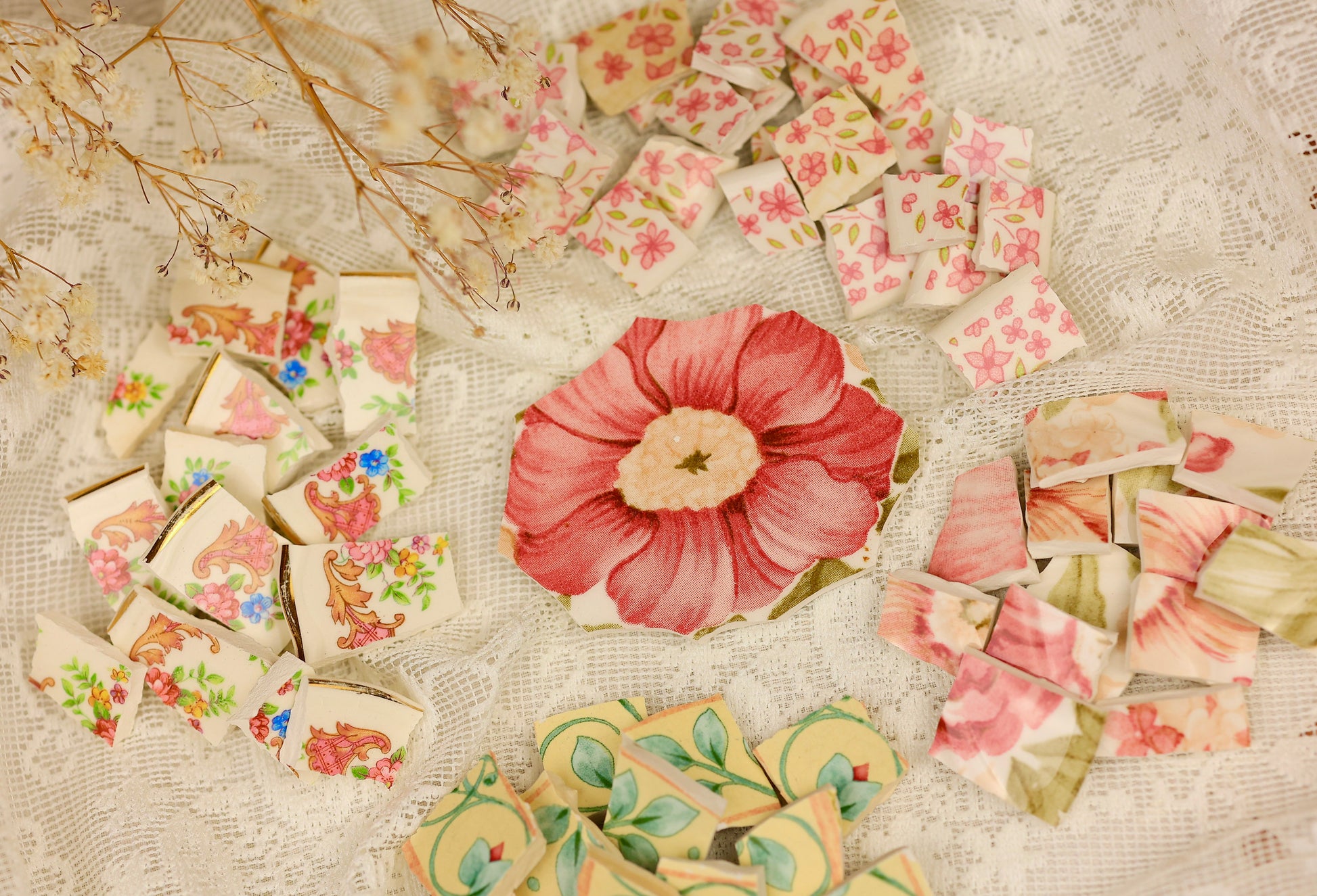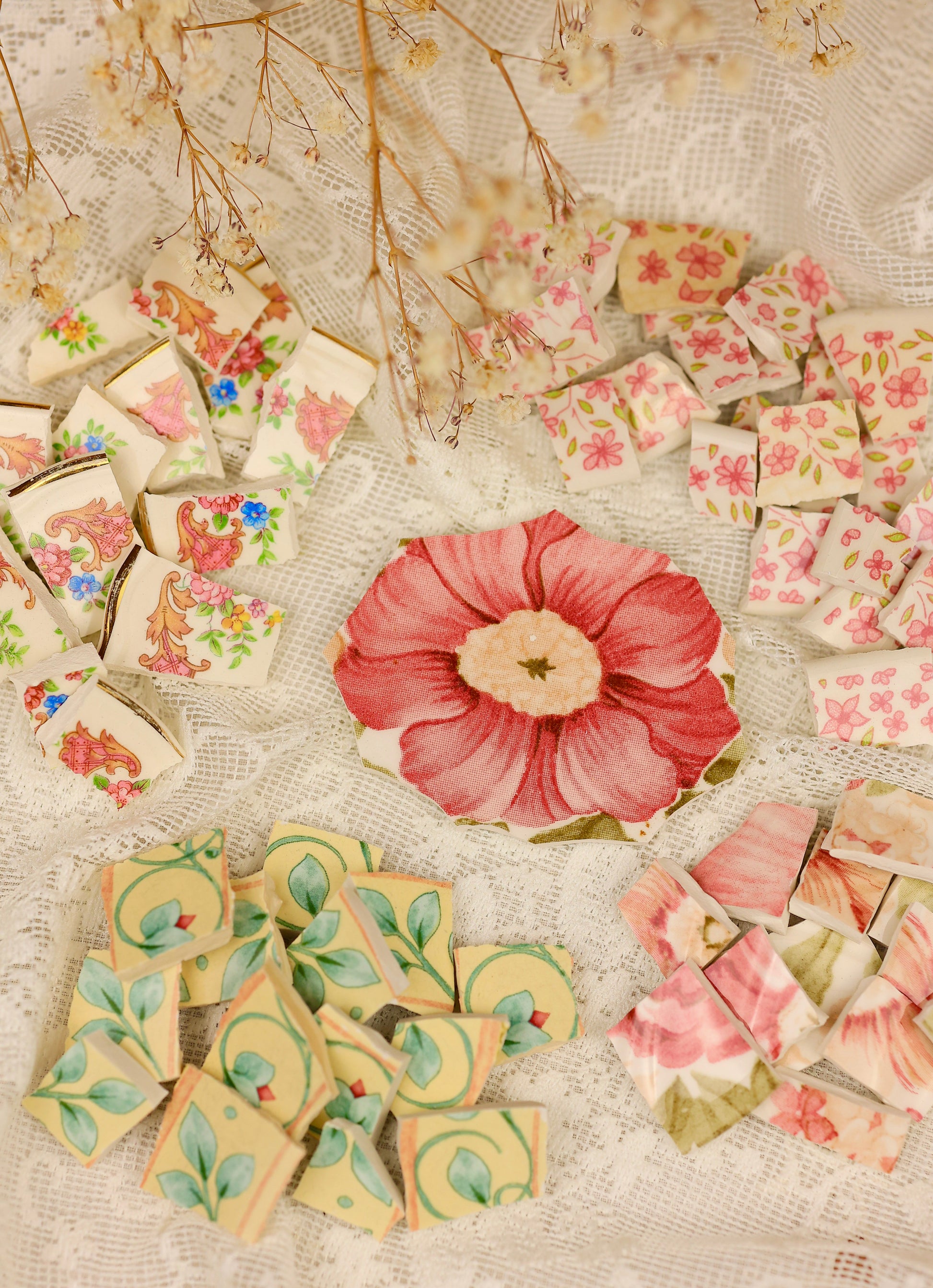 - A hand-selected assortment of broken china Poetic Mosaic tiles