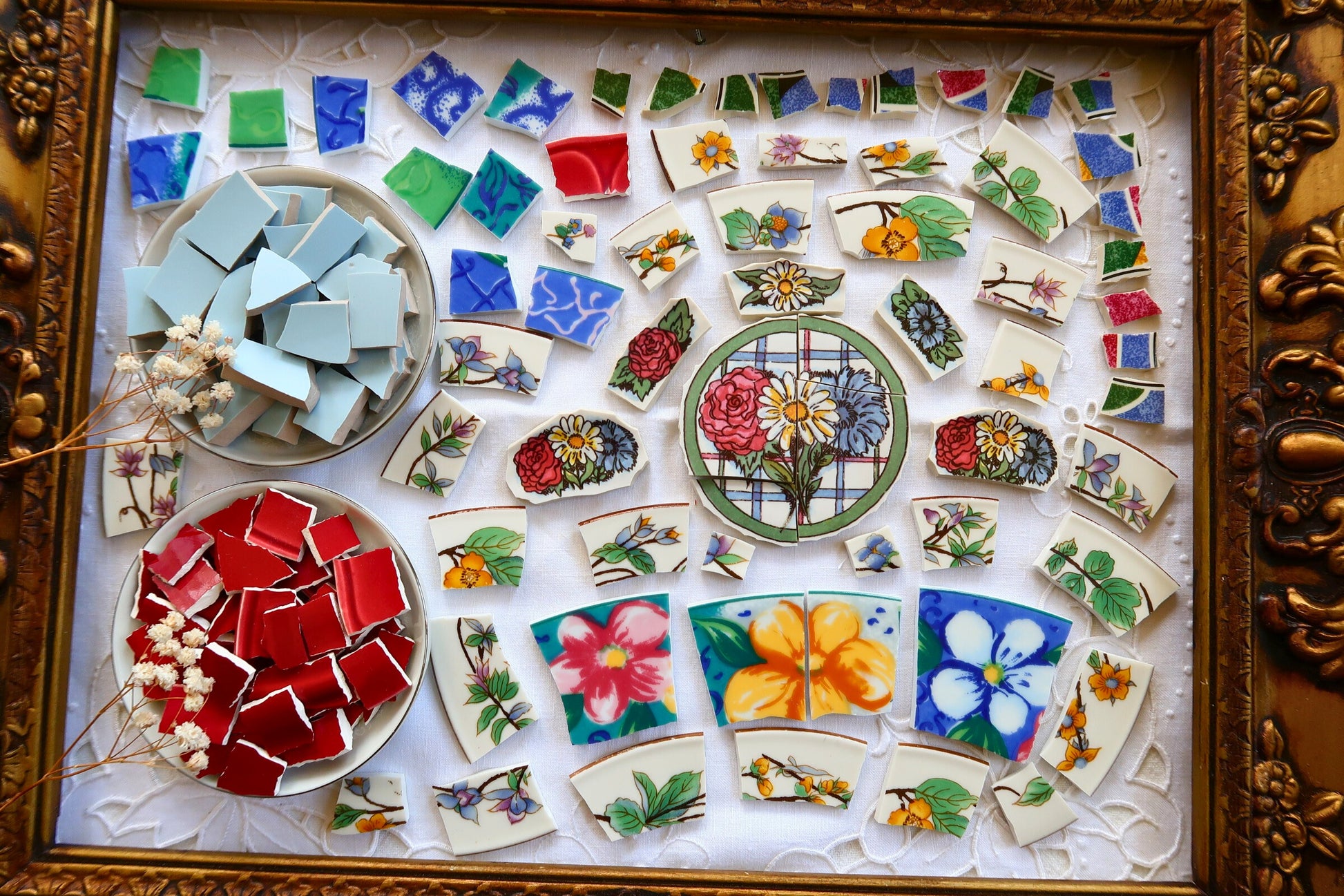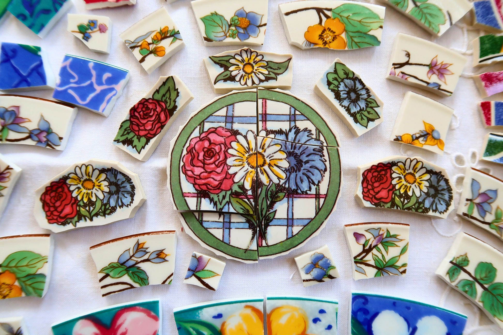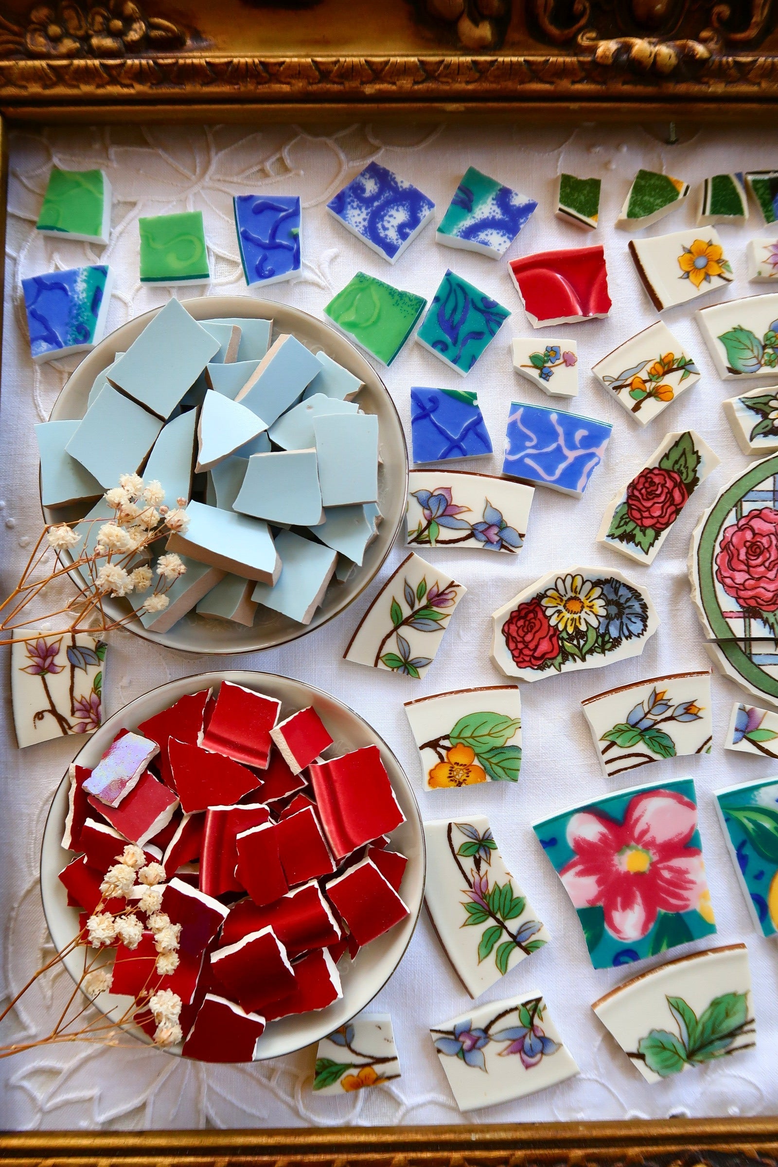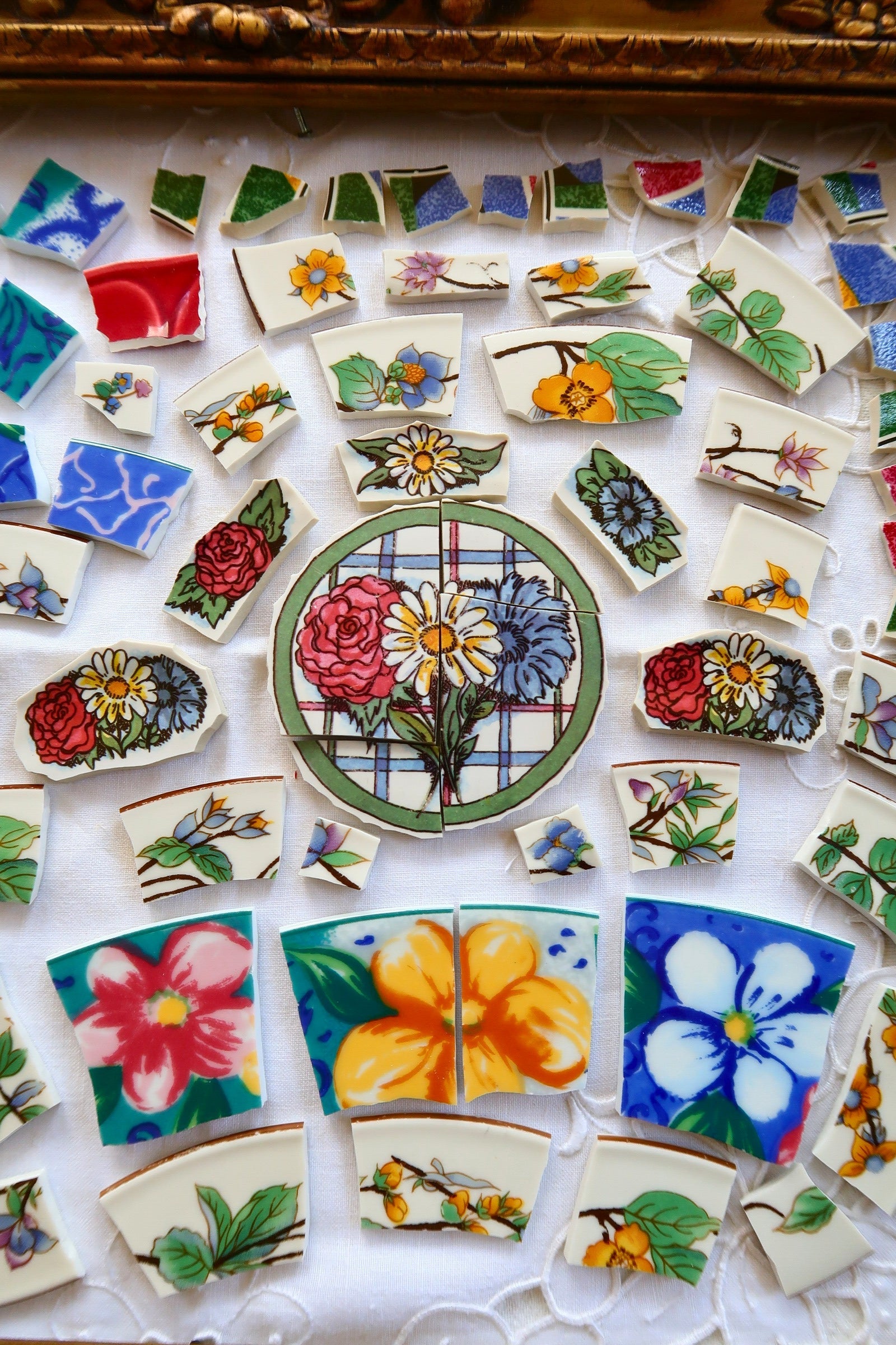 - A hand-selected assortment of broken china Poetic Mosaic tiles