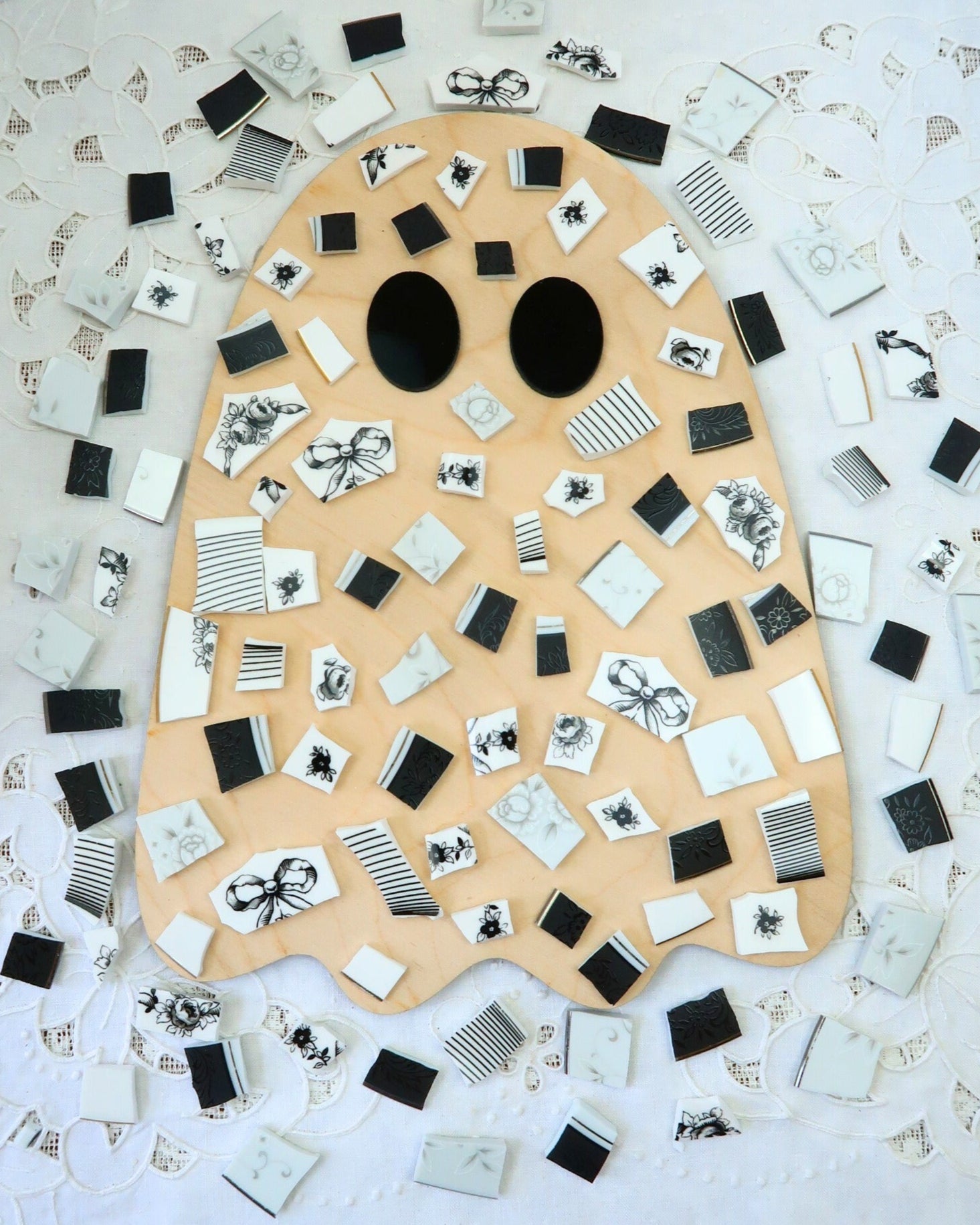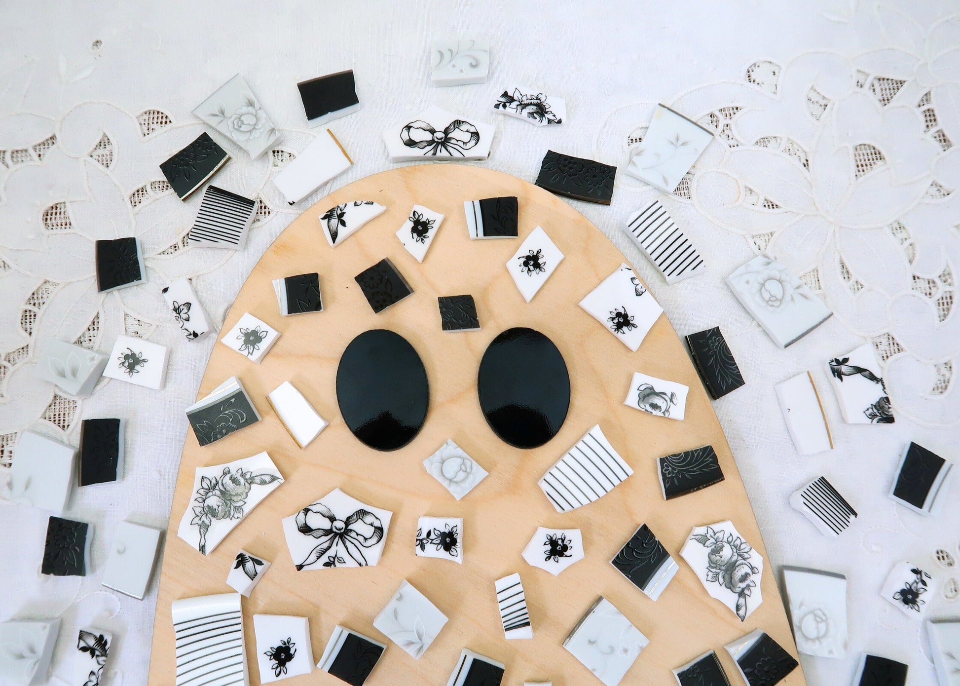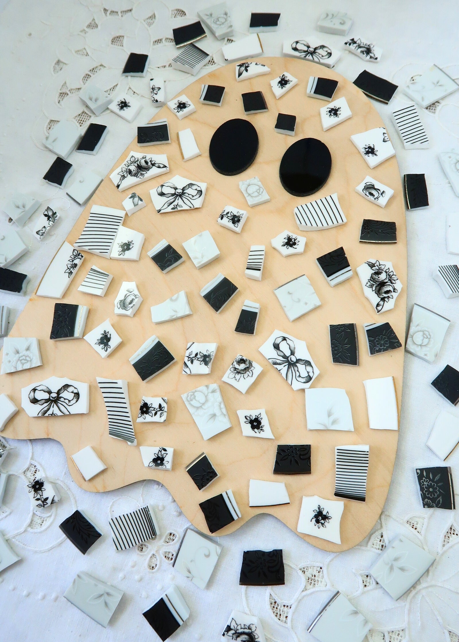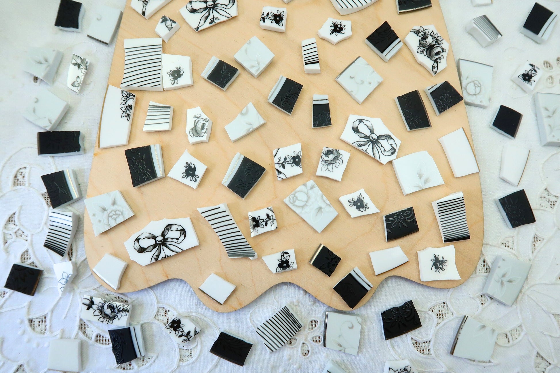 - A hand-selected assortment of broken china Poetic Mosaic tiles