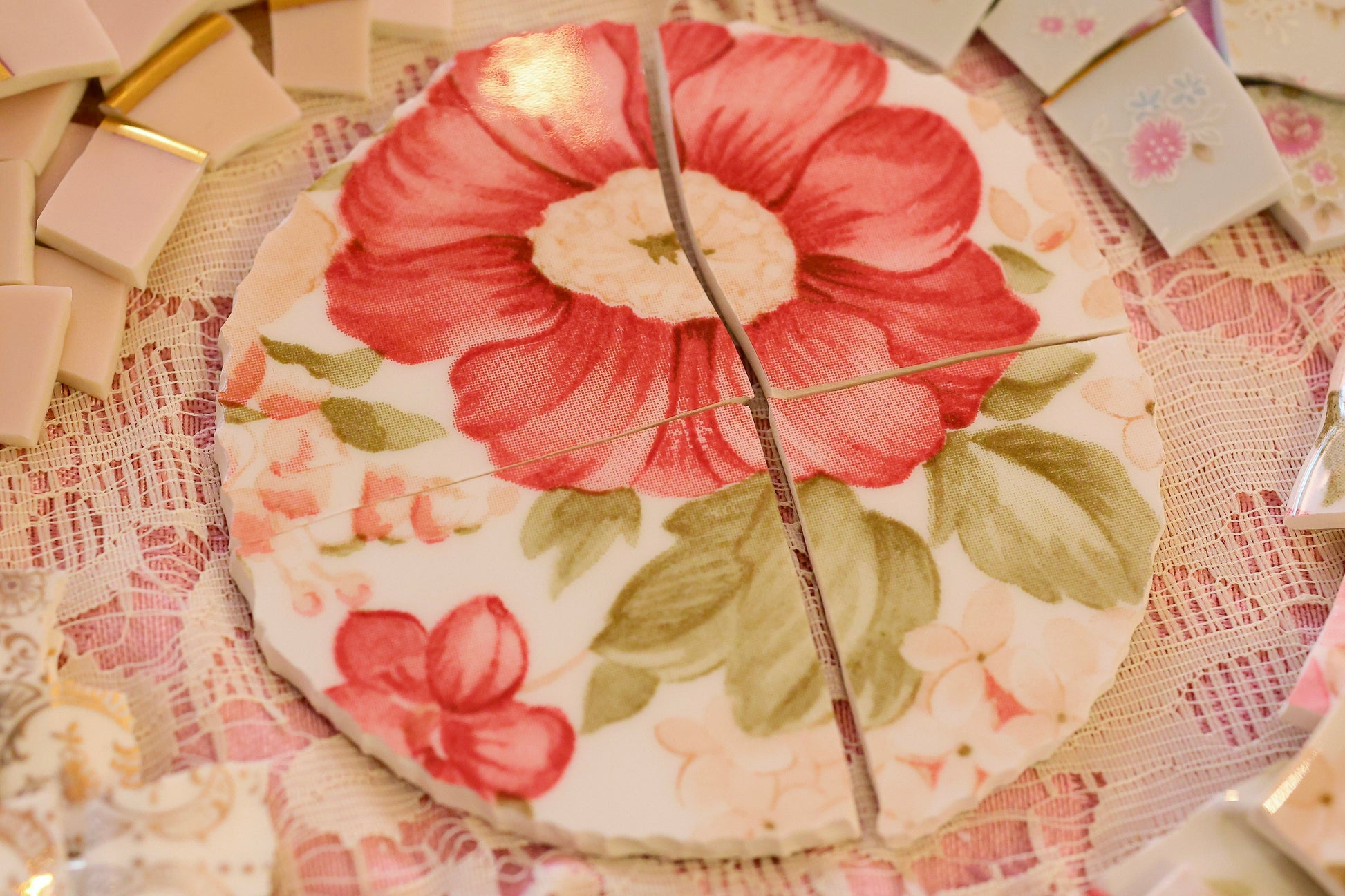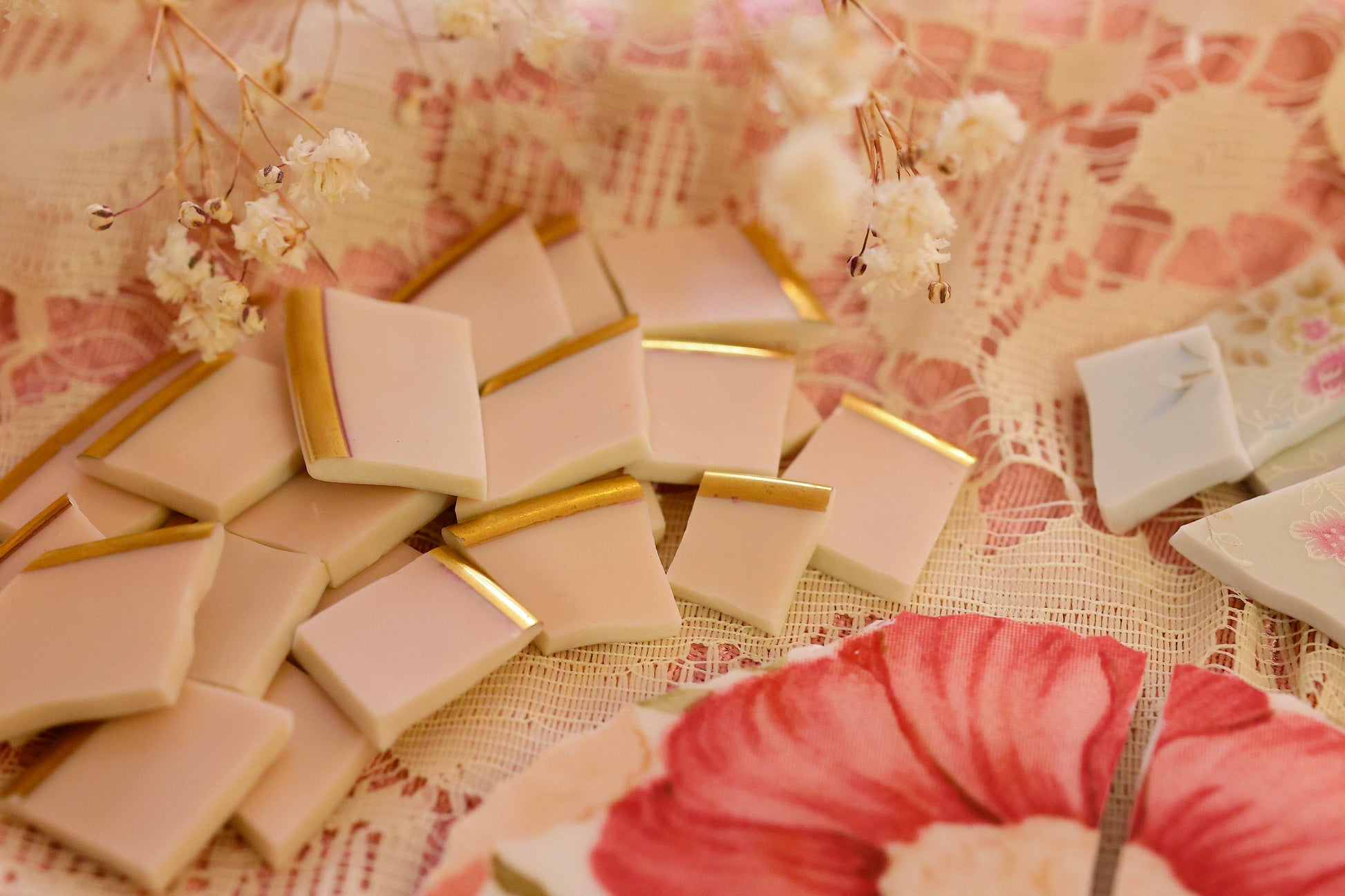 - A hand-selected assortment of broken china Poetic Mosaic tiles