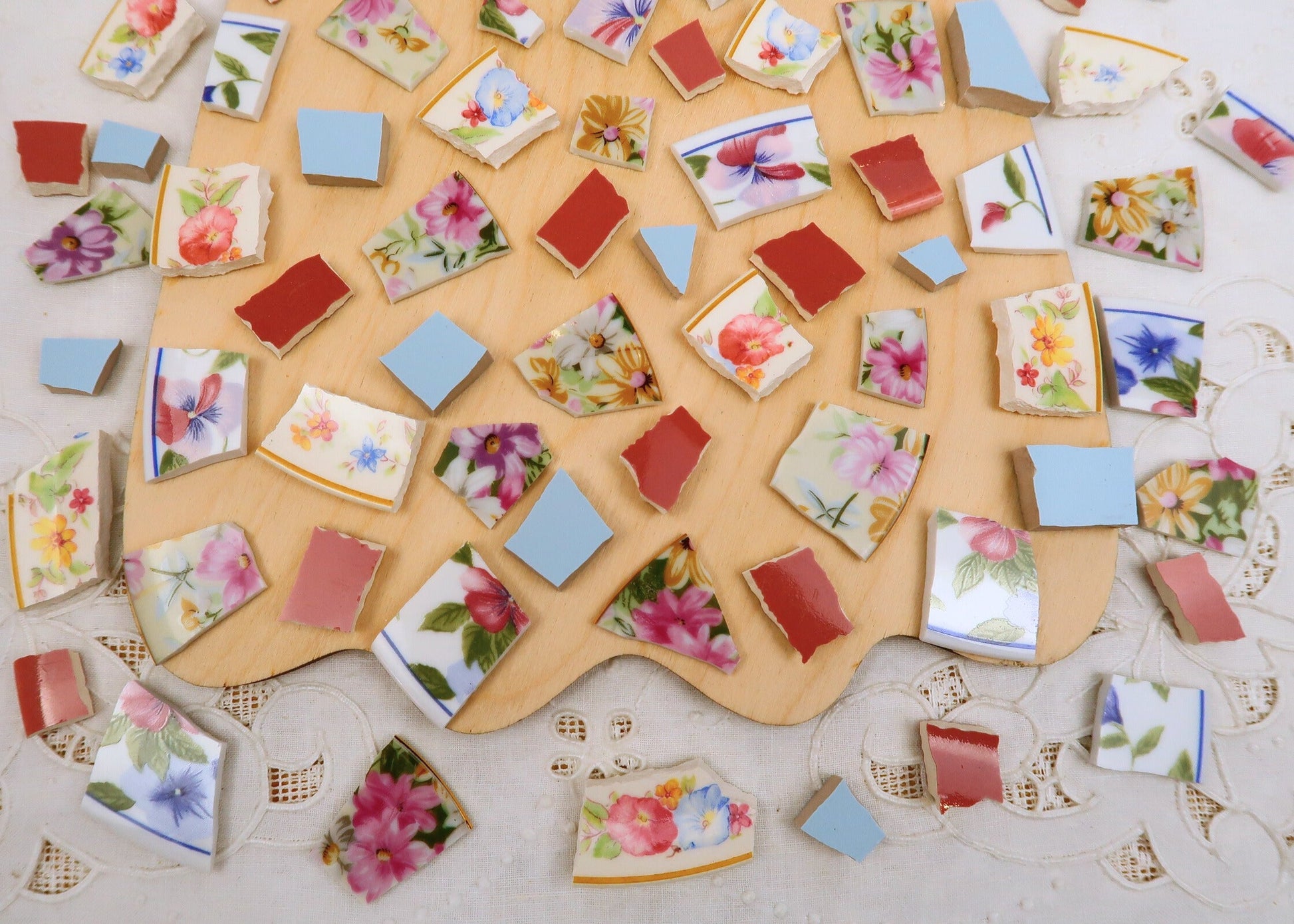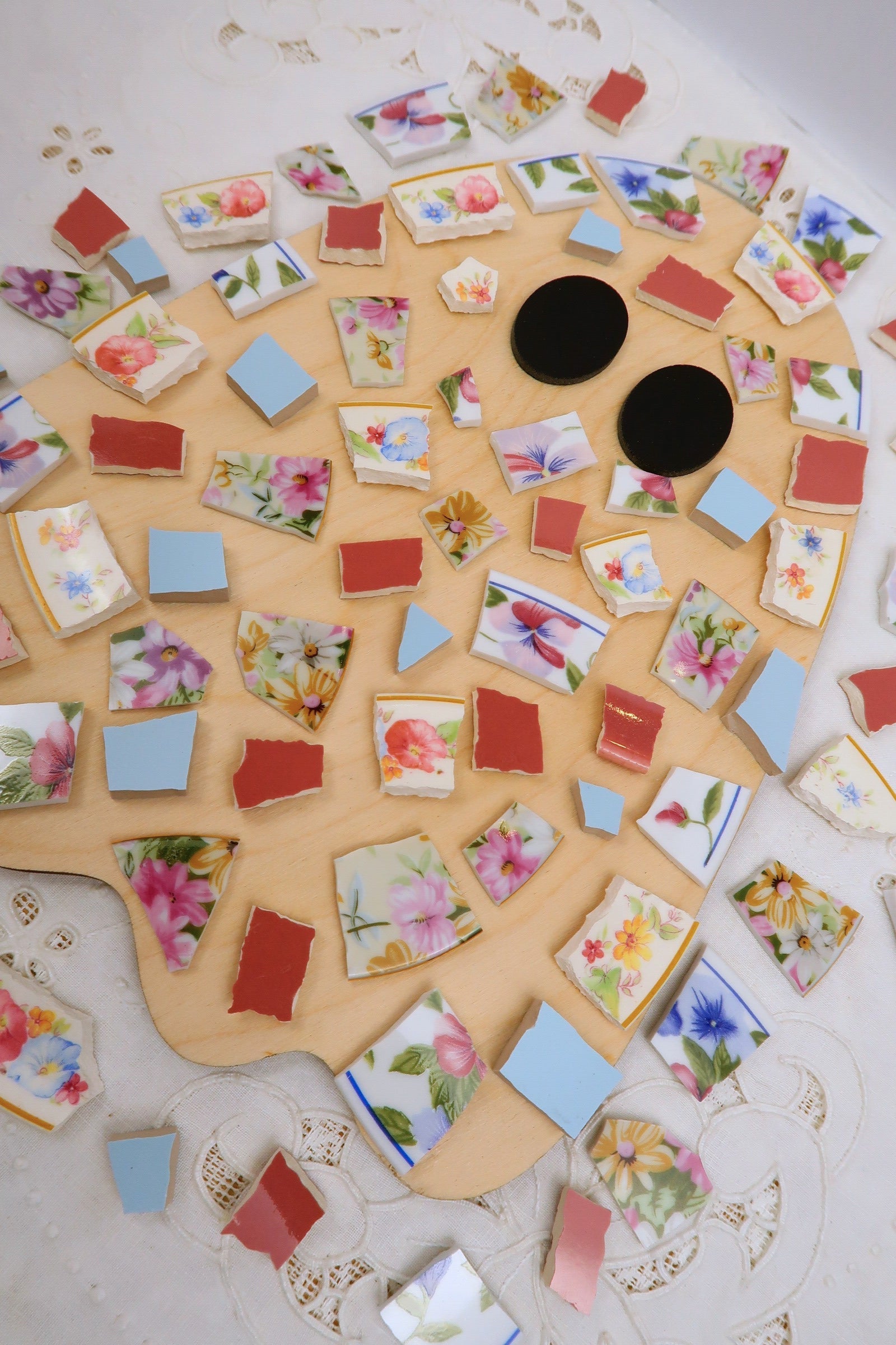 - A hand-selected assortment of broken china Poetic Mosaic tiles