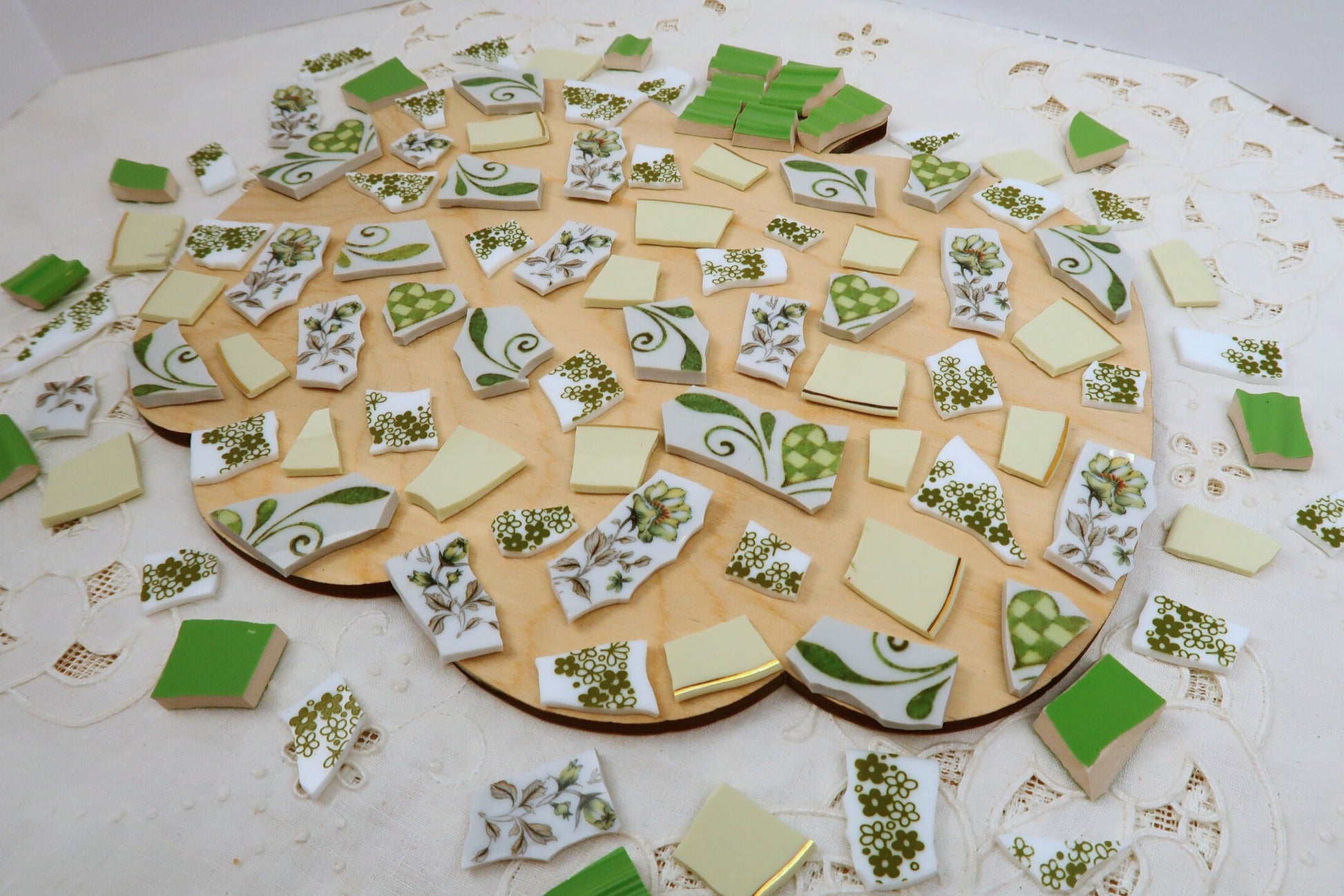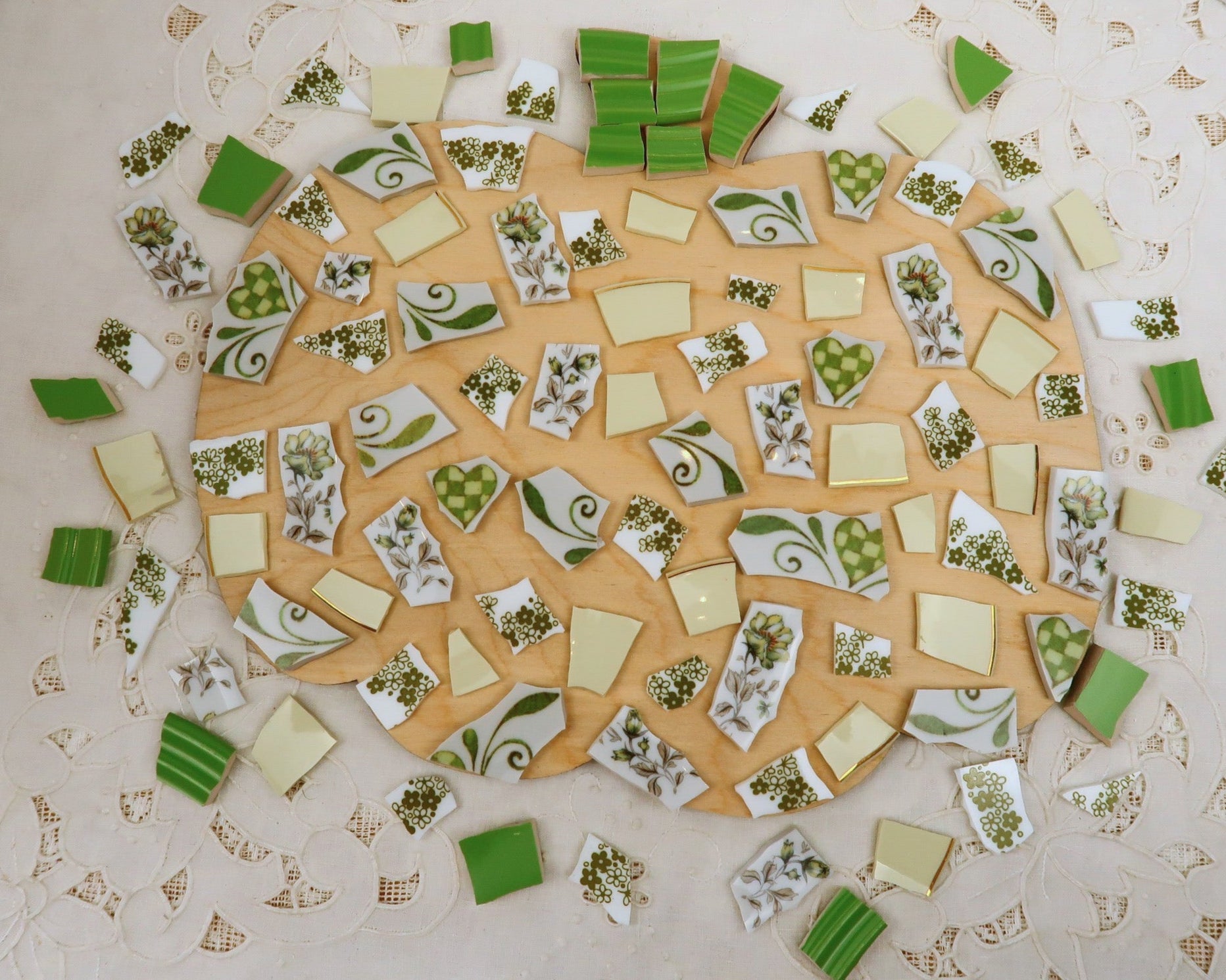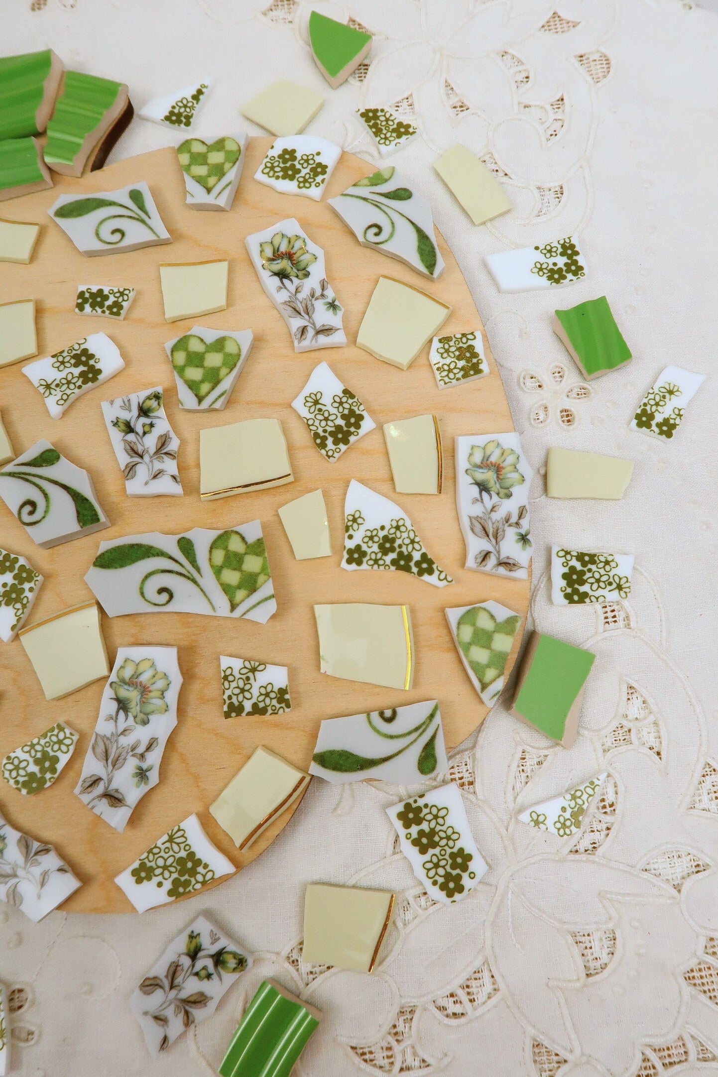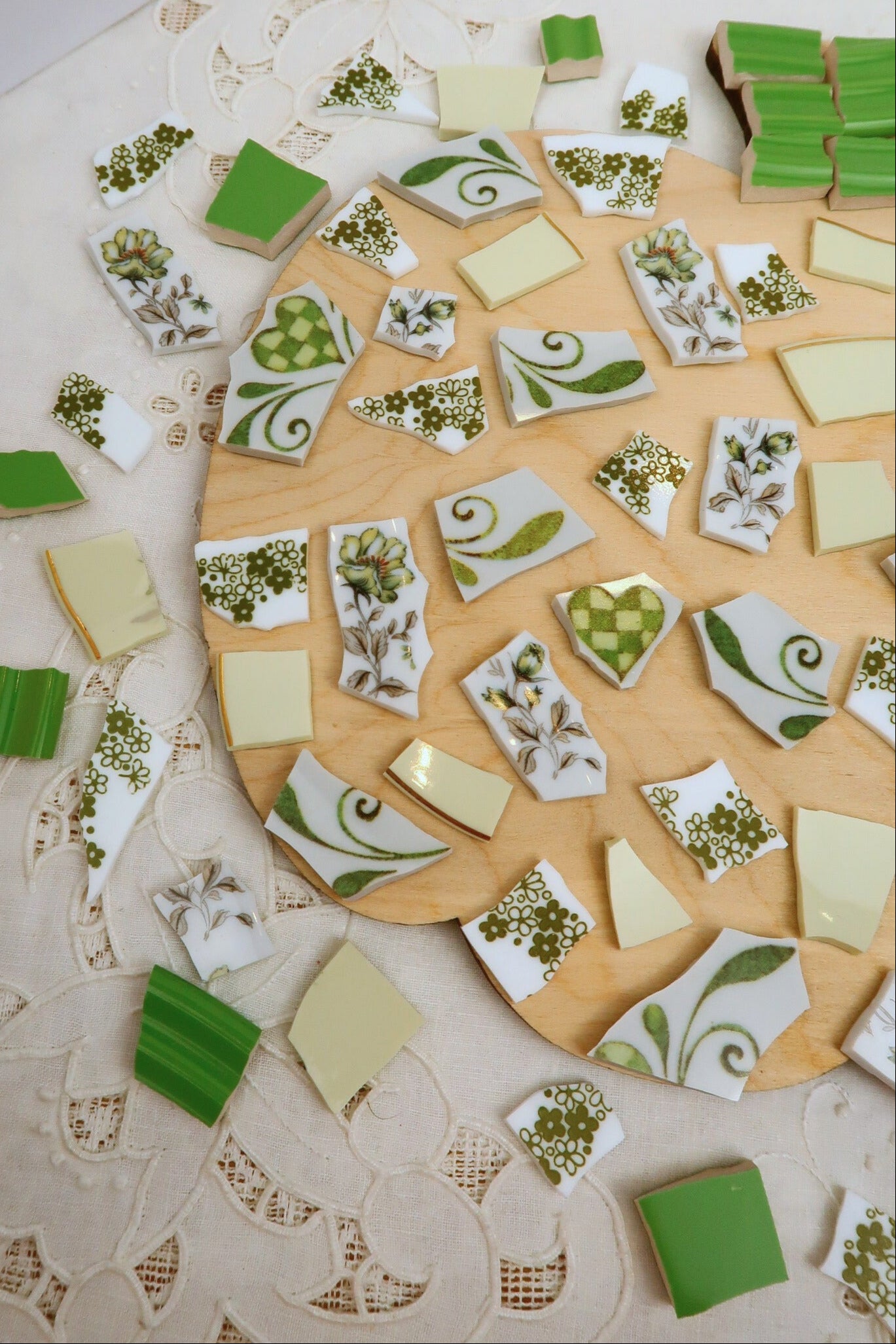 - A hand-selected assortment of broken china Poetic Mosaic tiles