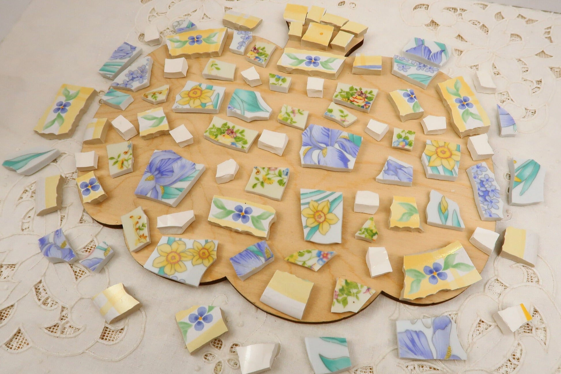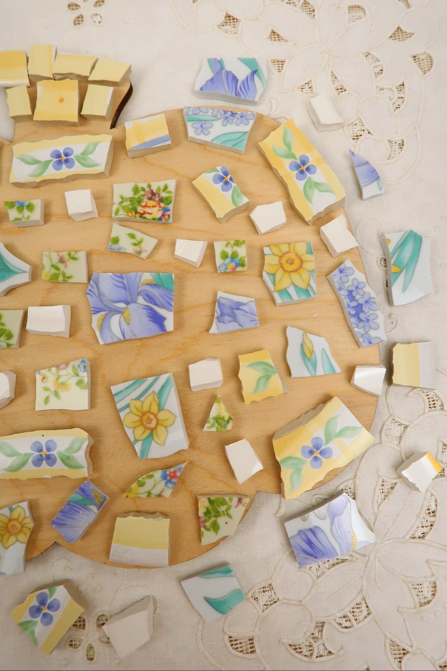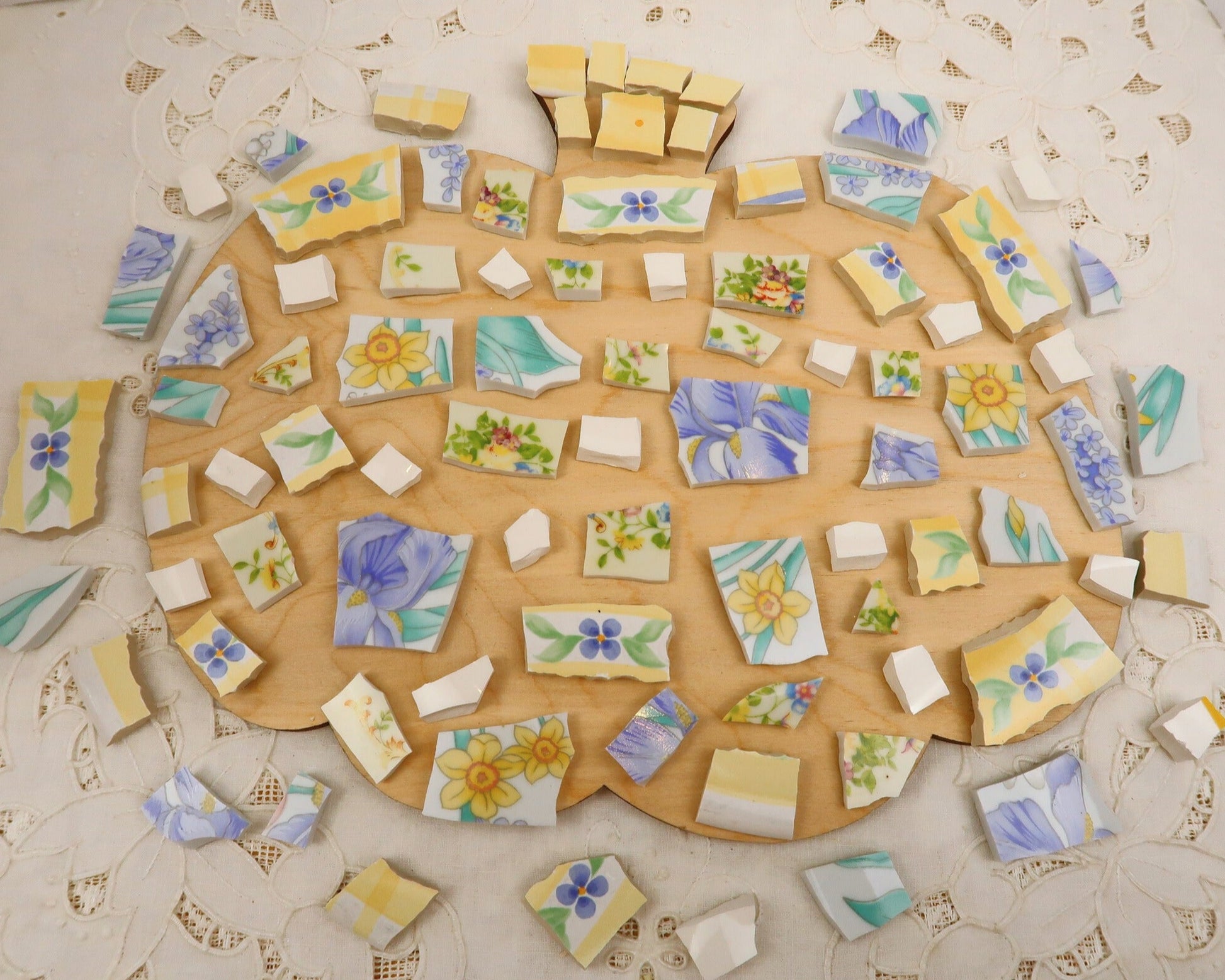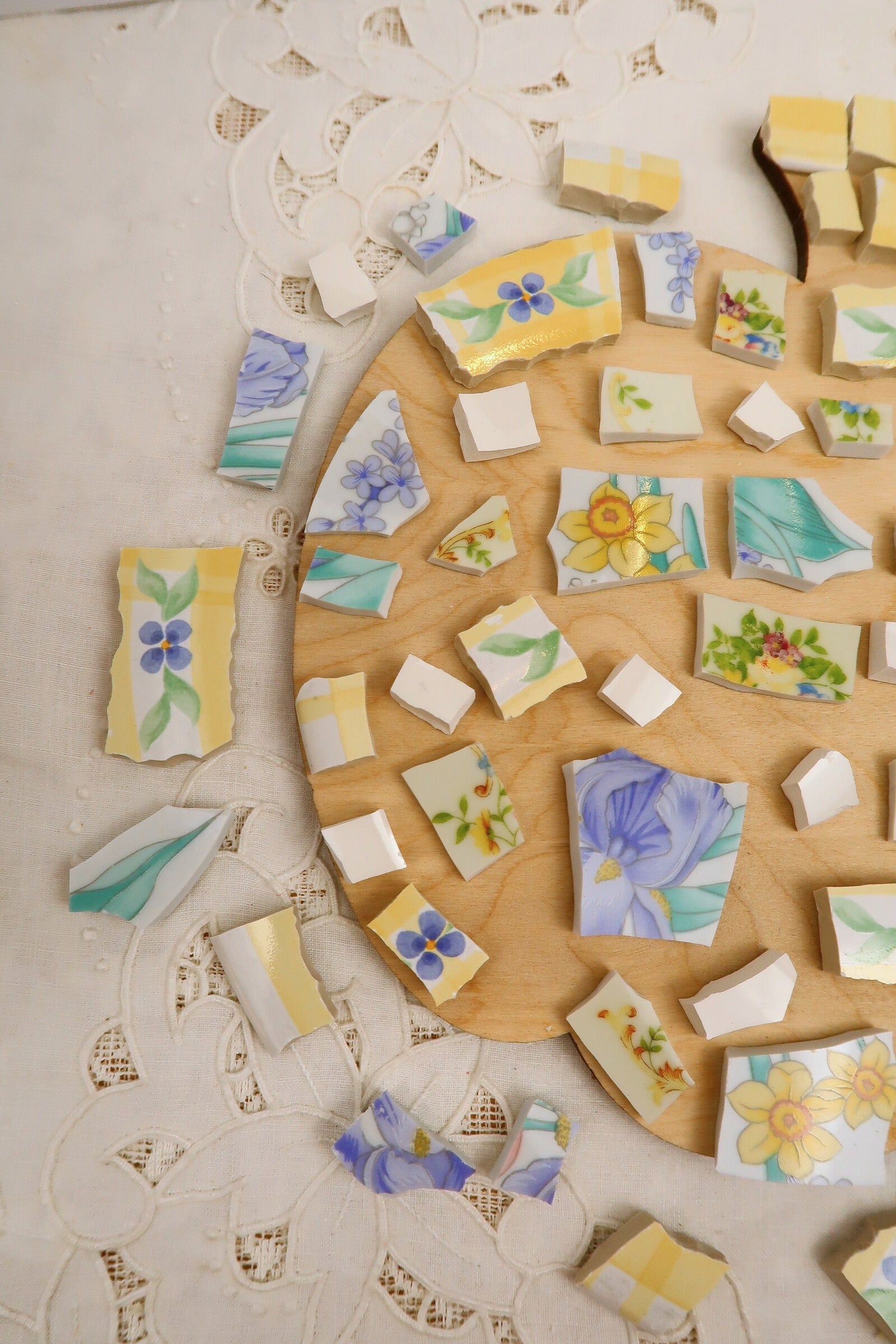 - A hand-selected assortment of broken china Poetic Mosaic tiles