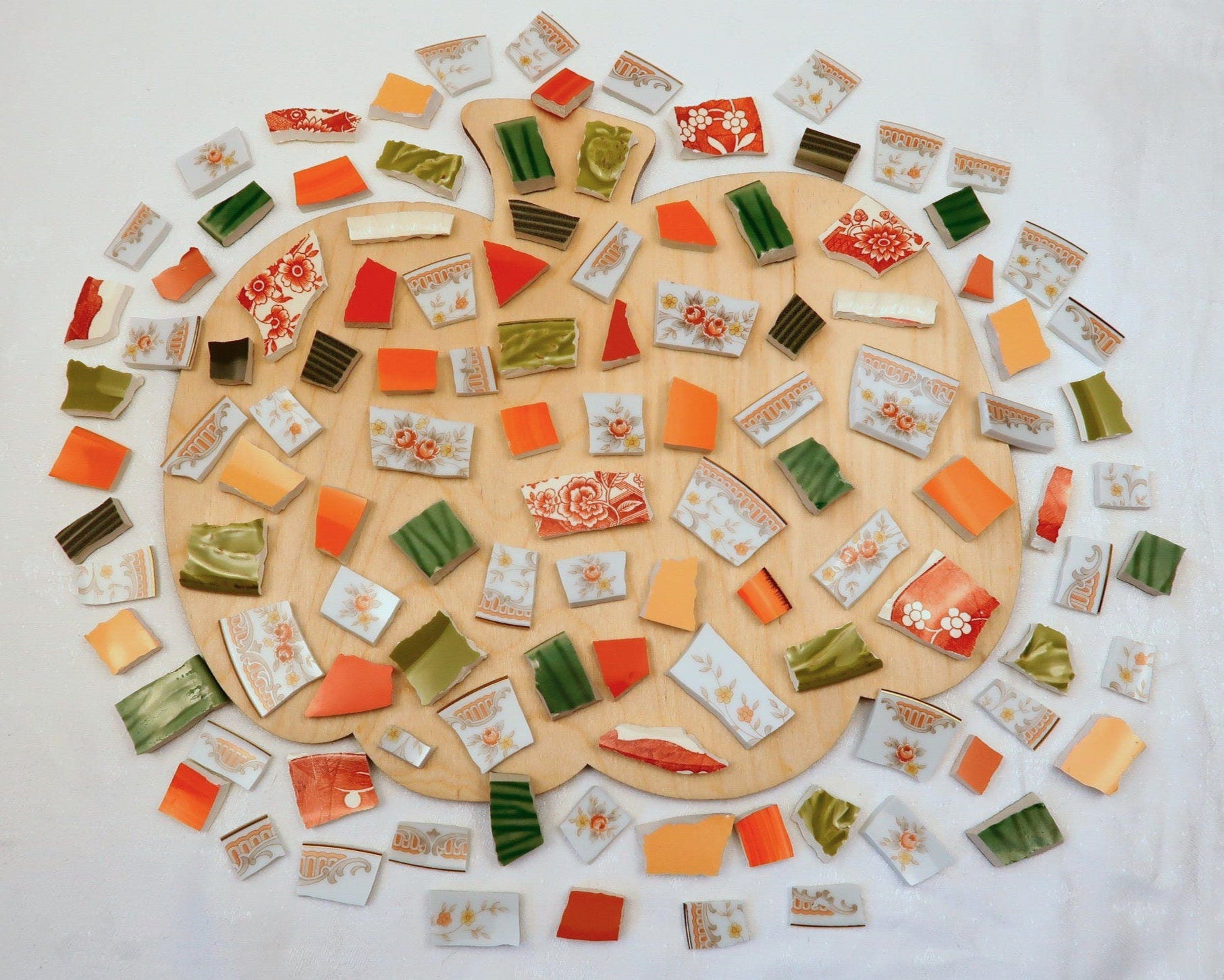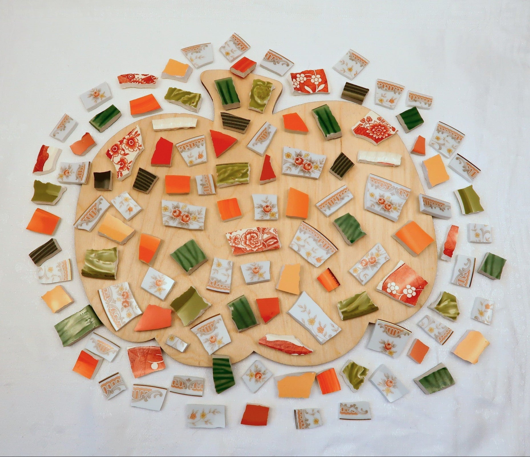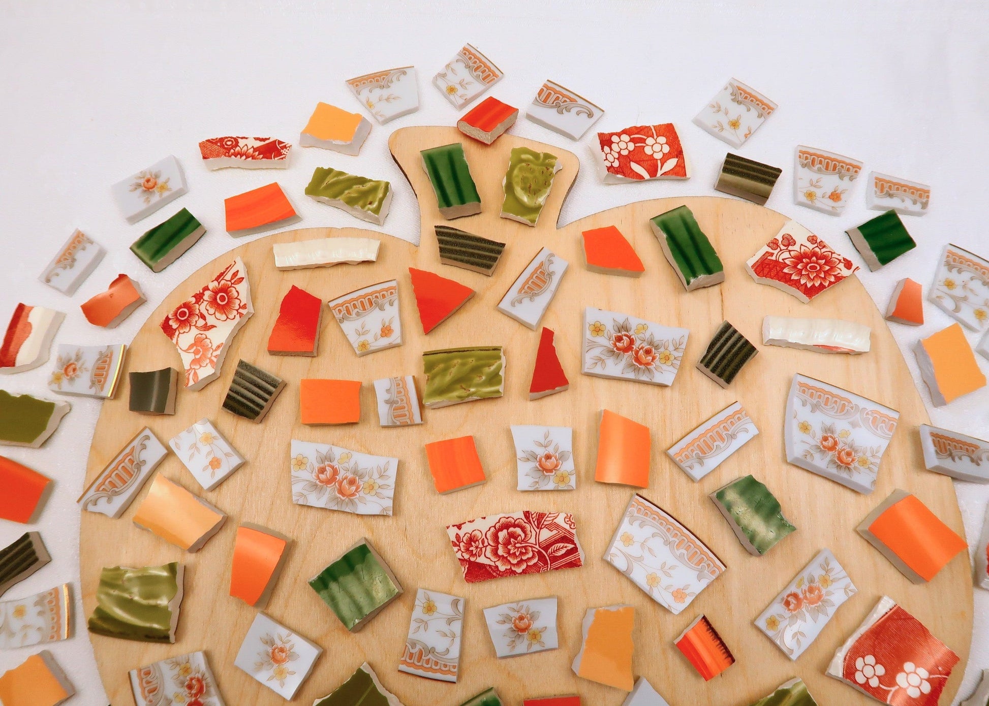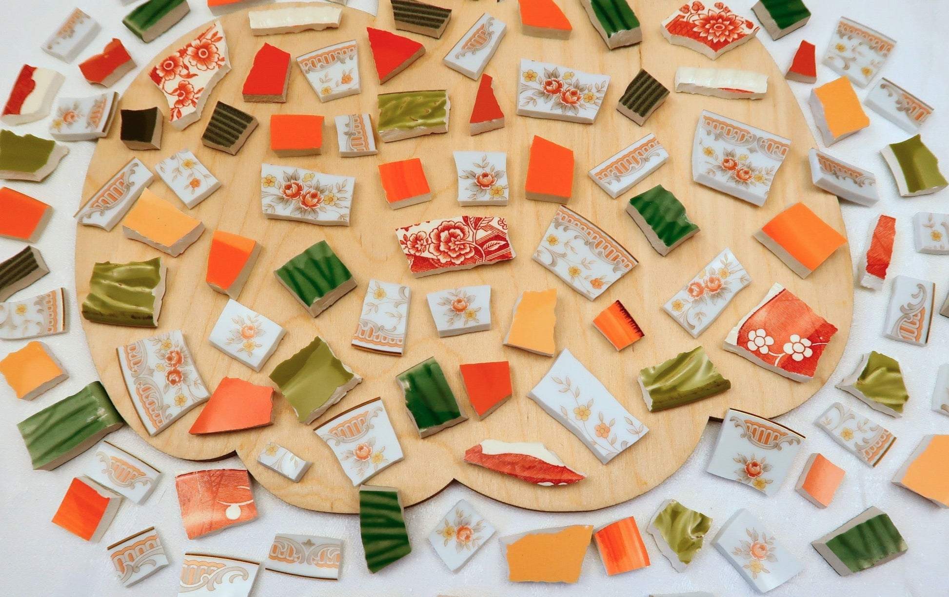 - A hand-selected assortment of broken china Poetic Mosaic tiles