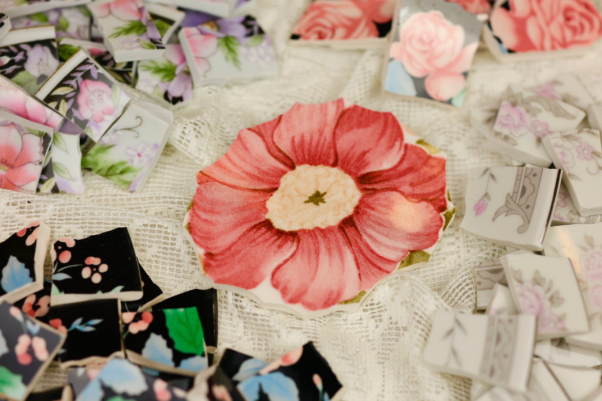- A hand-selected assortment of broken china Poetic Mosaic tiles