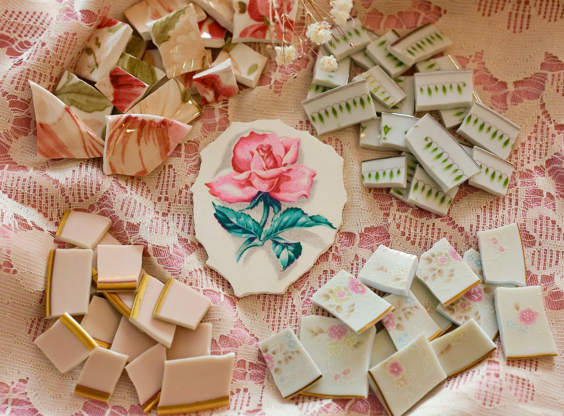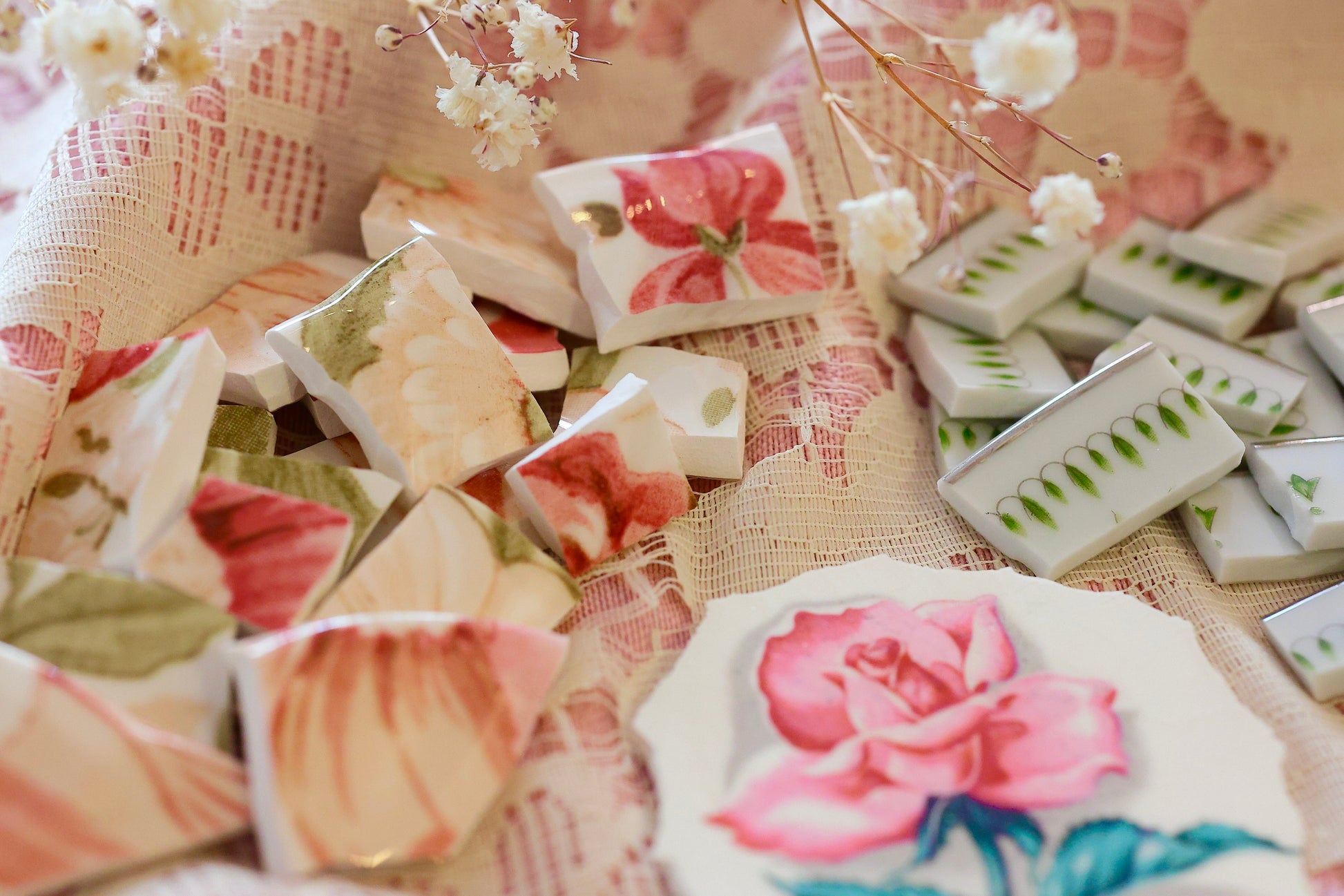 - A hand-selected assortment of broken china Poetic Mosaic tiles