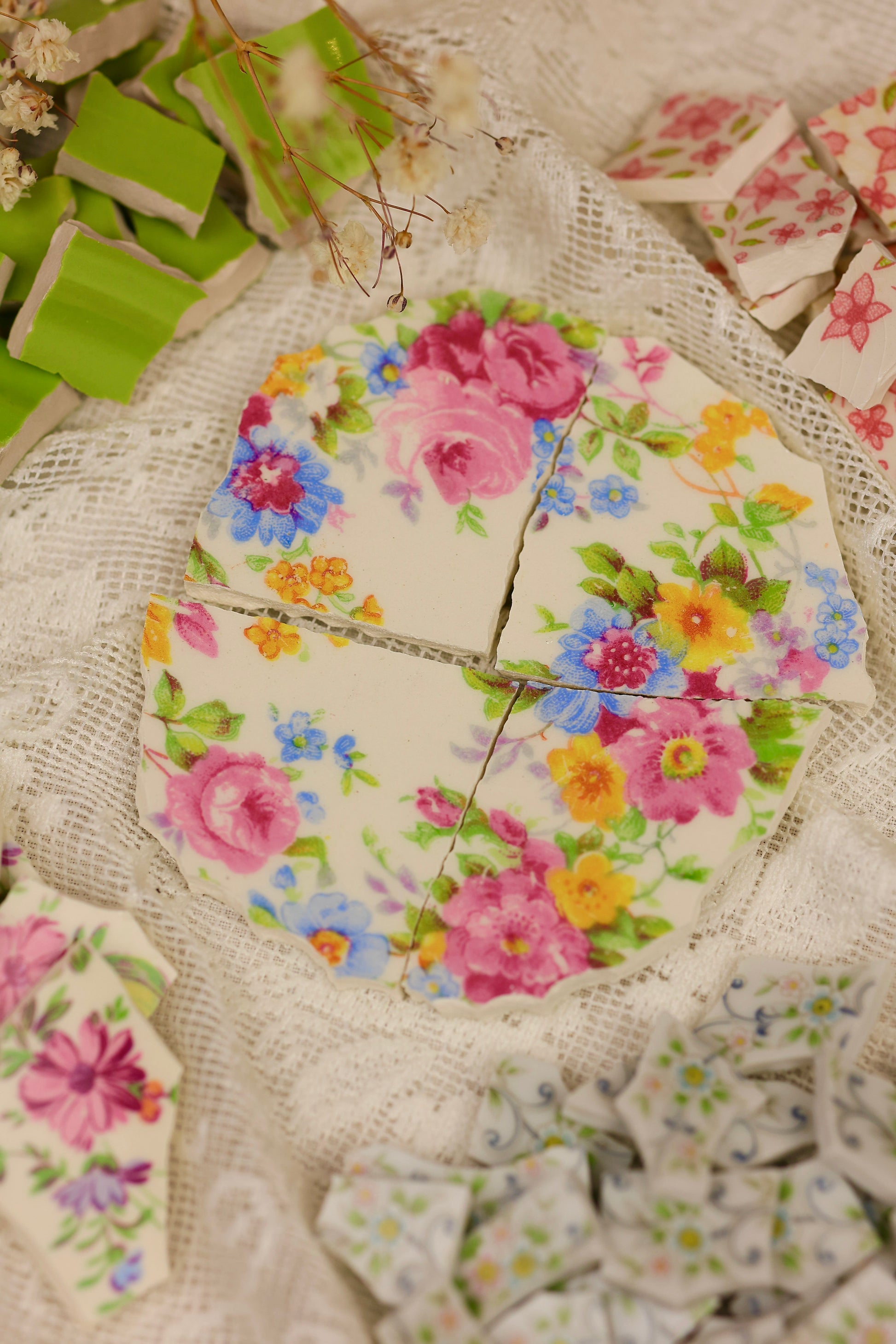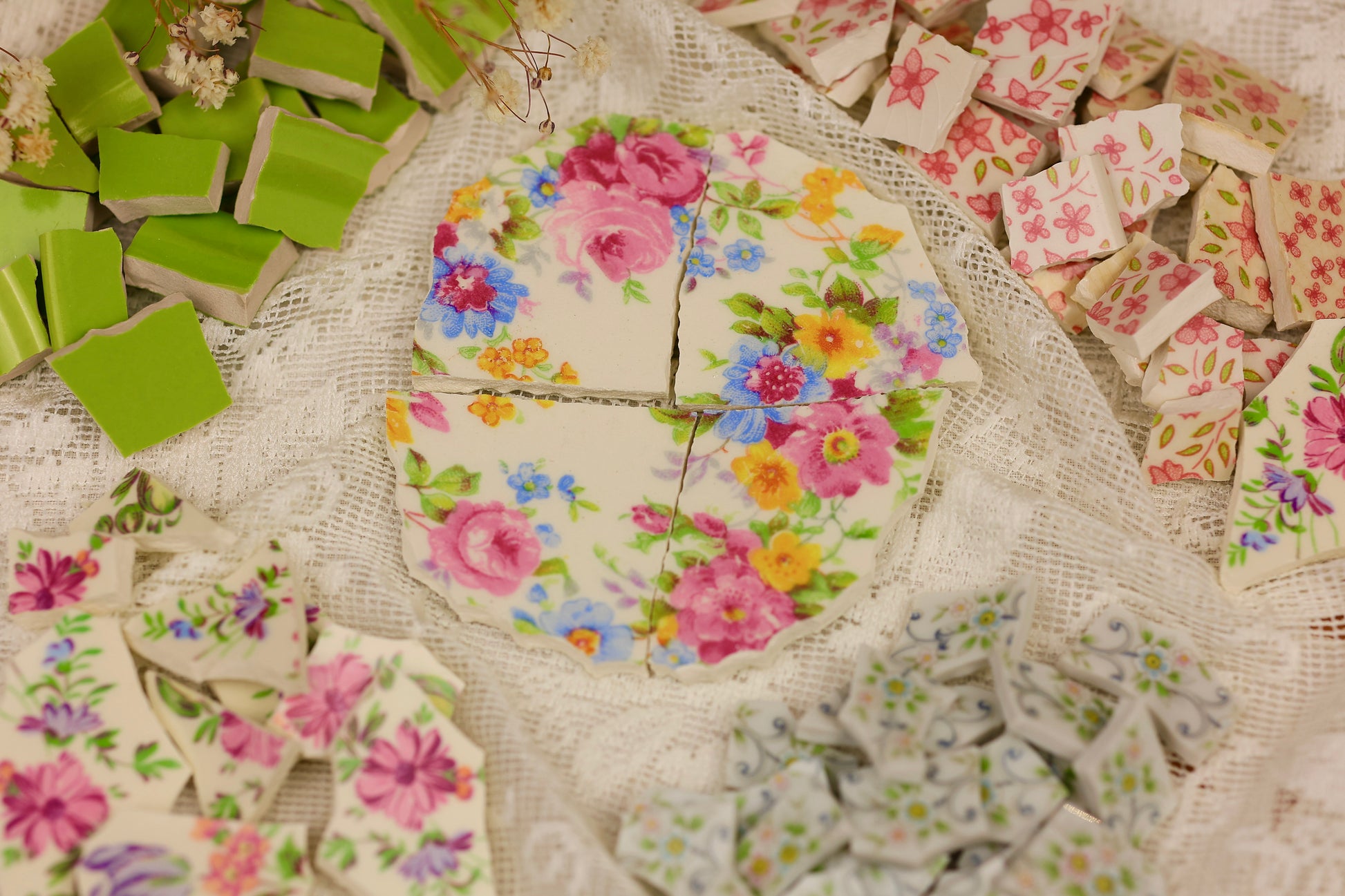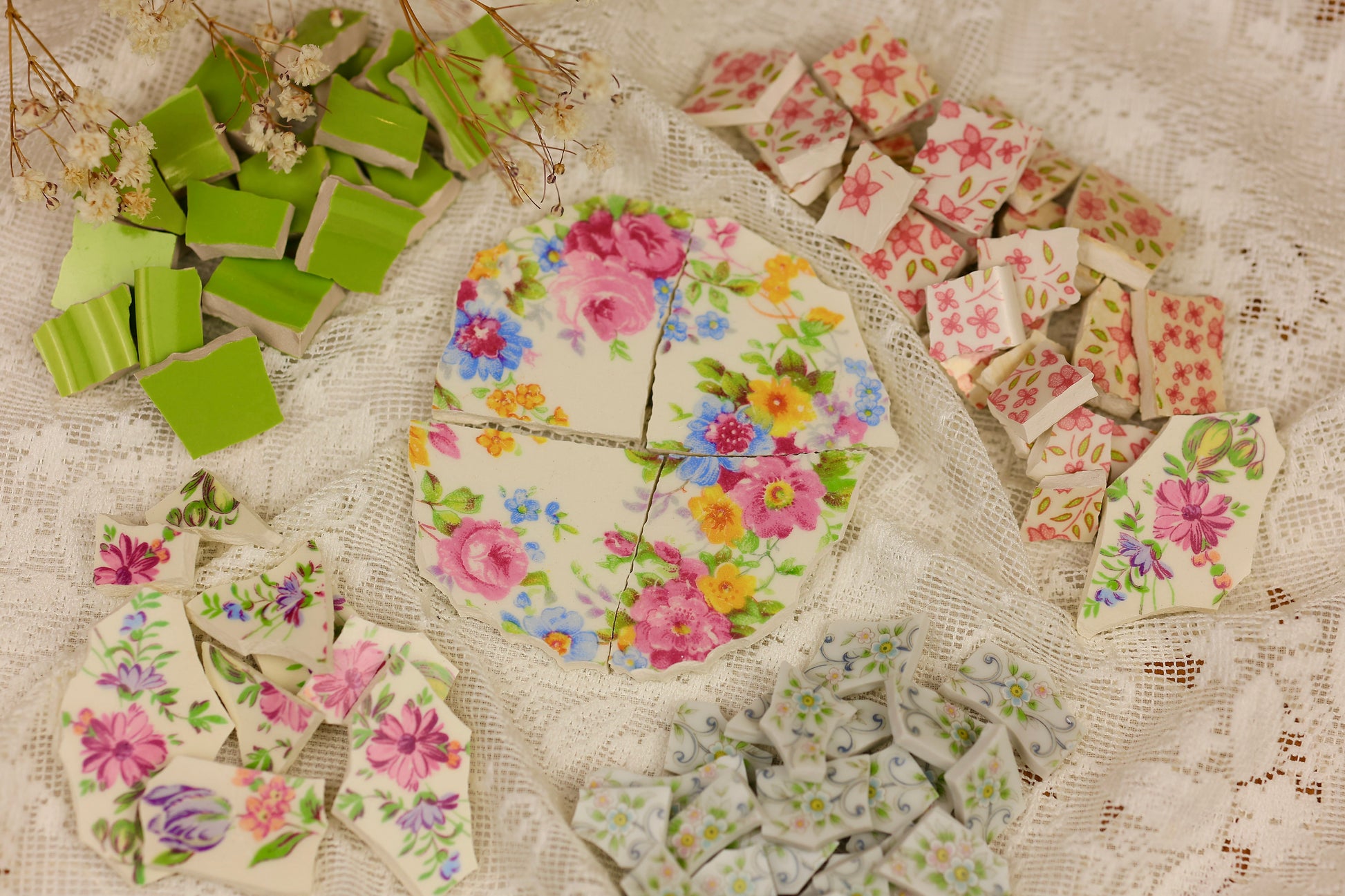- A hand-selected assortment of broken china Poetic Mosaic tiles