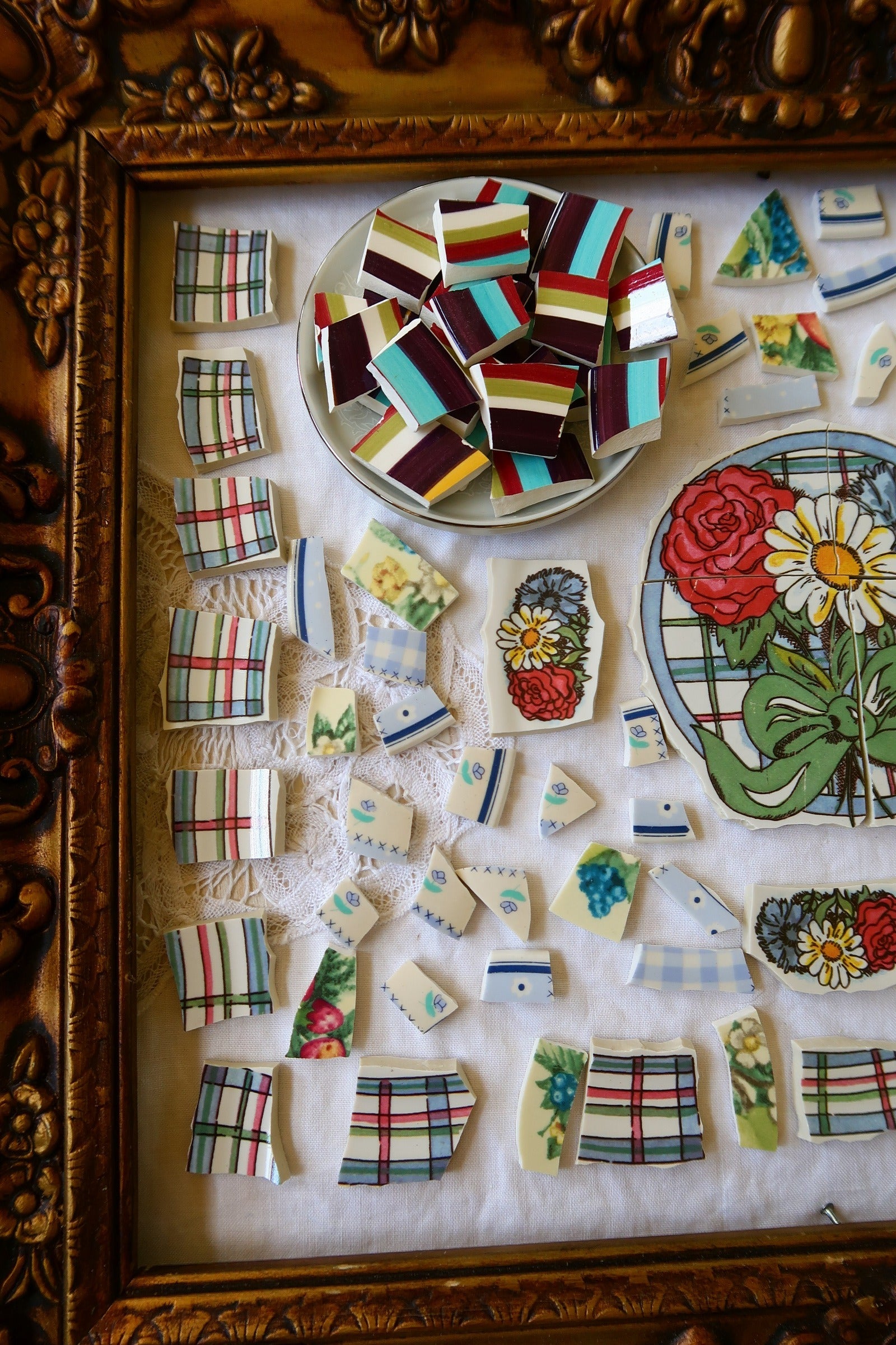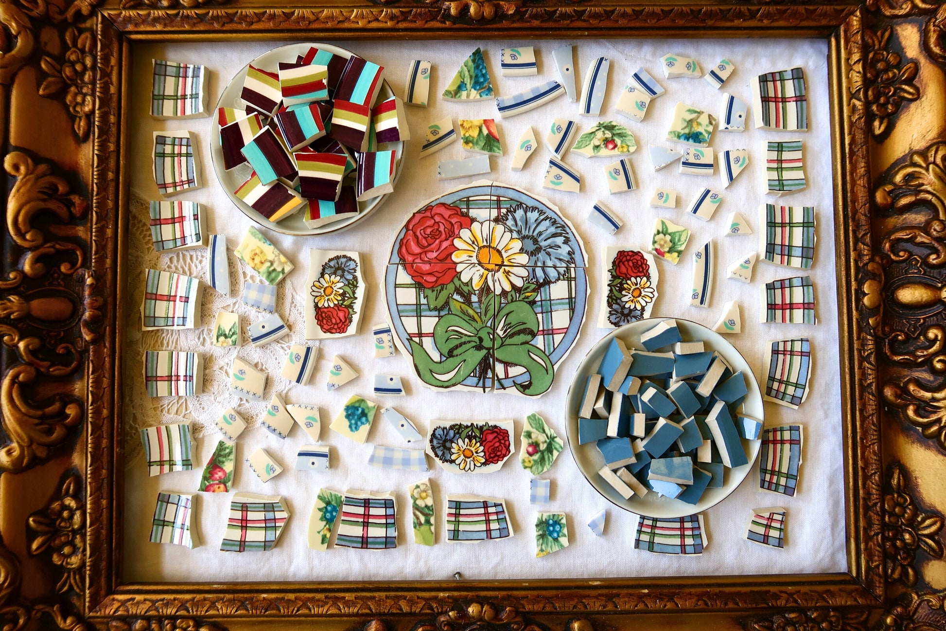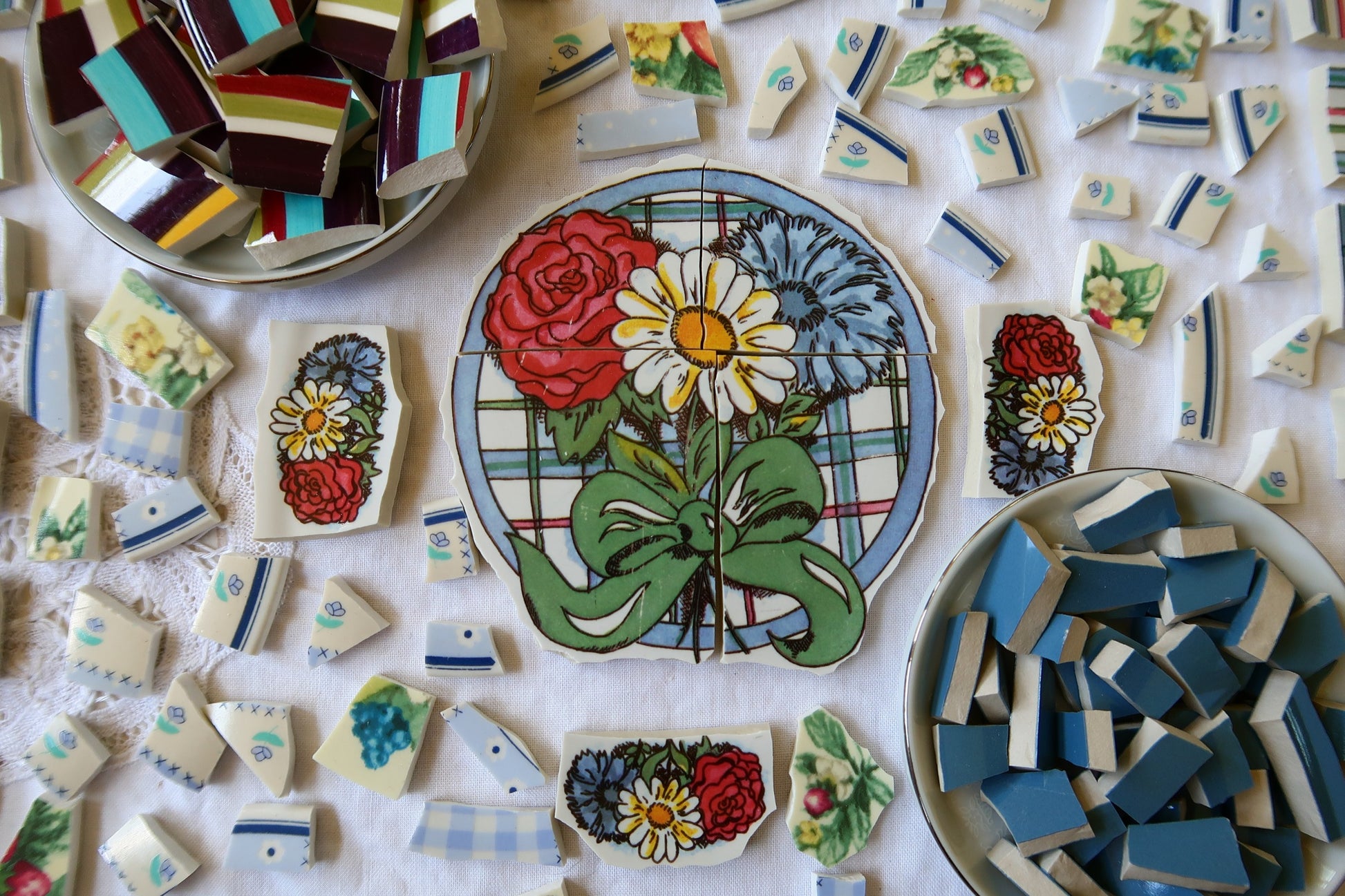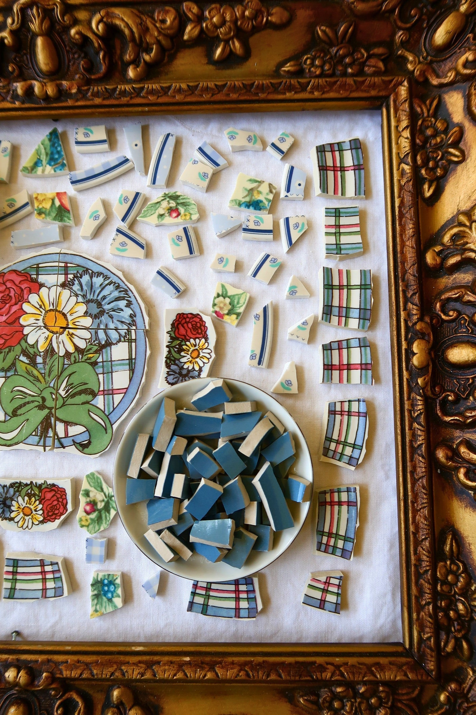 - A hand-selected assortment of broken china Poetic Mosaic tiles
