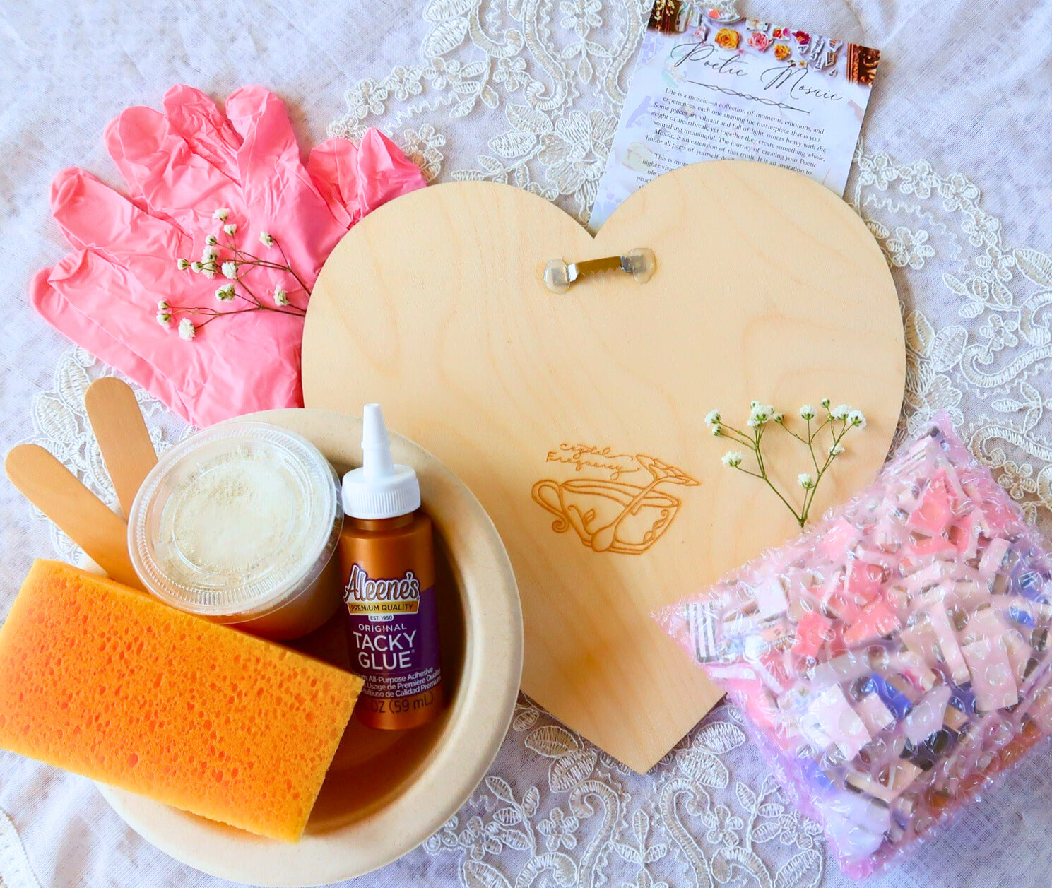 Each kit contains glass dust and glass shards, which may pose a risk of injury if not handled with care. It is the responsibility of each individual to use all materials in a cautious and safe manner. By purchasing this kit, you acknowledge that we are not liable for any injuries or misuse of the materials provided. Please take proper precautions while working with your Poetic Mosaic.