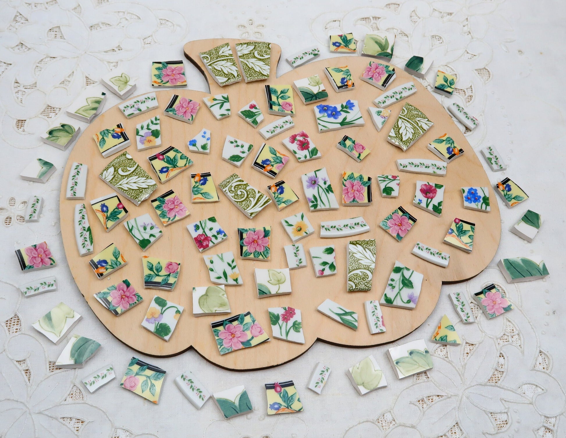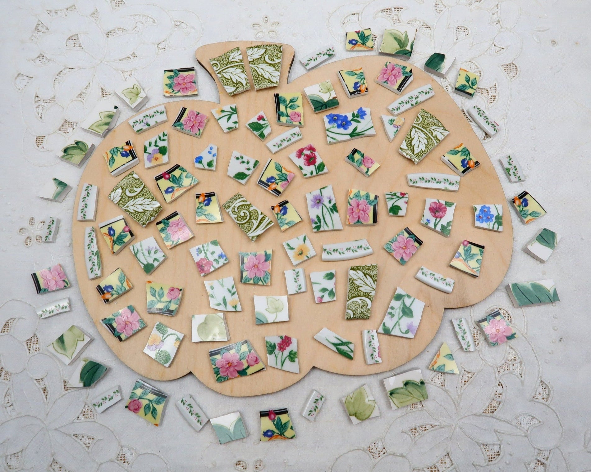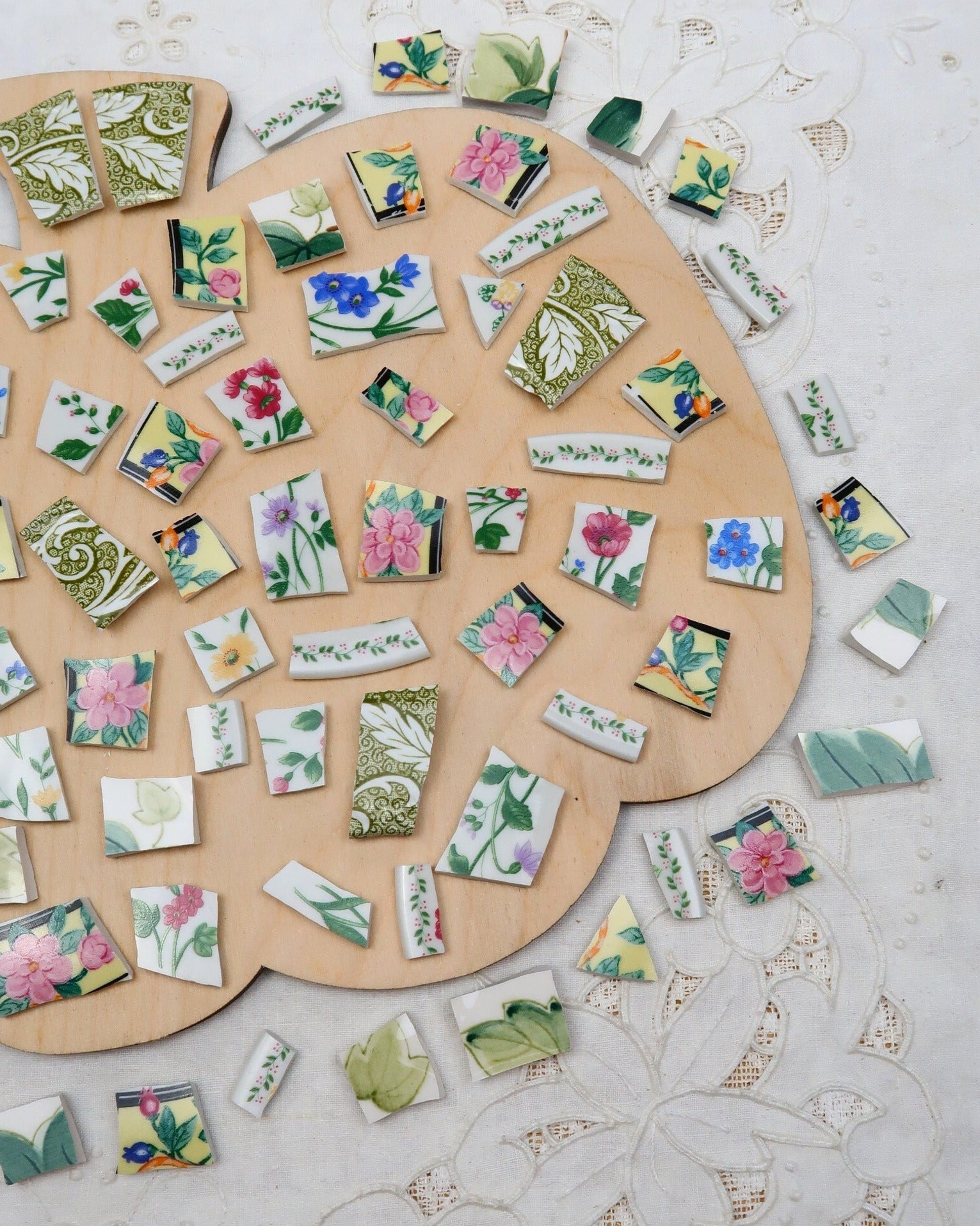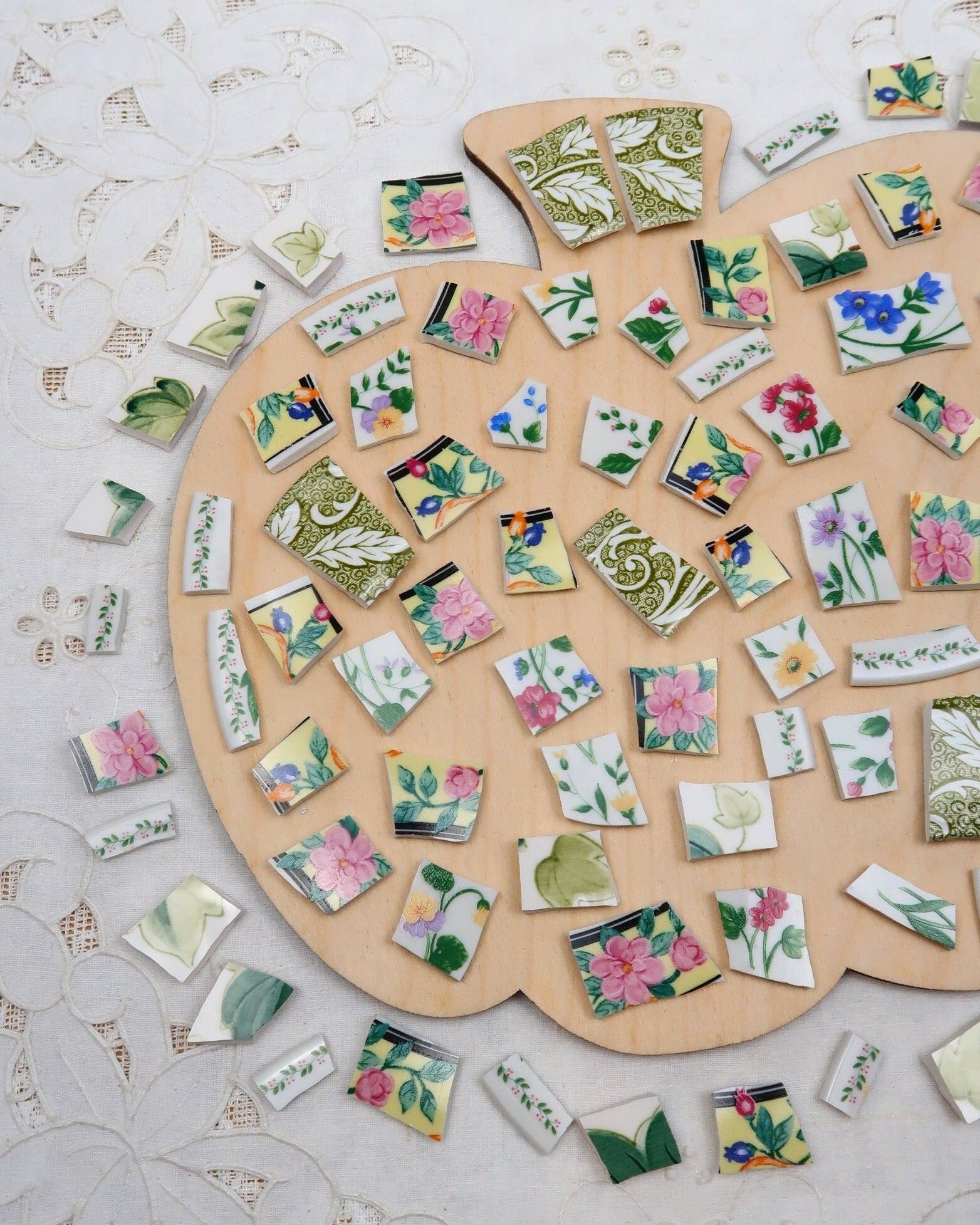 - A hand-selected assortment of broken china Poetic Mosaic tiles