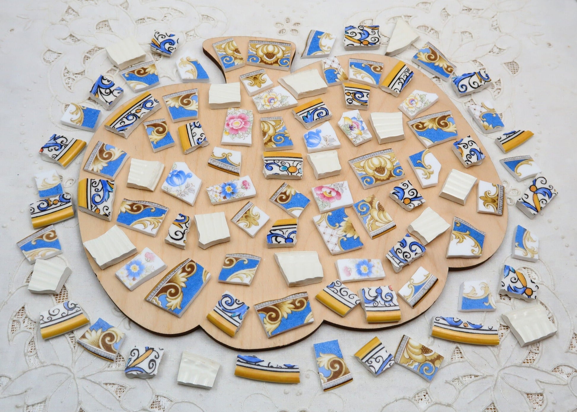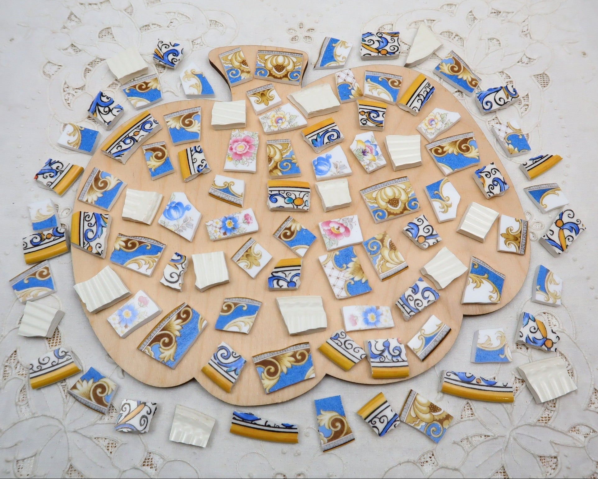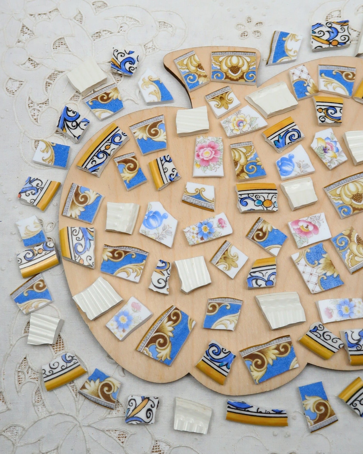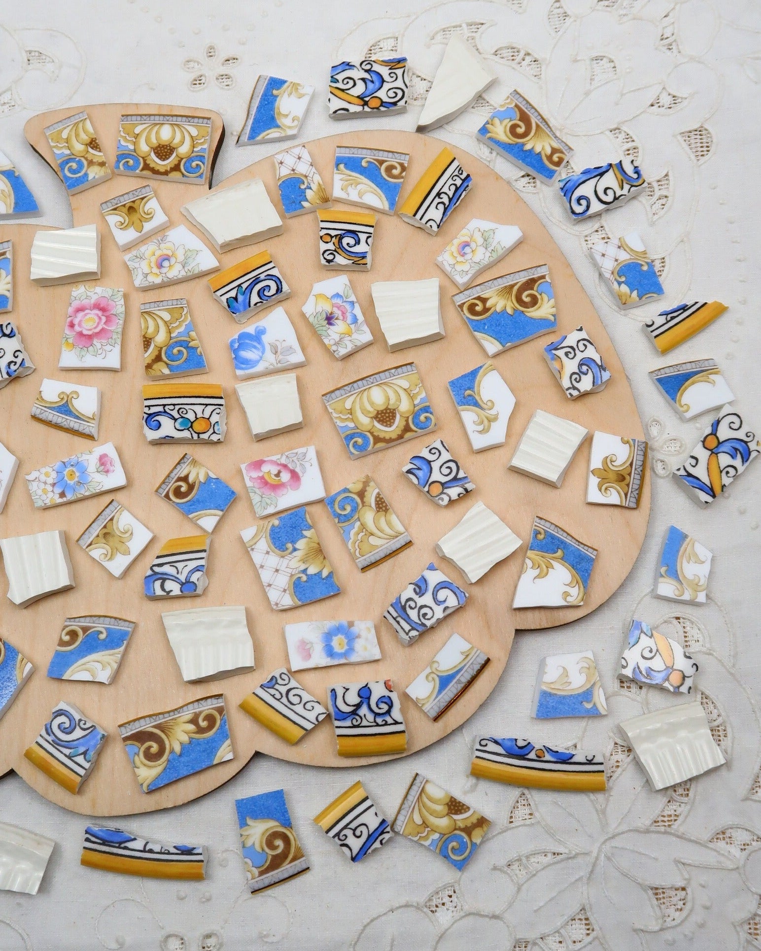 - A hand-selected assortment of broken china Poetic Mosaic tiles