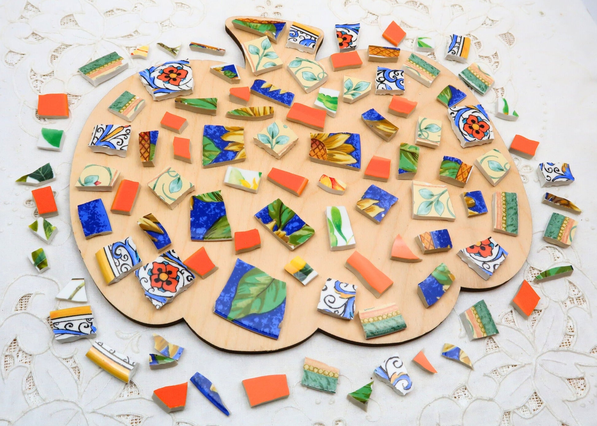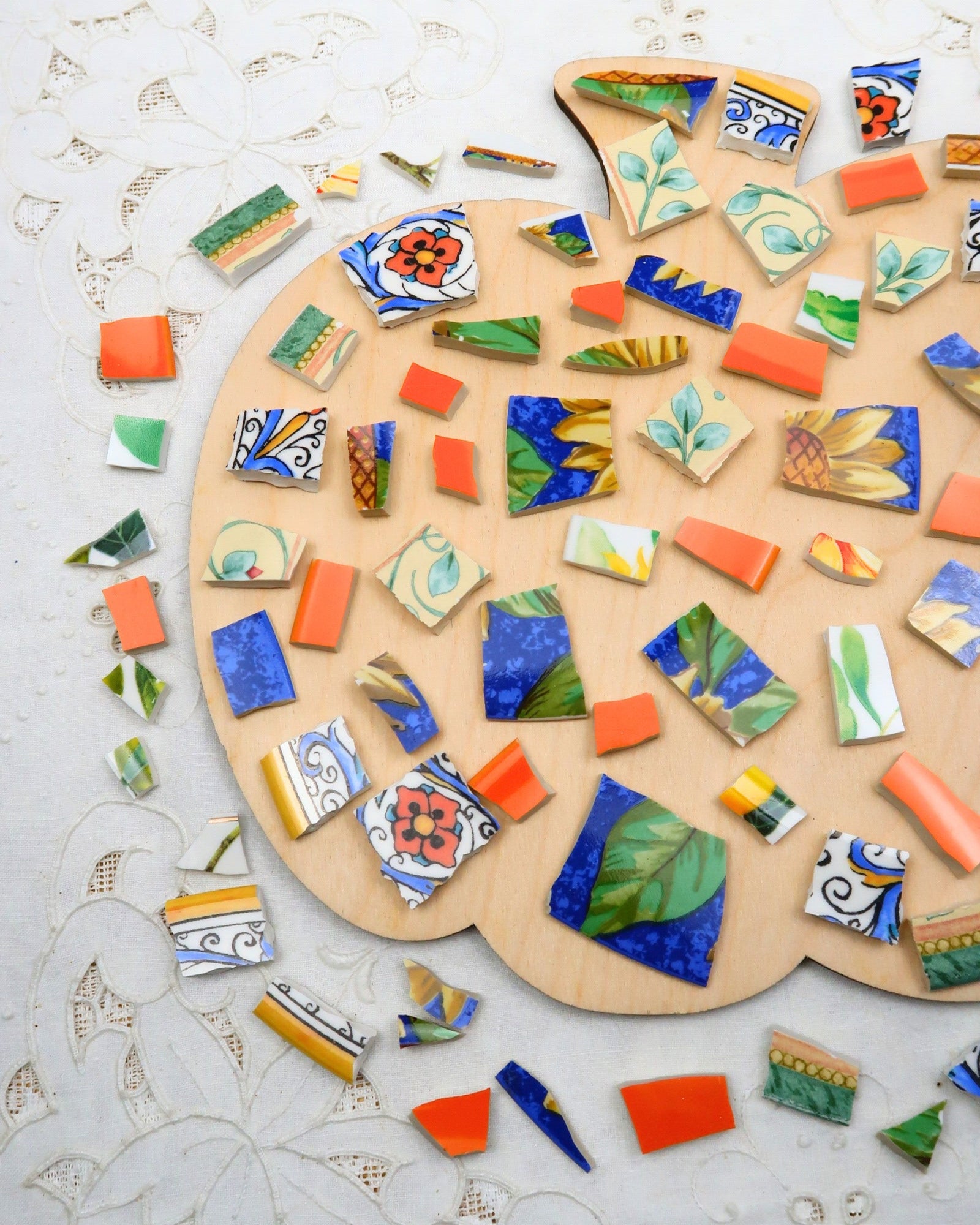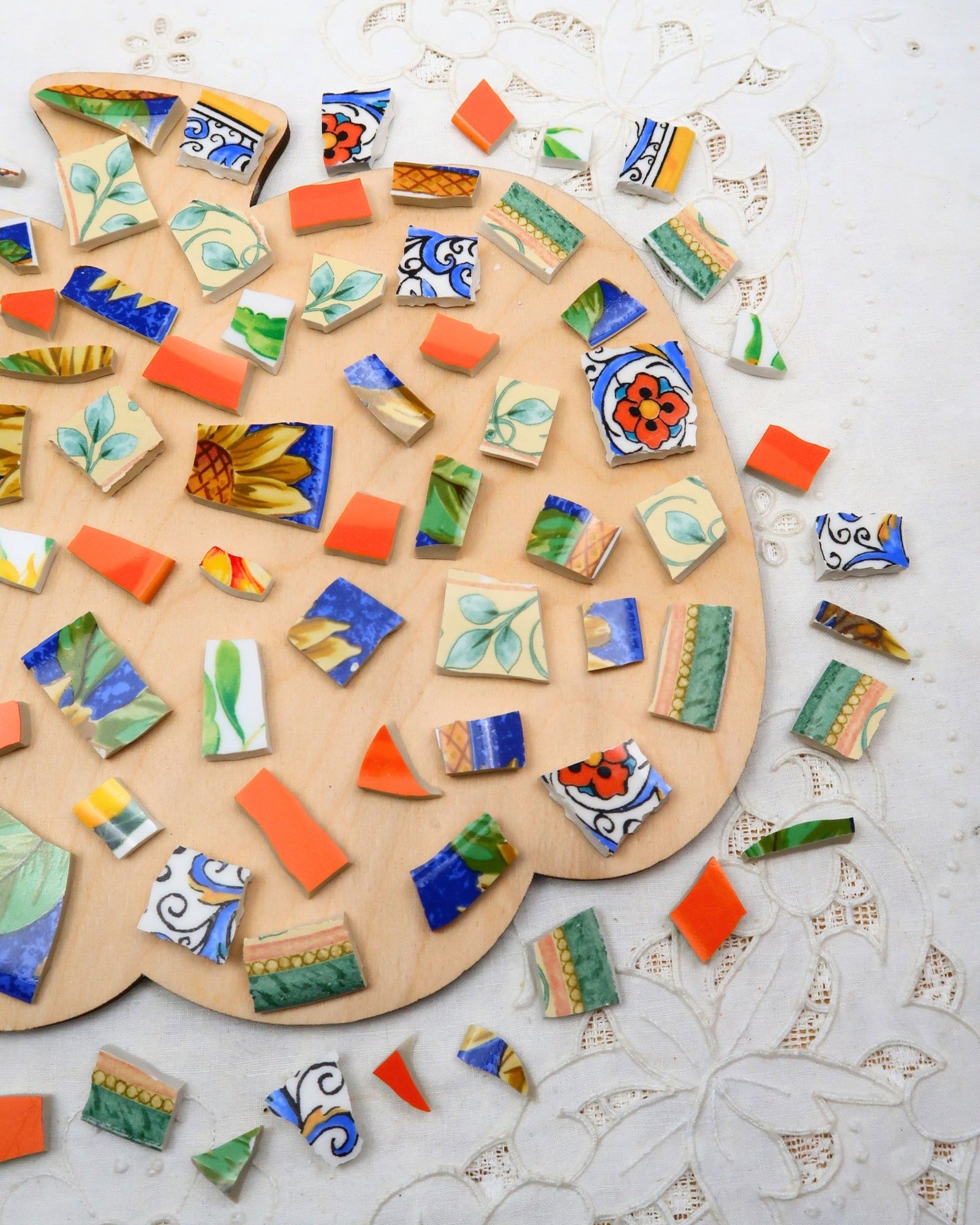 - A hand-selected assortment of broken china Poetic Mosaic tiles
