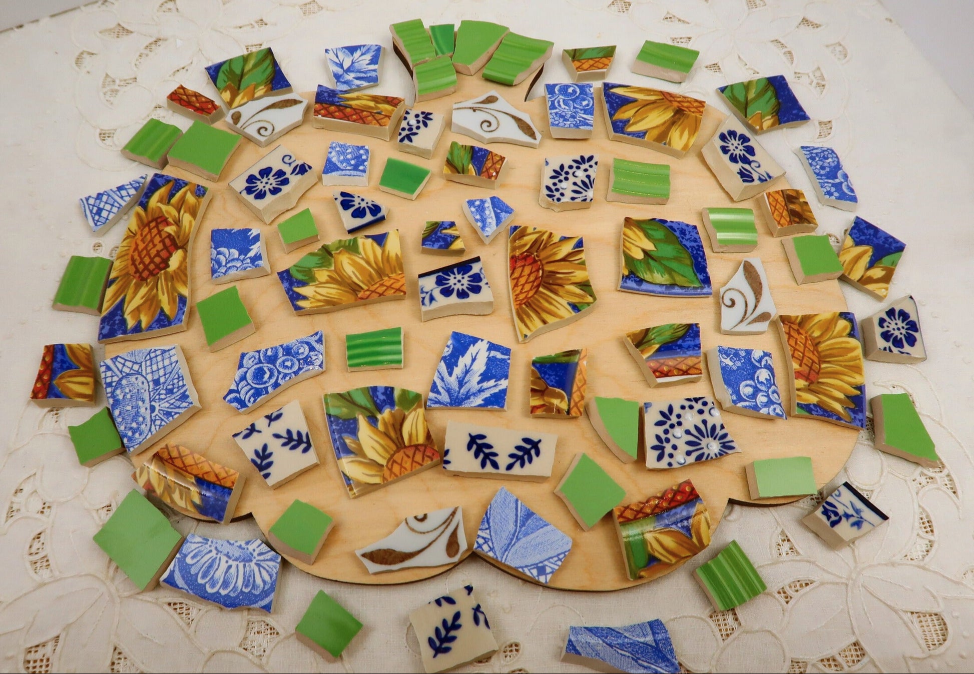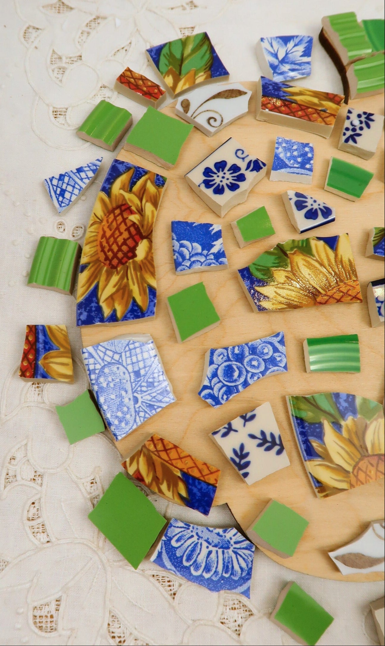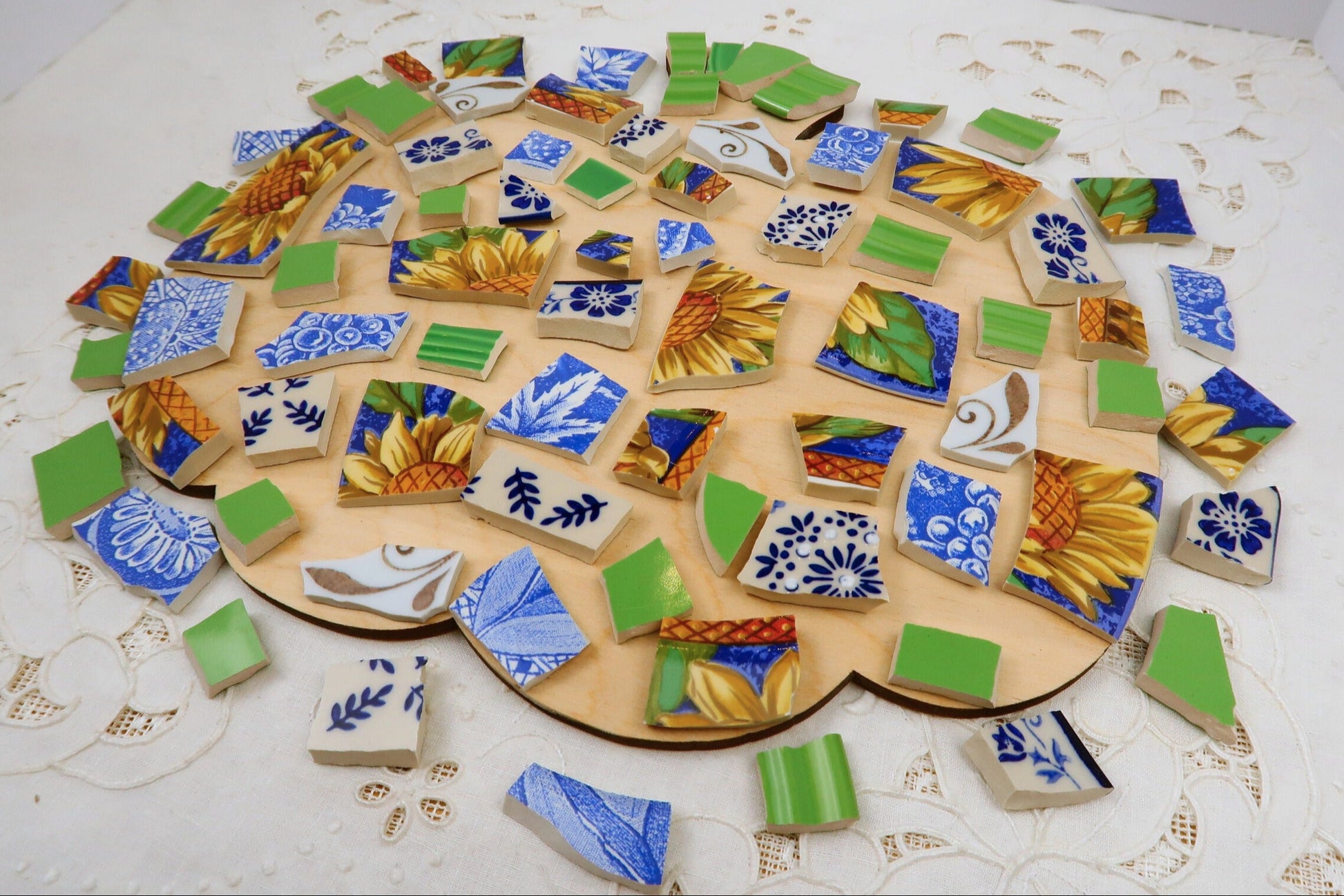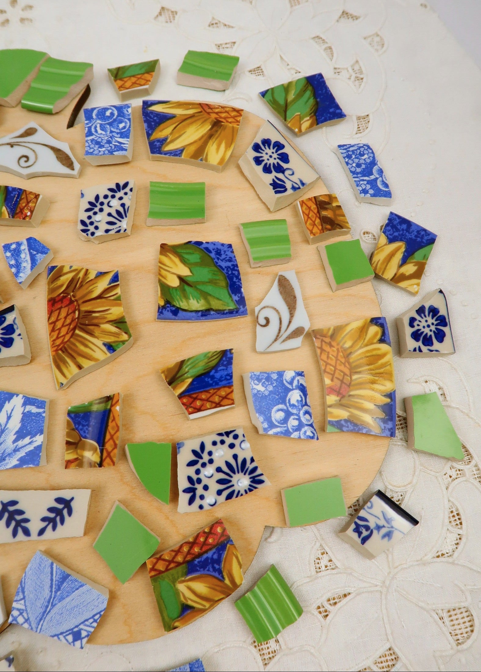 - A hand-selected assortment of broken china Poetic Mosaic tiles