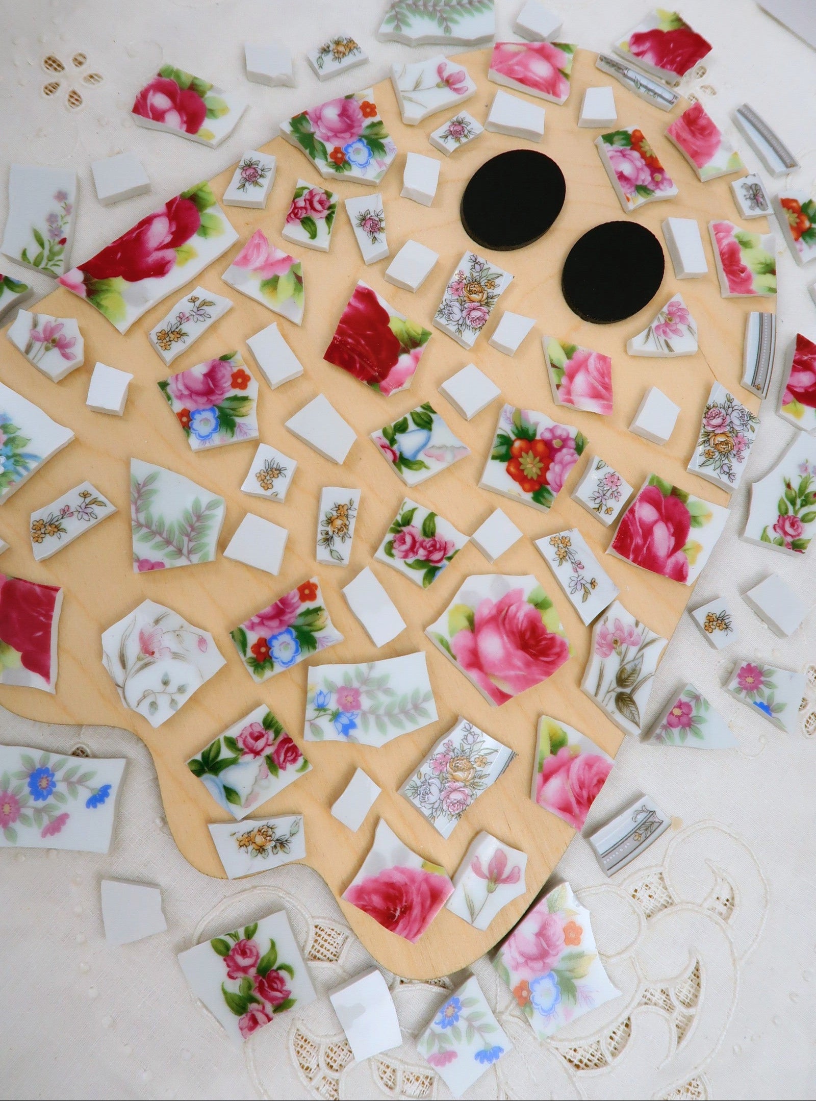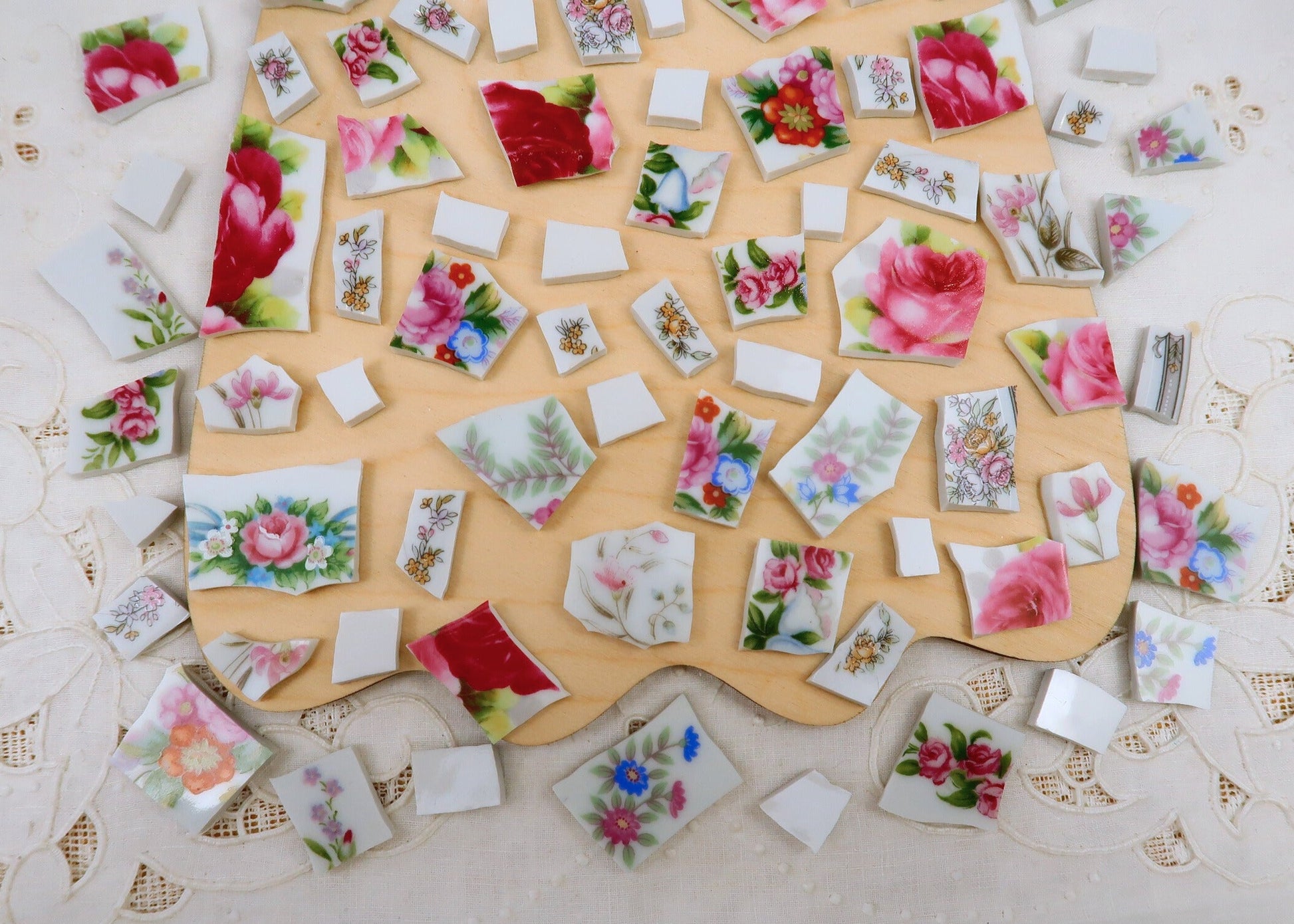 - A hand-selected assortment of broken china Poetic Mosaic tiles