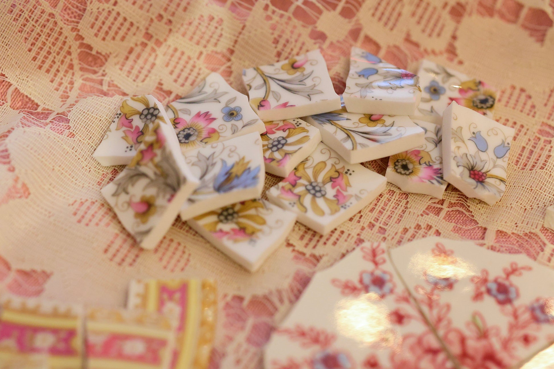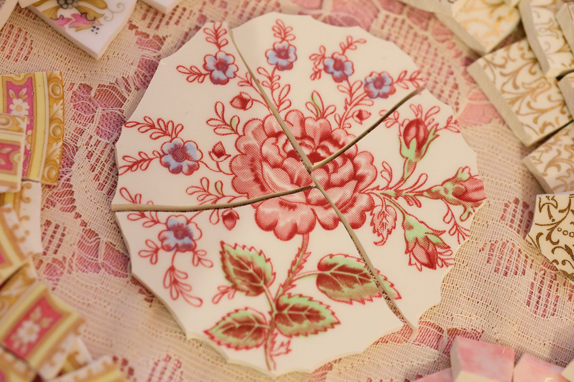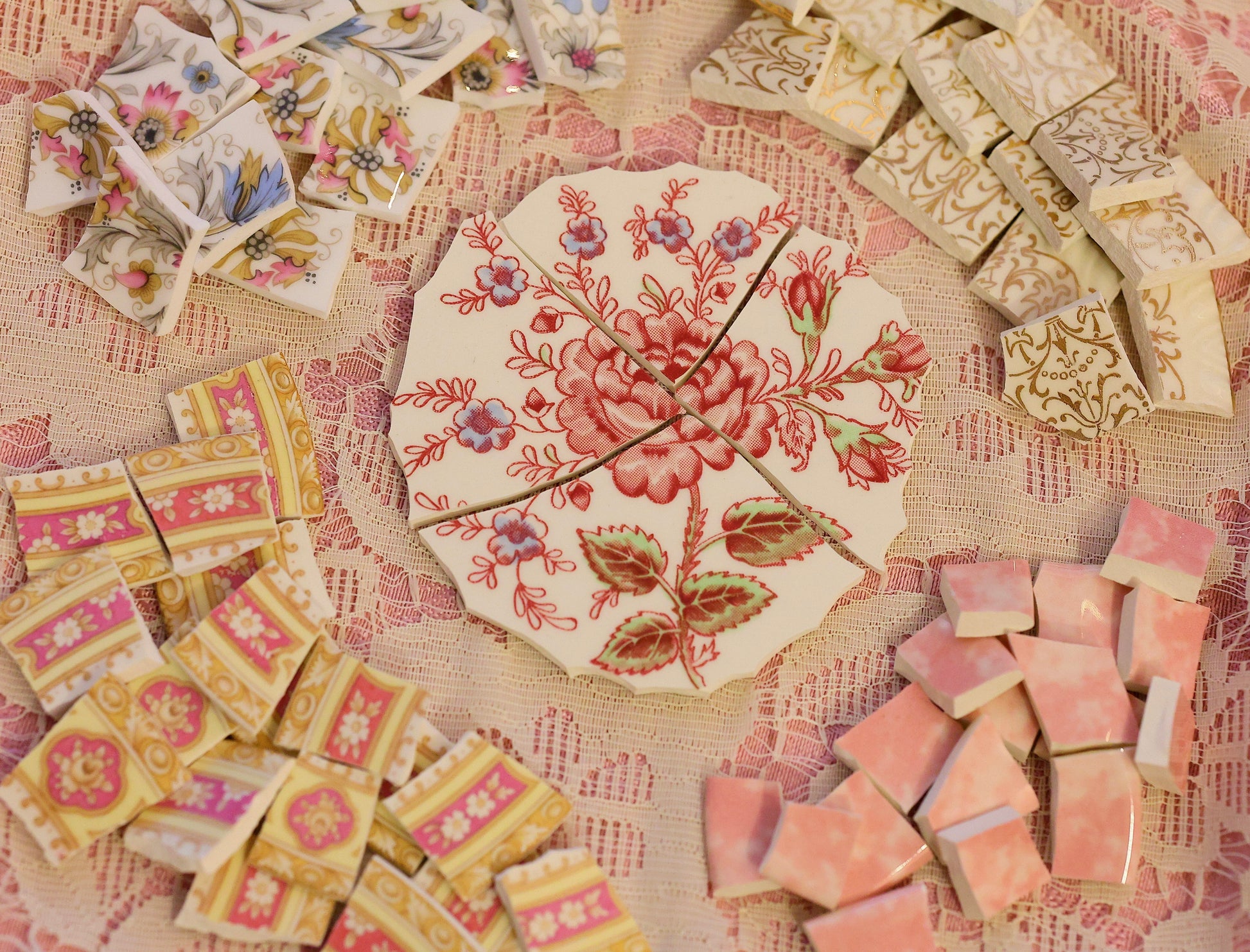 - A hand-selected assortment of broken china Poetic Mosaic tiles