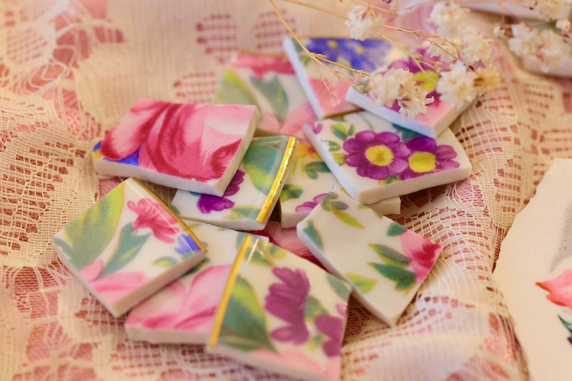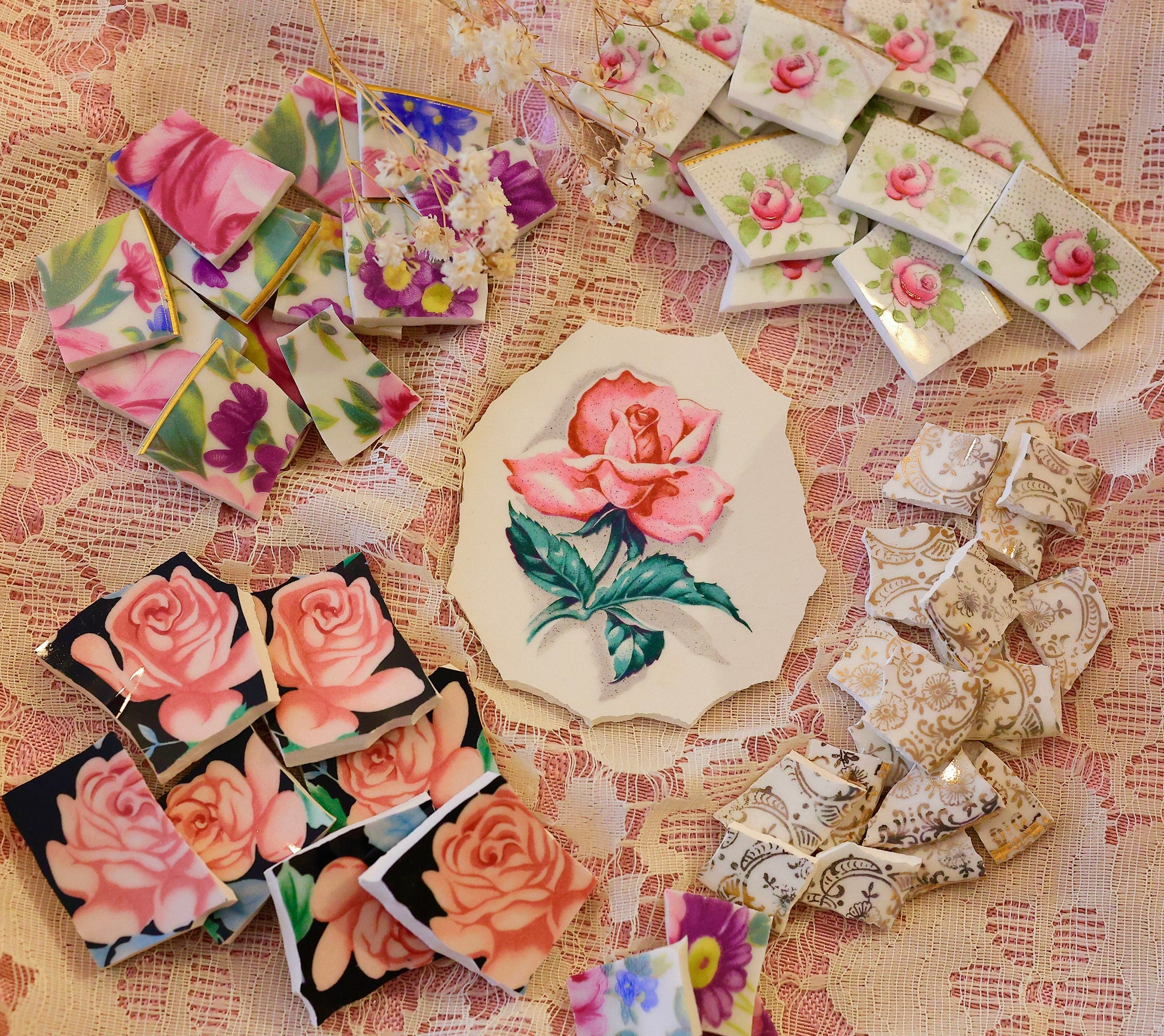 - A hand-selected assortment of broken china Poetic Mosaic tiles